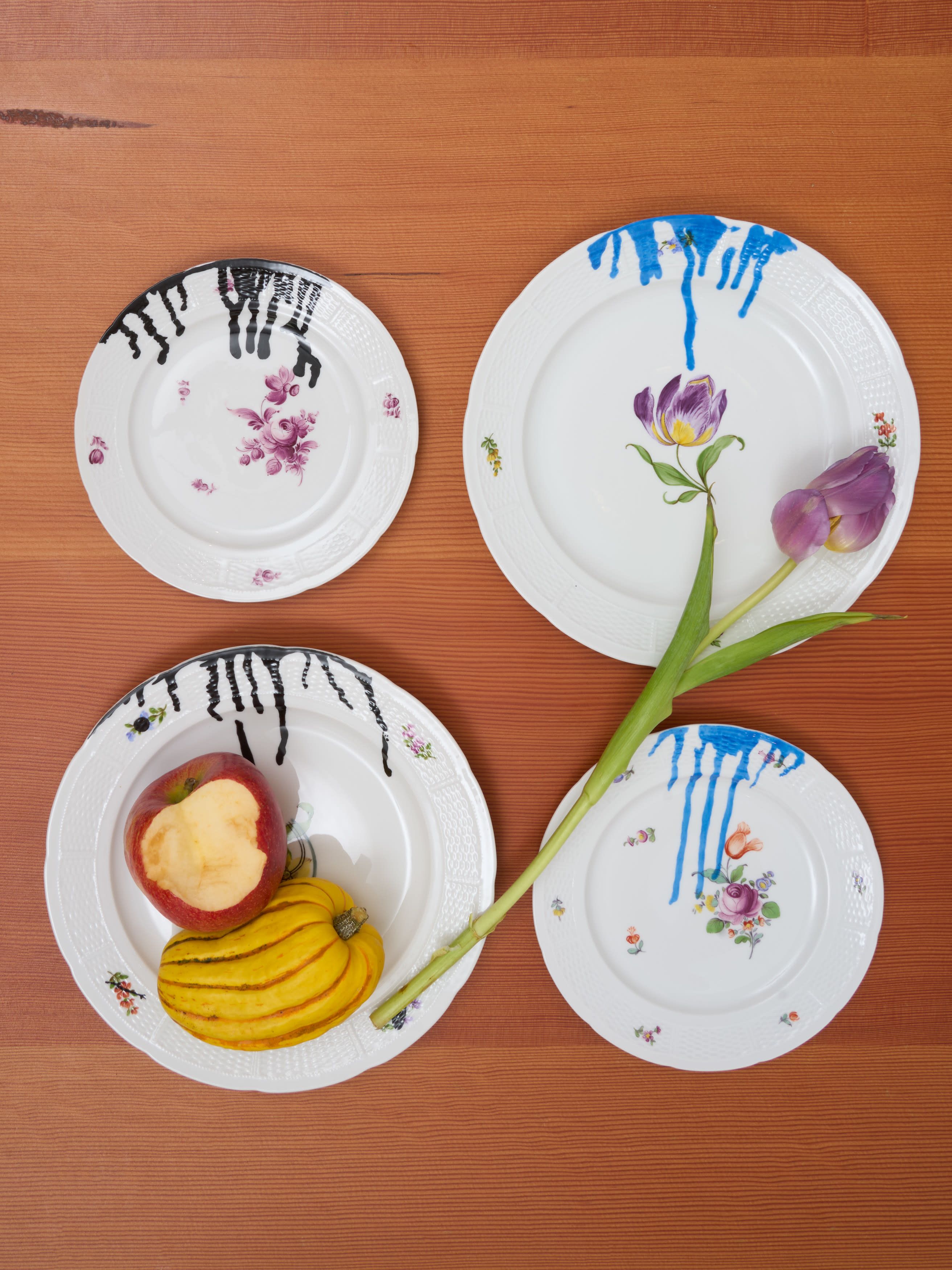 12 dinner plates 24.5cm (6 black, 6 blue), 12 Breakfast plates (6 black, 6 blue), 2 round serving bowls (1 black, 1 gold)
