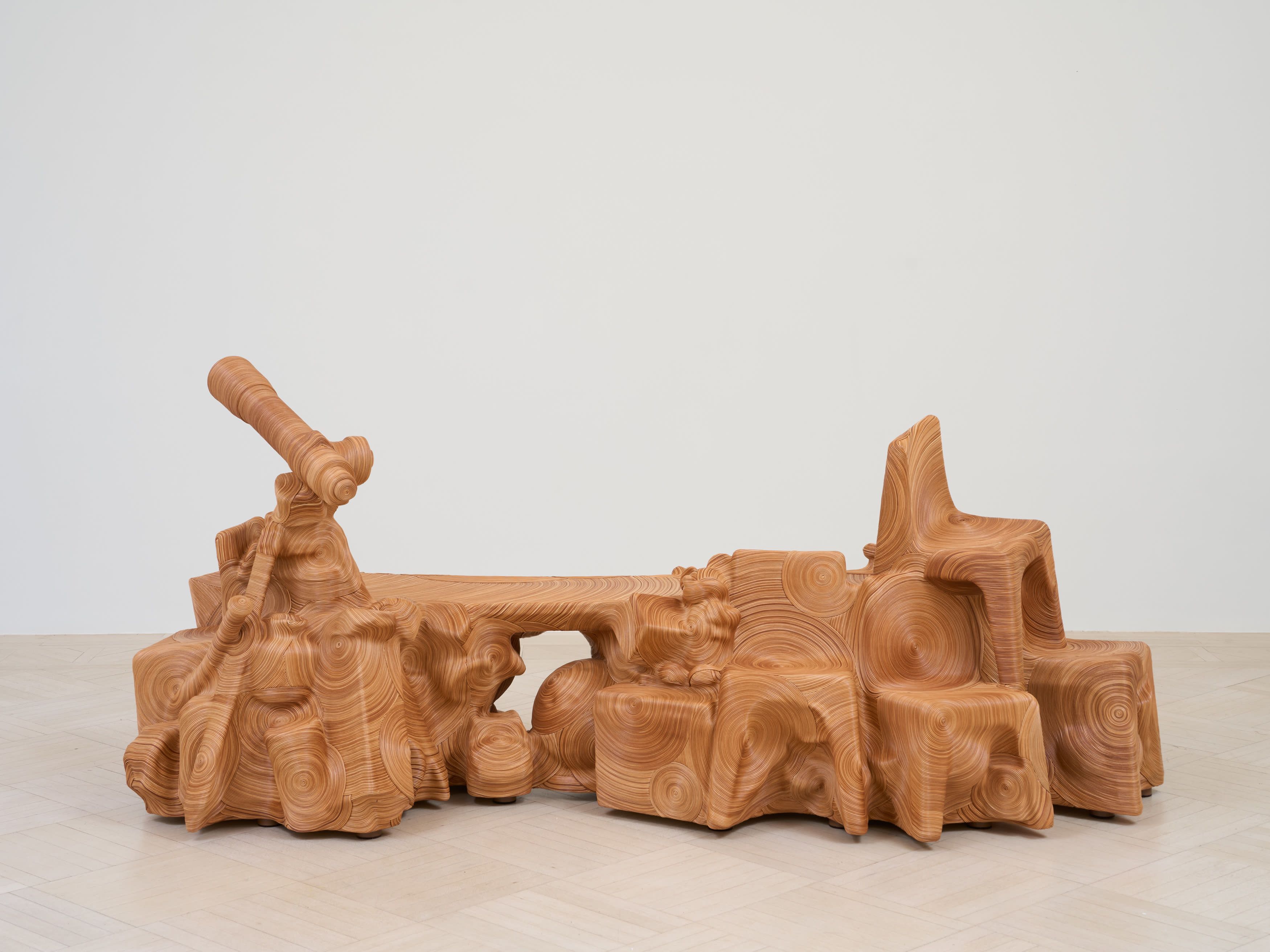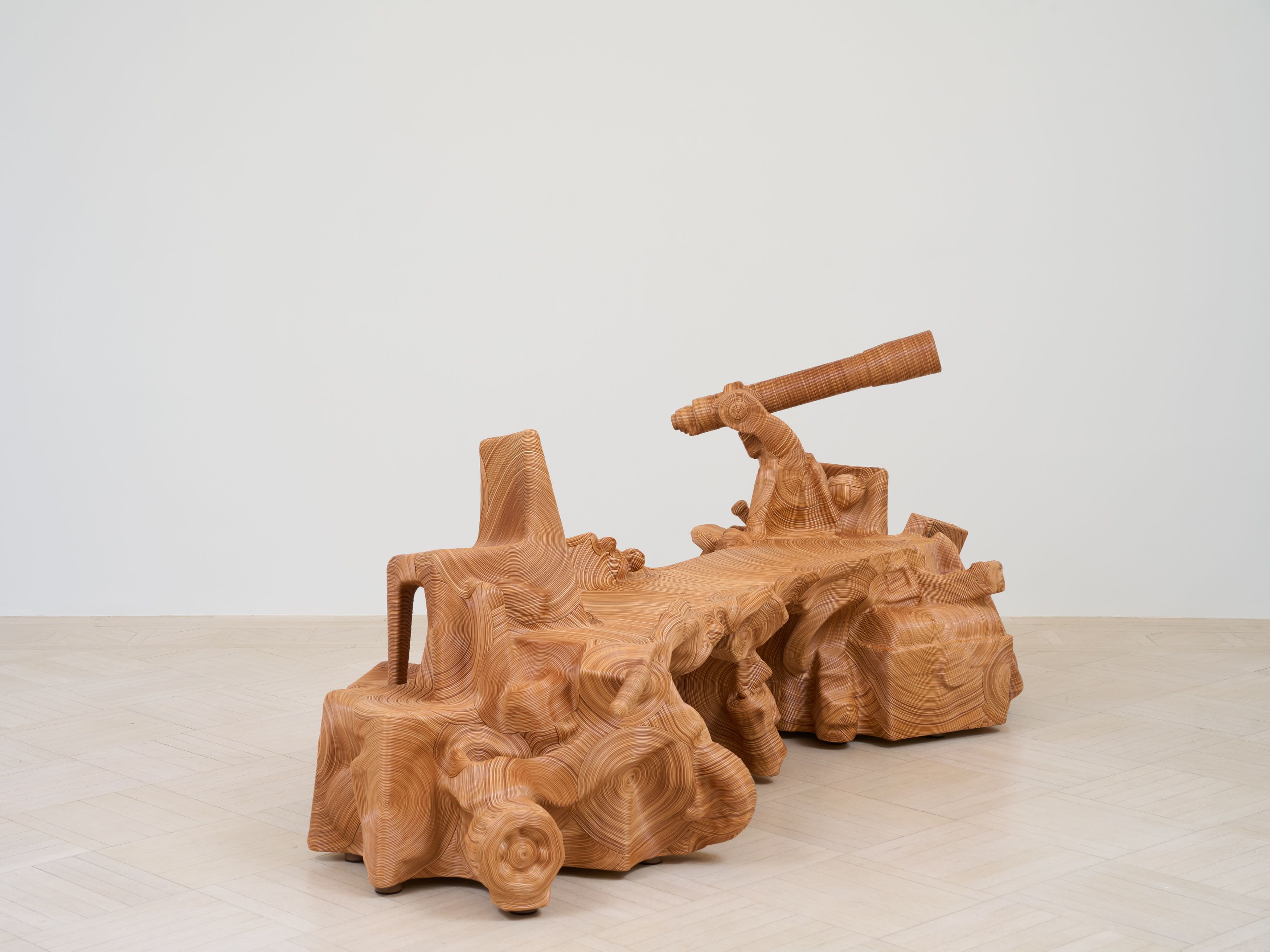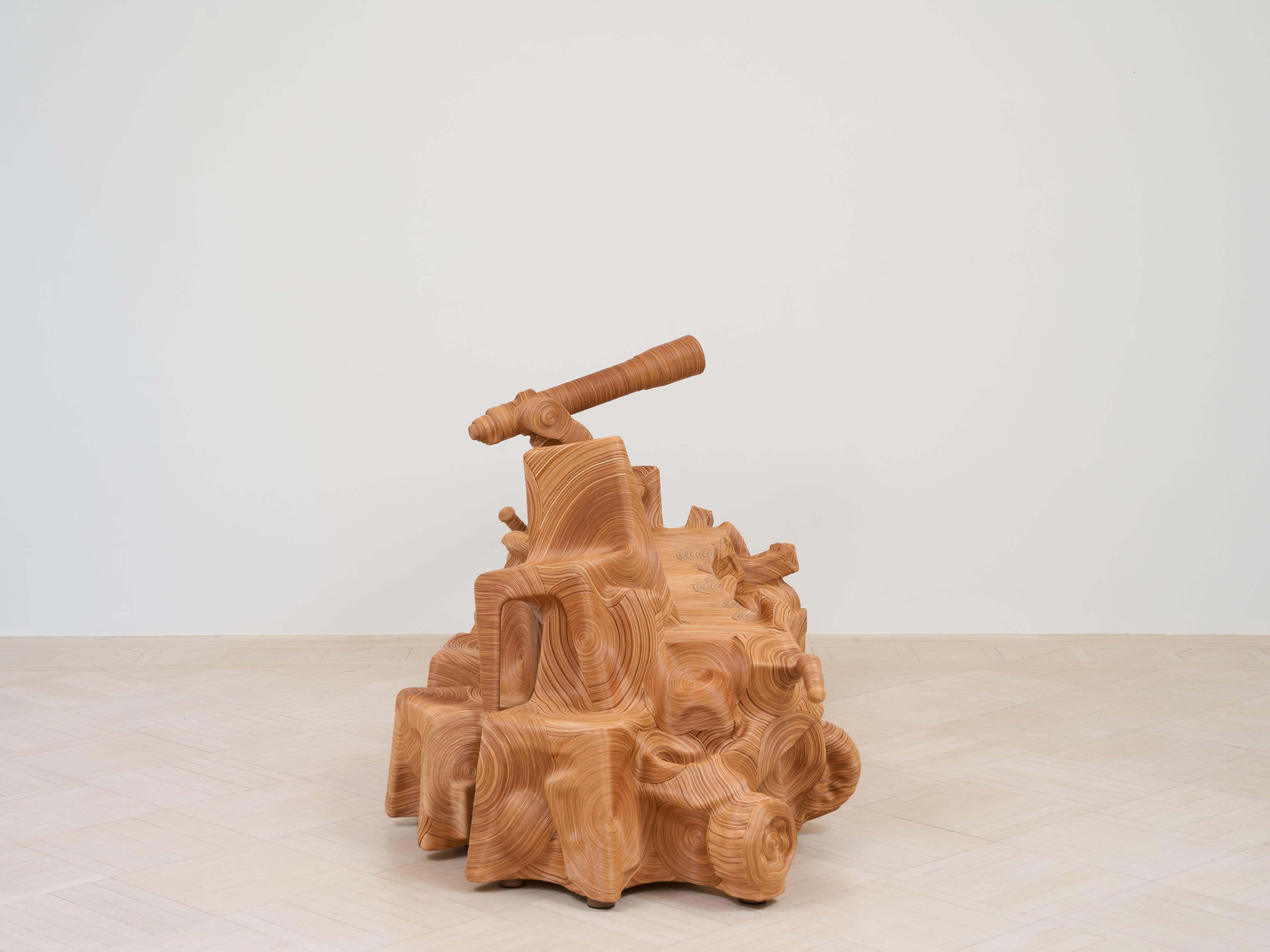 Plastic, metal and wood objects (telescope on tripod, treasure chest, globe, toy car, imperial star destroyer tambourine, toddler chairs, bat mobile, Mickey Mouse figure, moka pot, hamster ball, file box, etc.), plywood base, adhesive, natural leather cord, leather finisher
