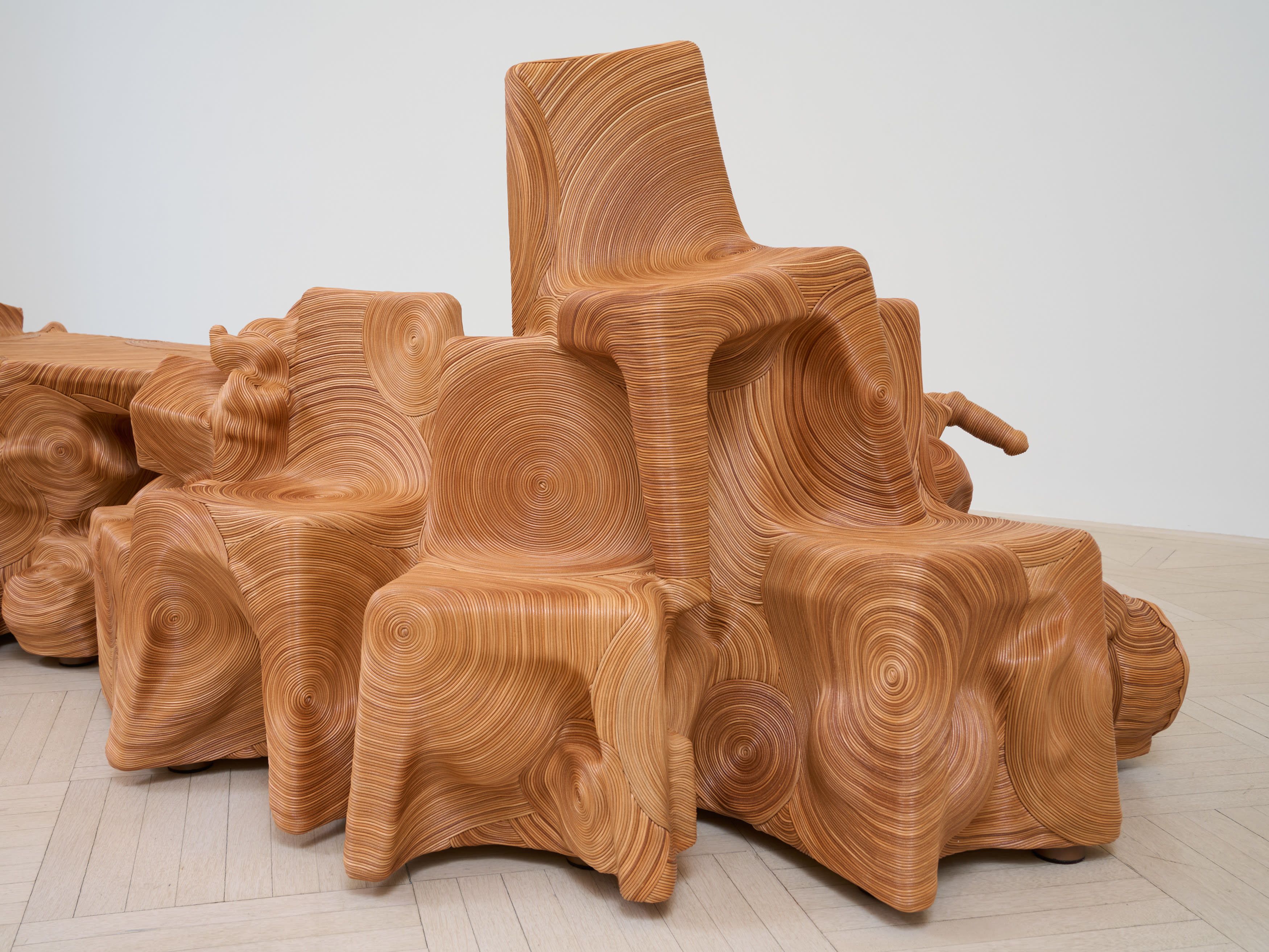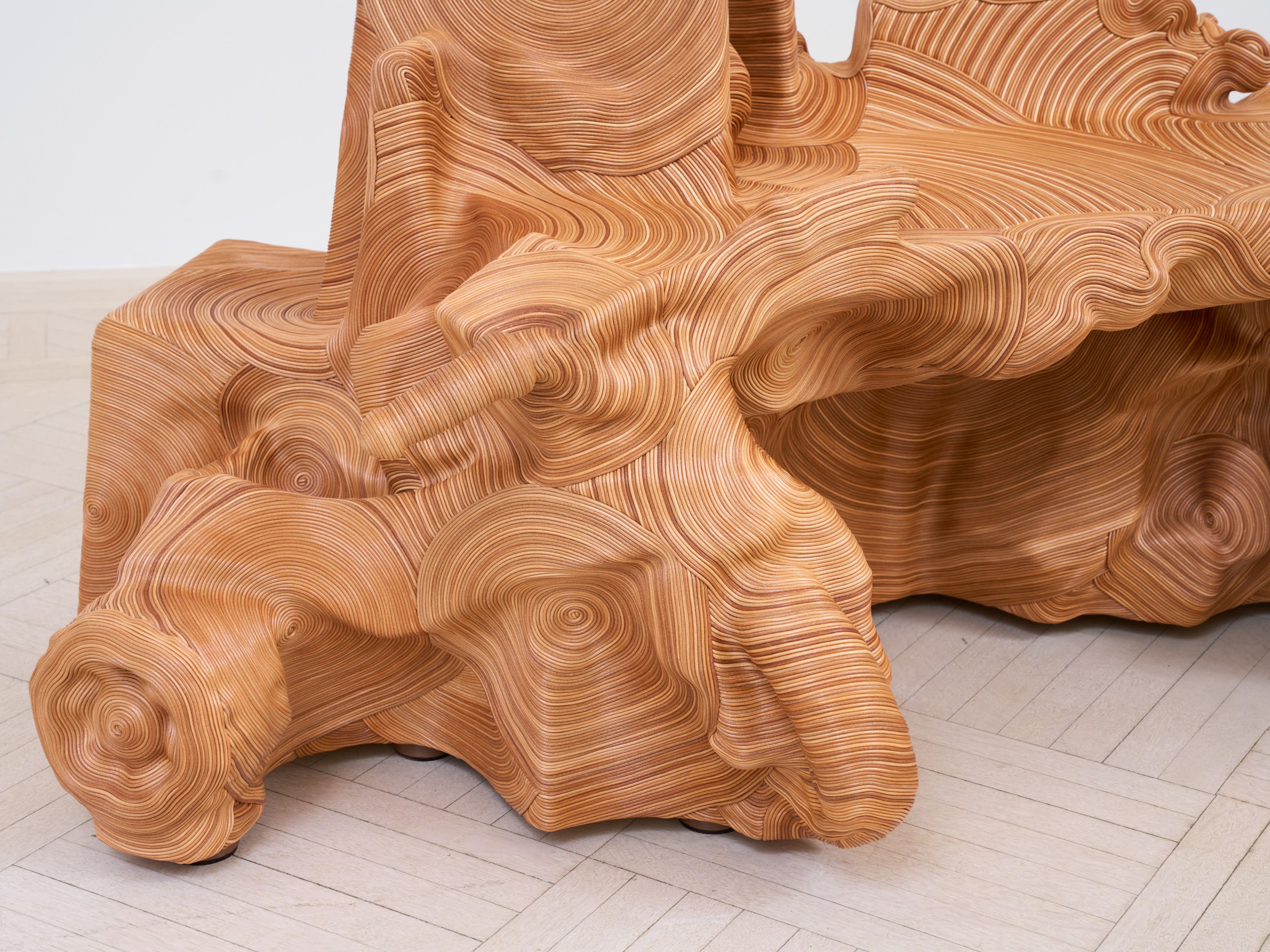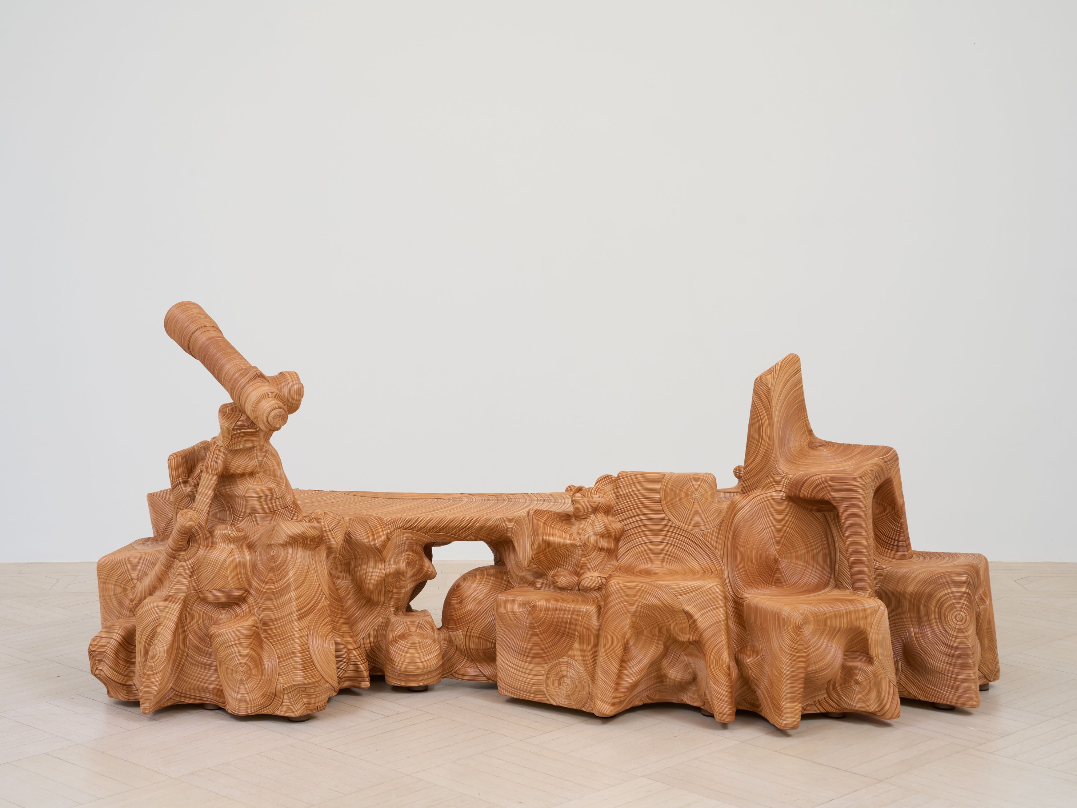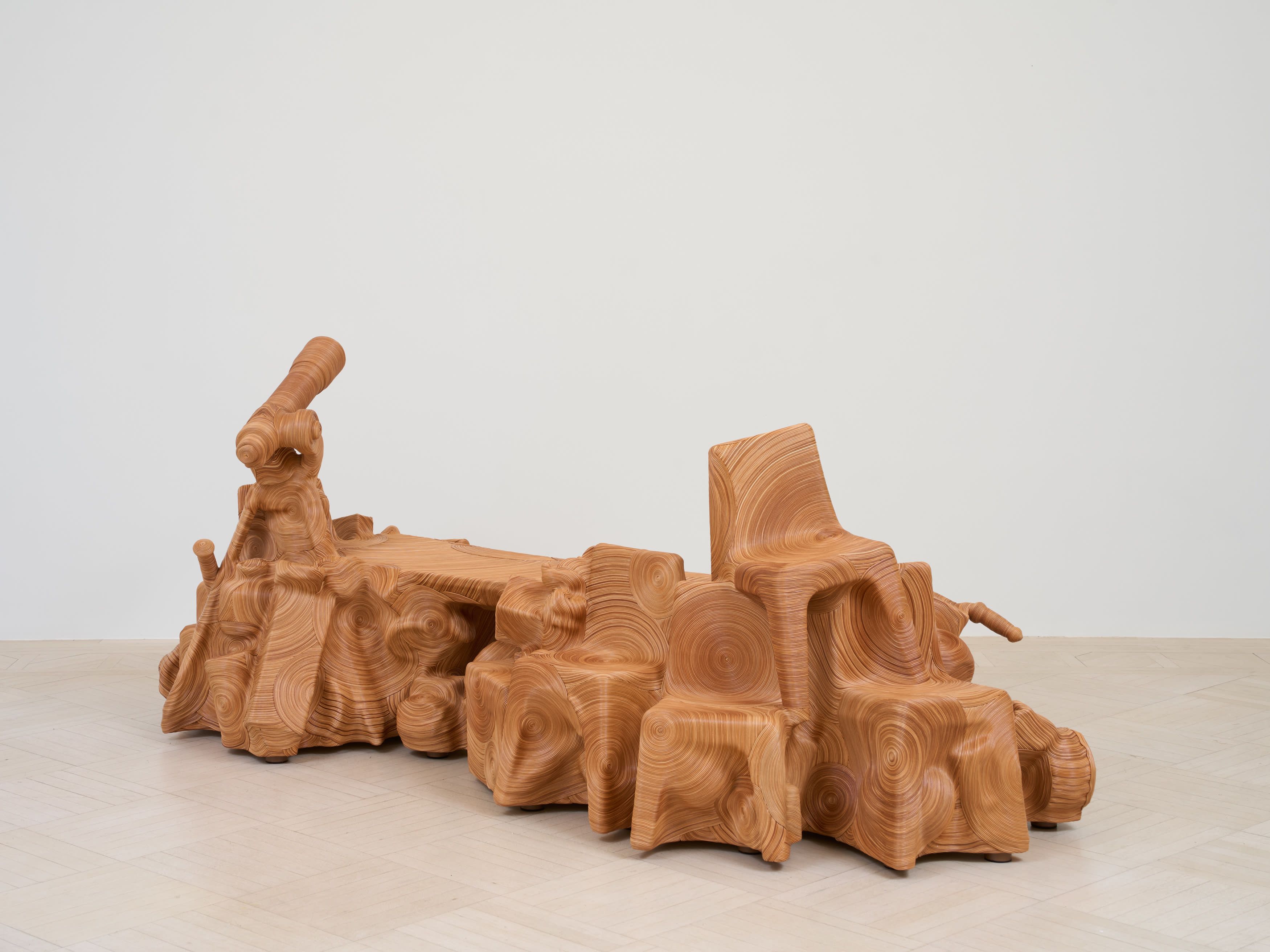 Plastic, metal and wood objects (telescope on tripod, treasure chest, globe, toy car, imperial star destroyer tambourine, toddler chairs, bat mobile, Mickey Mouse figure, moka pot, hamster ball, file box, etc.), plywood base, adhesive, natural leather cord, leather finisher
