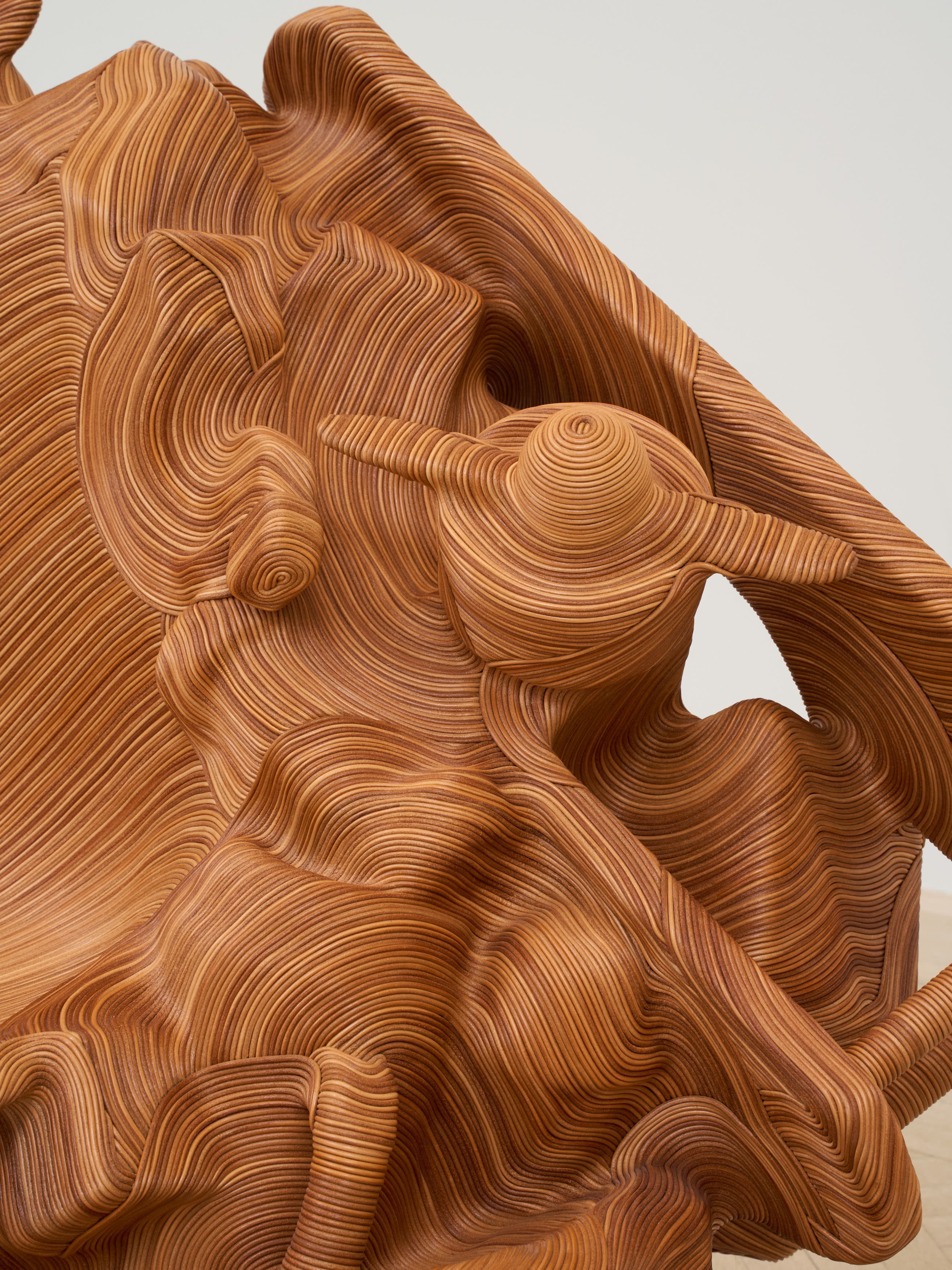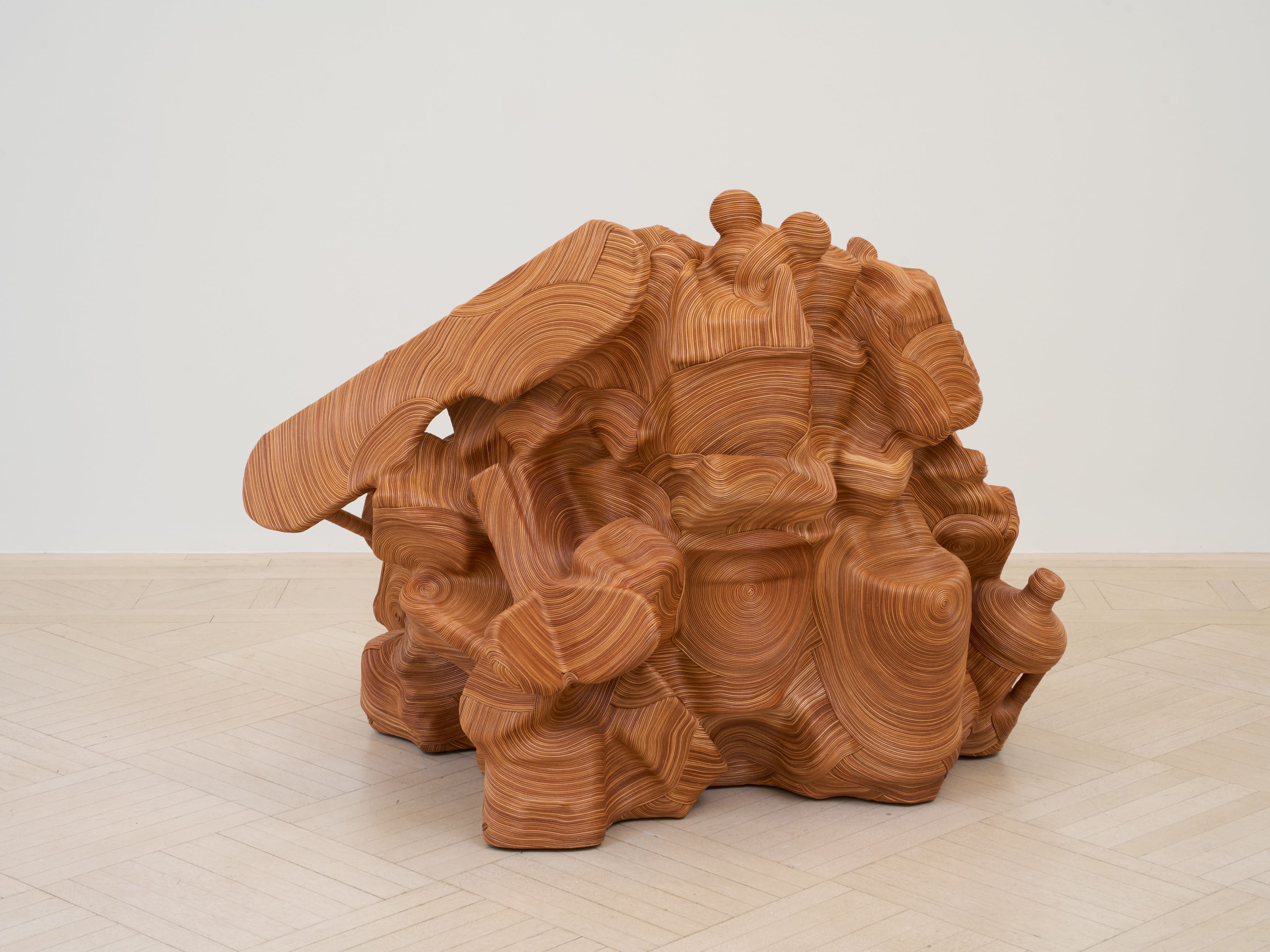 Plastic, wood, and metal objects (toy biplane, water container, binoculars, Mouseketeer ear hat, shoes, pitcher, toy car, Mickey Mouse coin box, mailbox, backpack, tissue case, Barbie house, etc.), plywood base, adhesive, natural leather cord, leather finisher