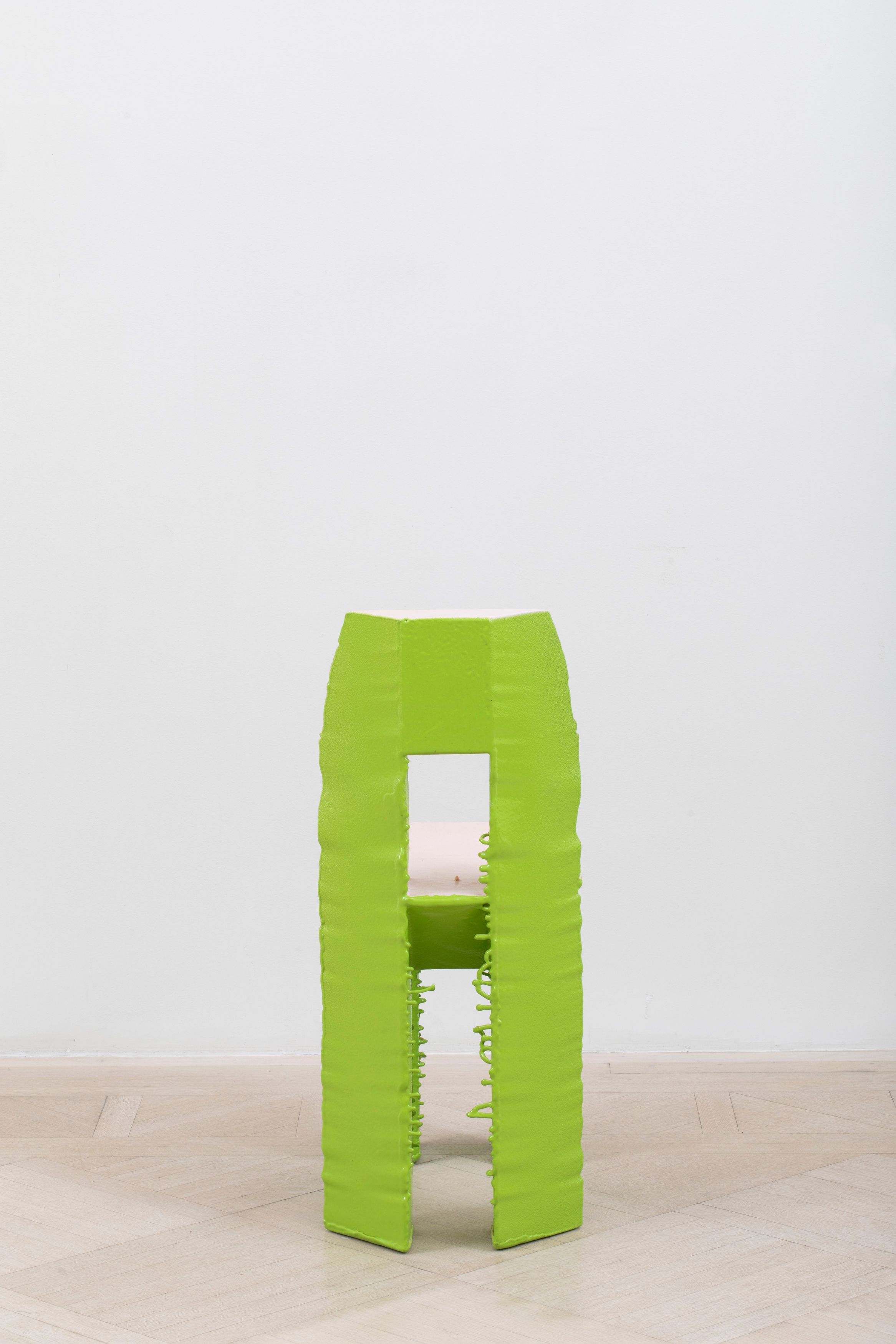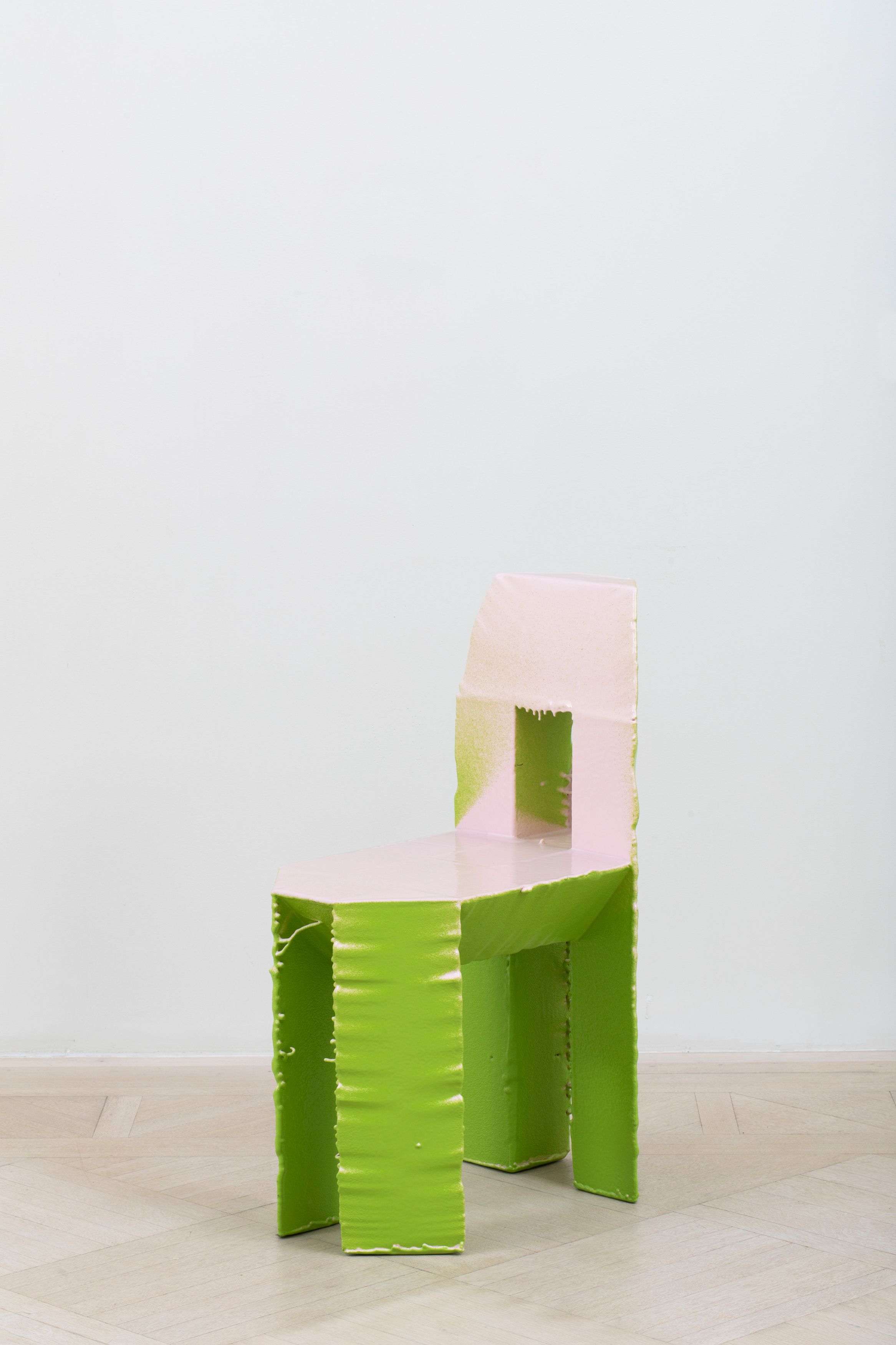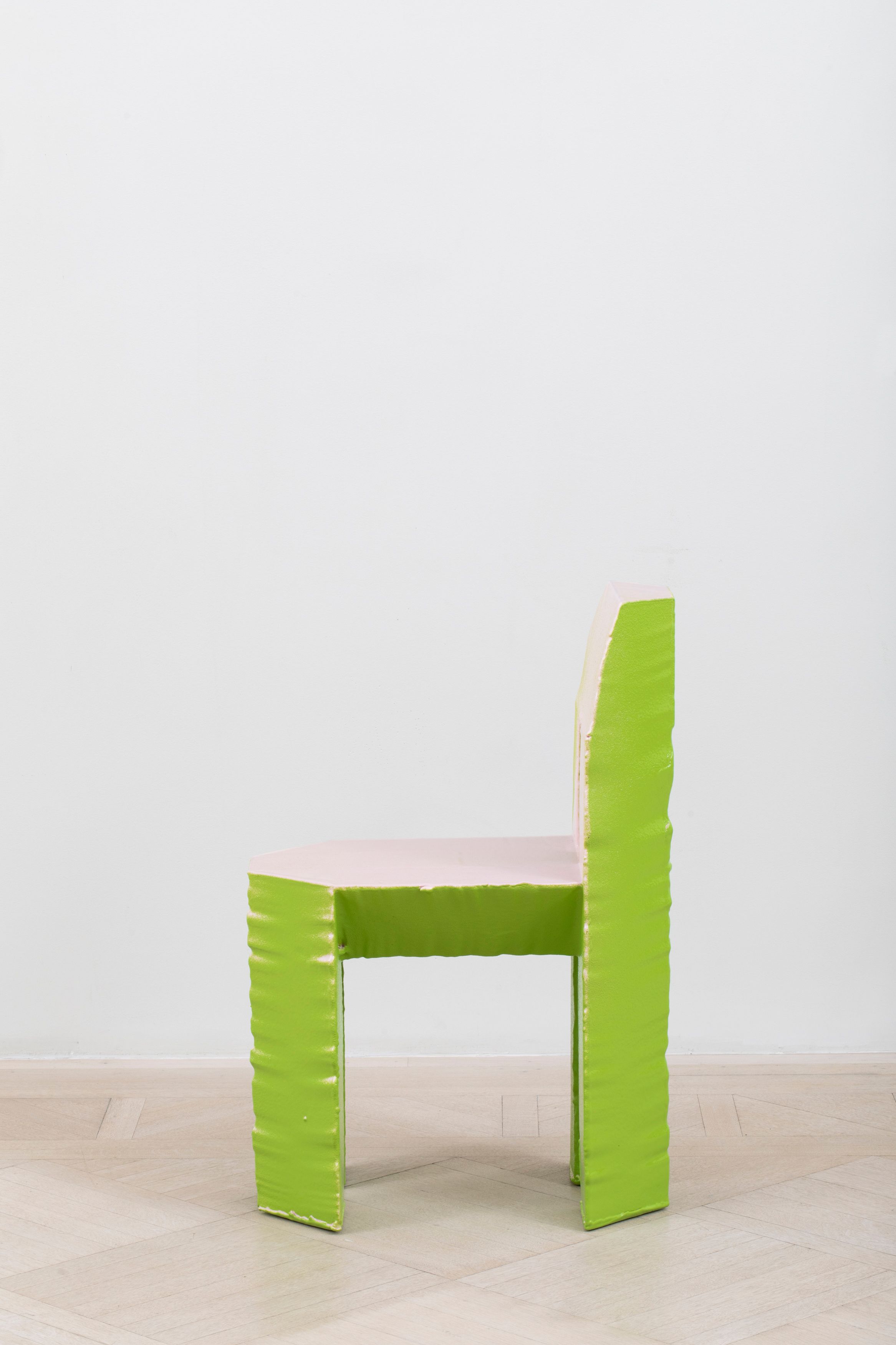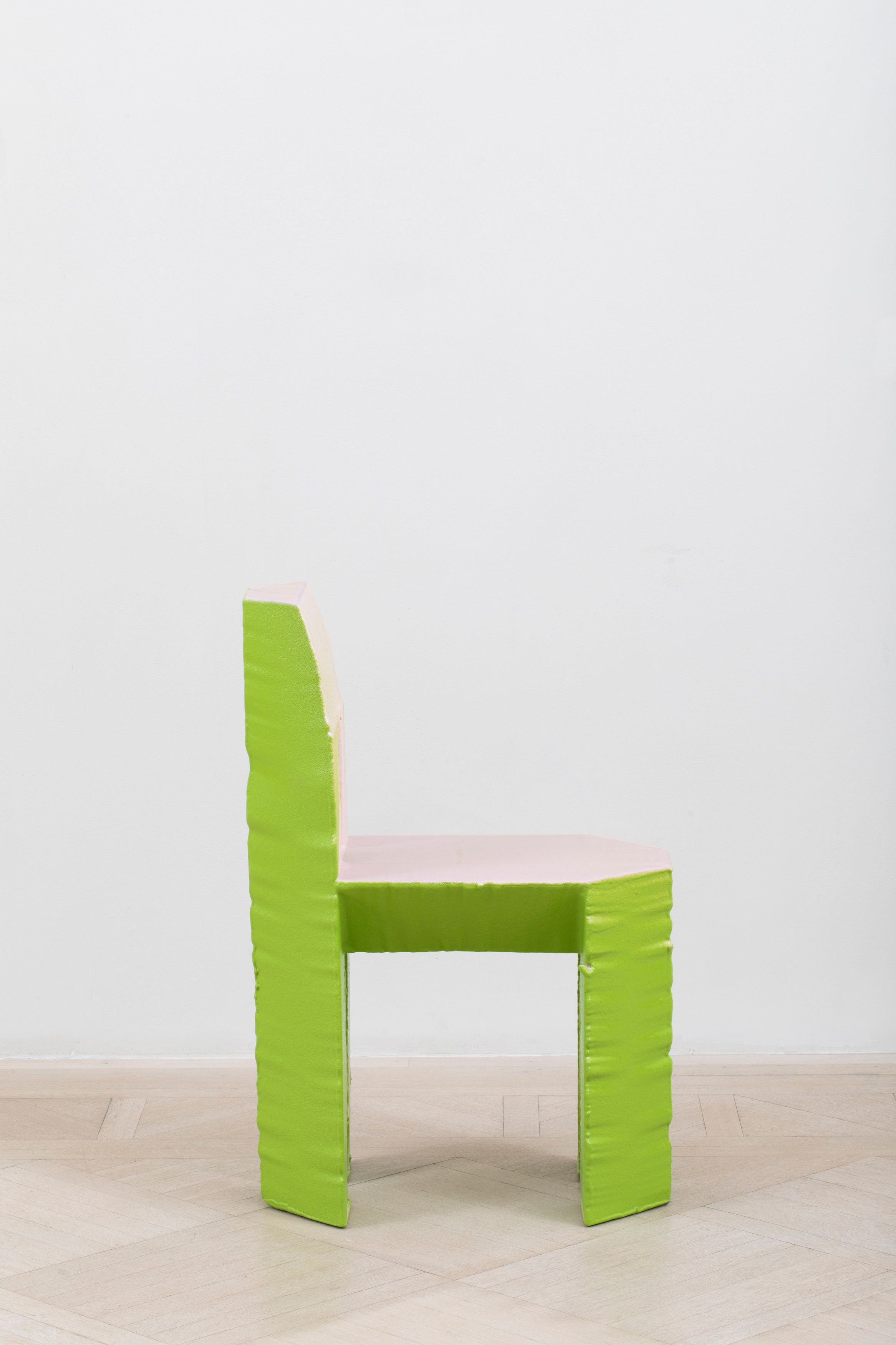The Economy Chair continues Max Lamb’s exploration of material efficiency. Using a hot wire, Lamb meticulously cuts 12 chairs from a single slab of polystyrene foam, leaving virtually zero waste. Each chair is then assembled and sprayed in a unique, hand-mixed rubber coloring.