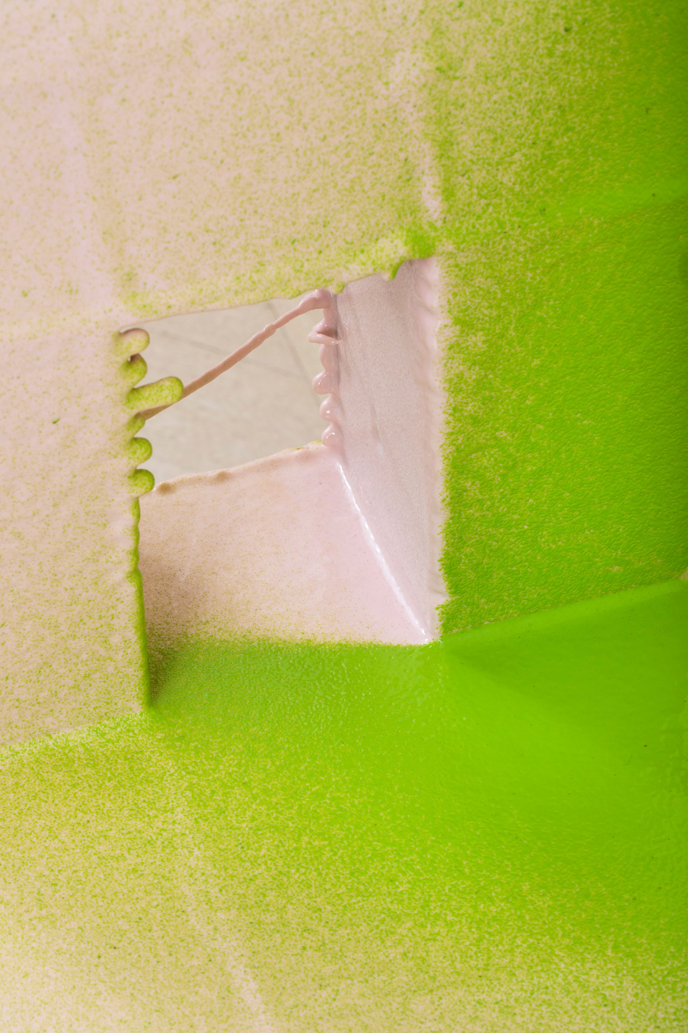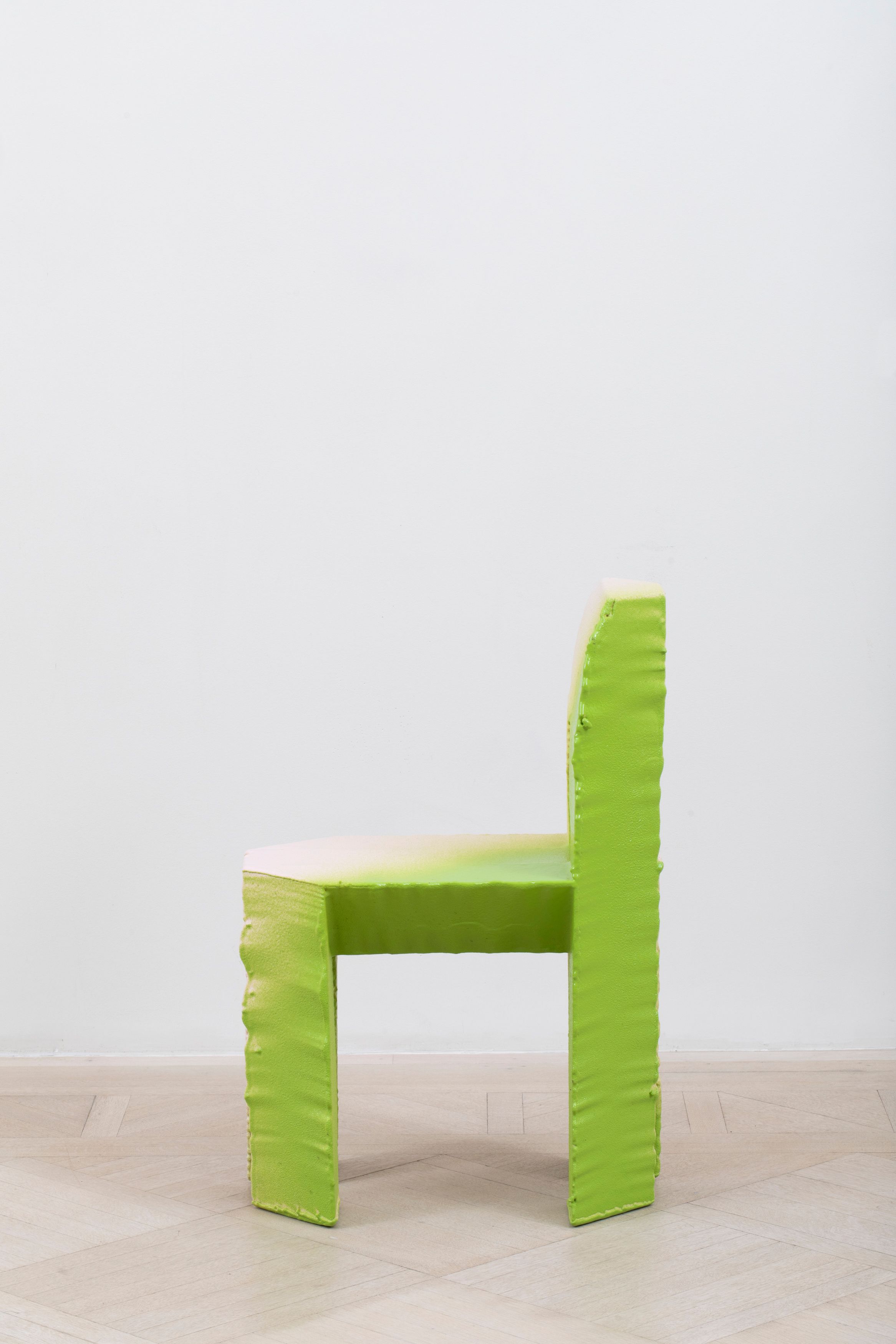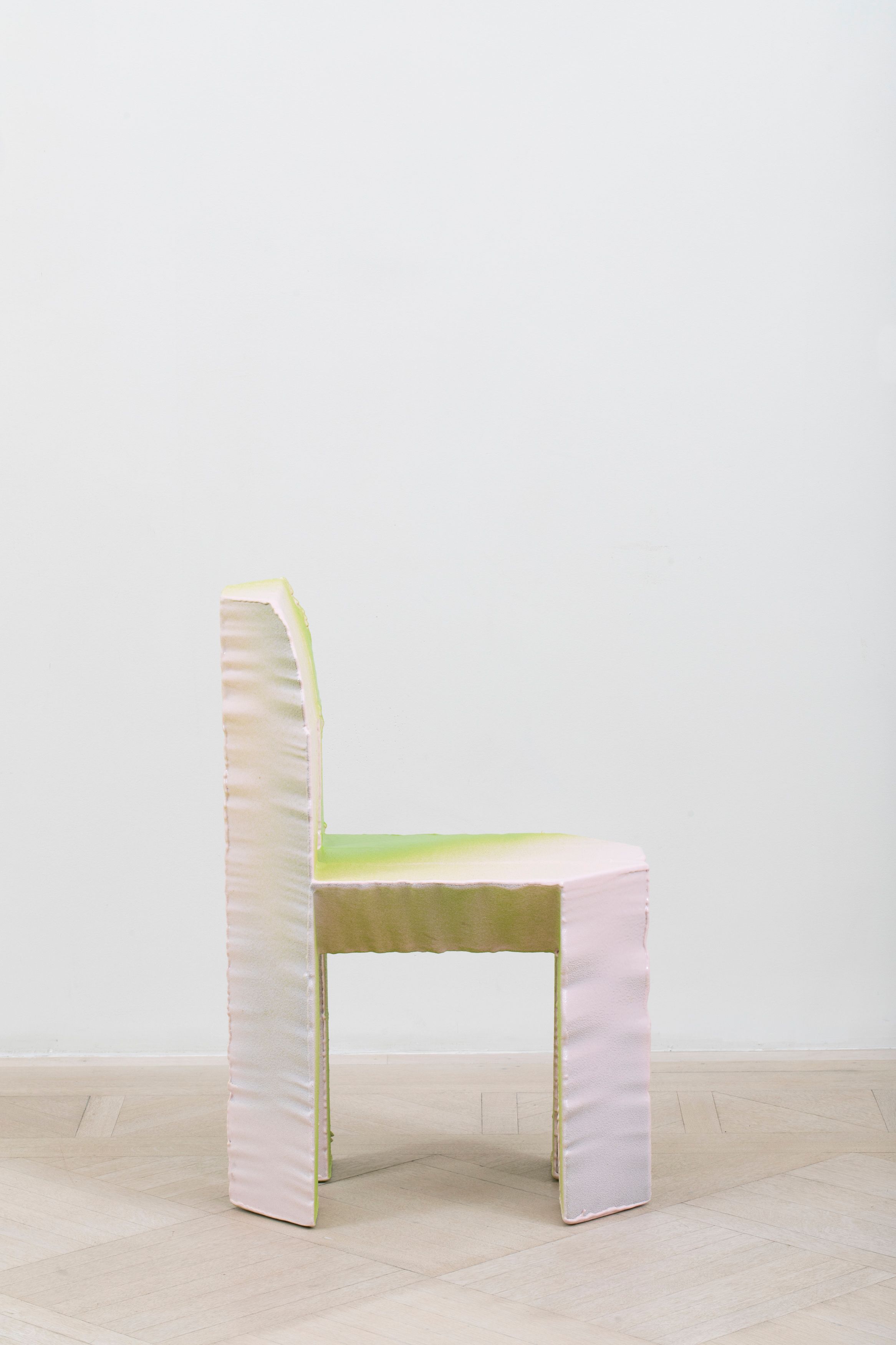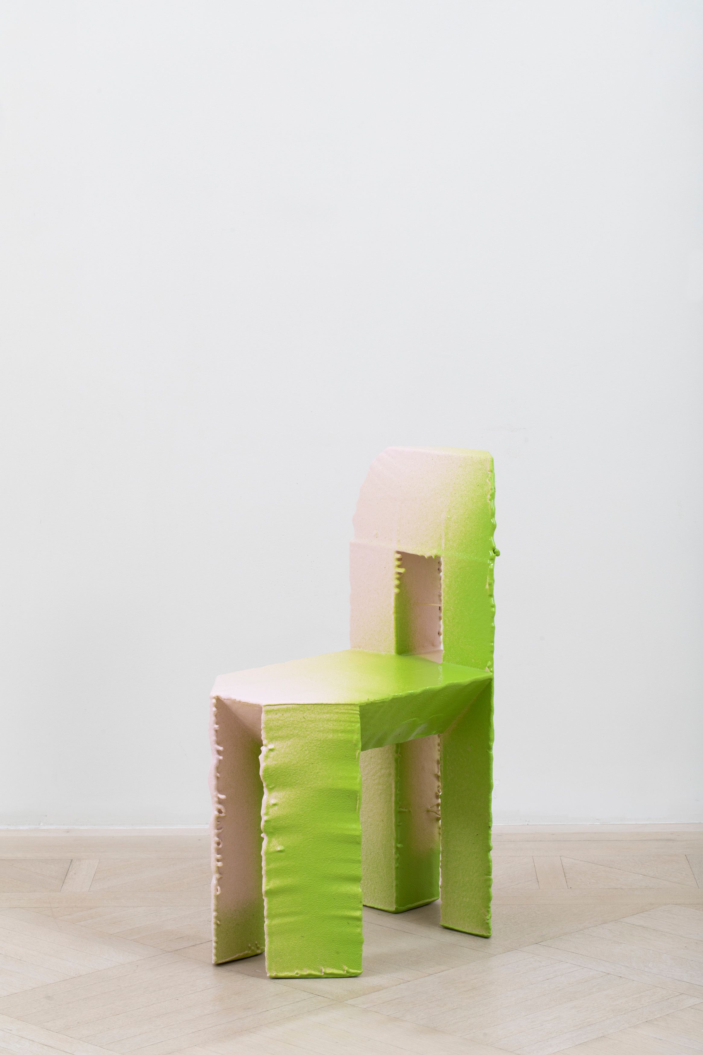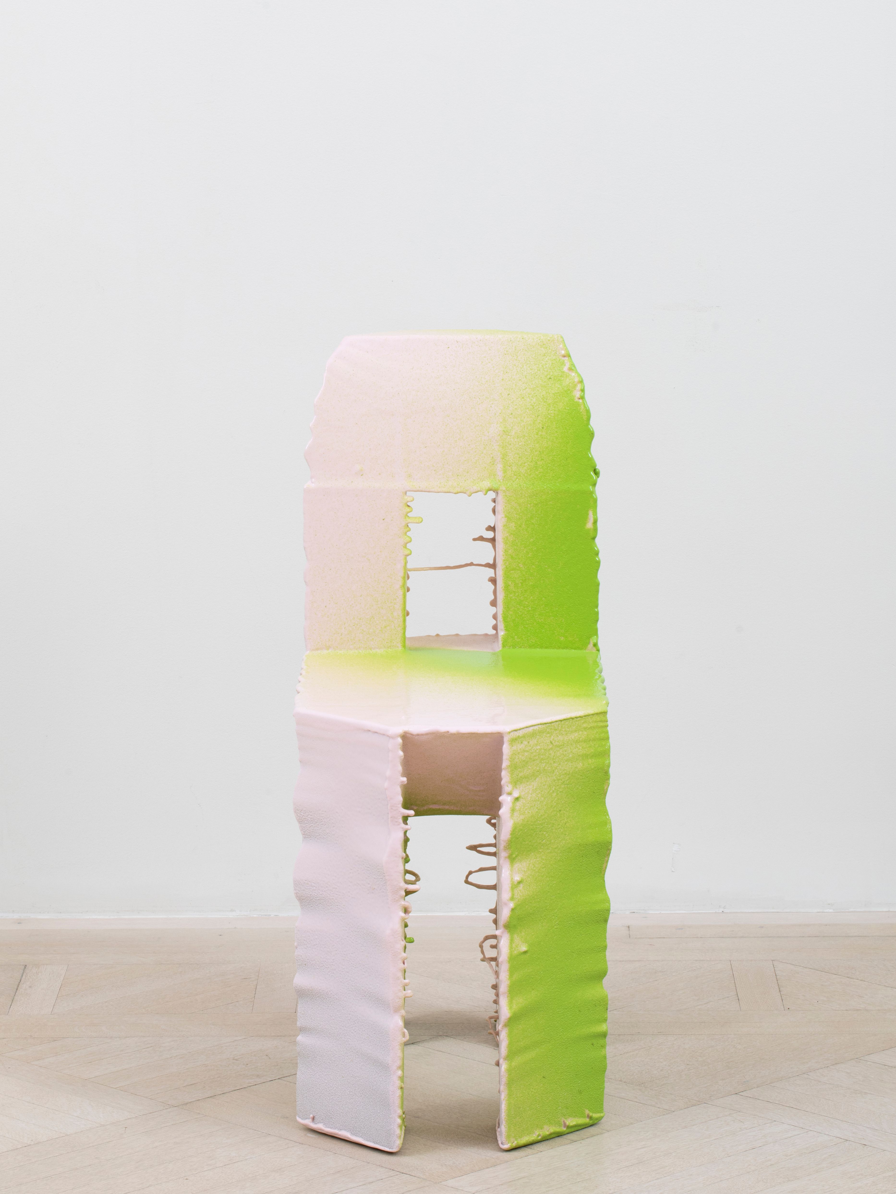 The Economy Chair continues Max Lamb’s exploration of material efficiency. Using a hot wire, Lamb meticulously cuts 12 chairs from a single slab of polystyrene foam, leaving virtually zero waste. Each chair is then assembled and sprayed in a unique, hand-mixed rubber coloring.