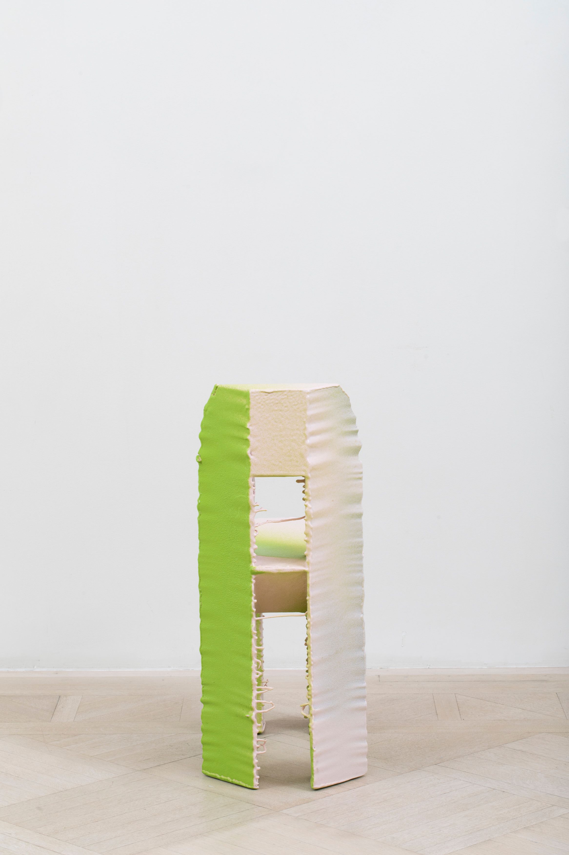 Lamb has created Poly and Scrap Poly works for more than 15 years — cutting, carving, peeling, spraying, and up-cycling both virgin and scrap polystyrene, constantly innovating with processing techniques and coatings while pushing the boundaries of this modest material. The Economy Chair showcases Lamb’s comfort in working with polystyrene, and he has recently increased production capacity while maintaining an intimate studio practice that assures each piece’s genetic uniqueness.