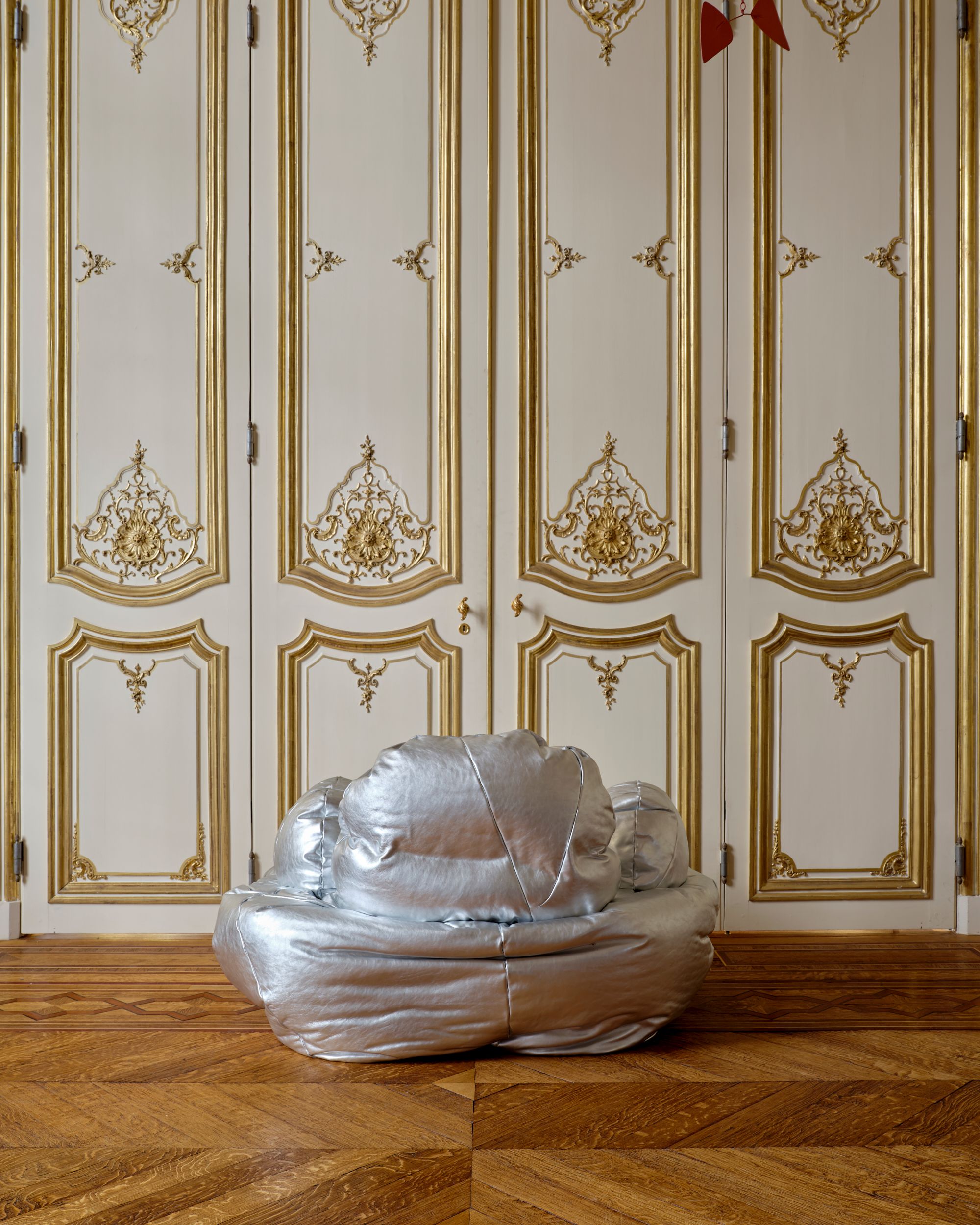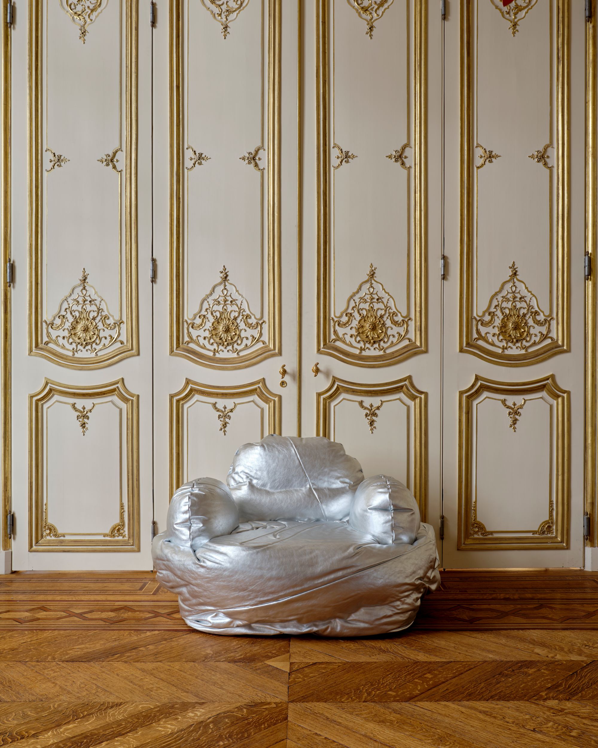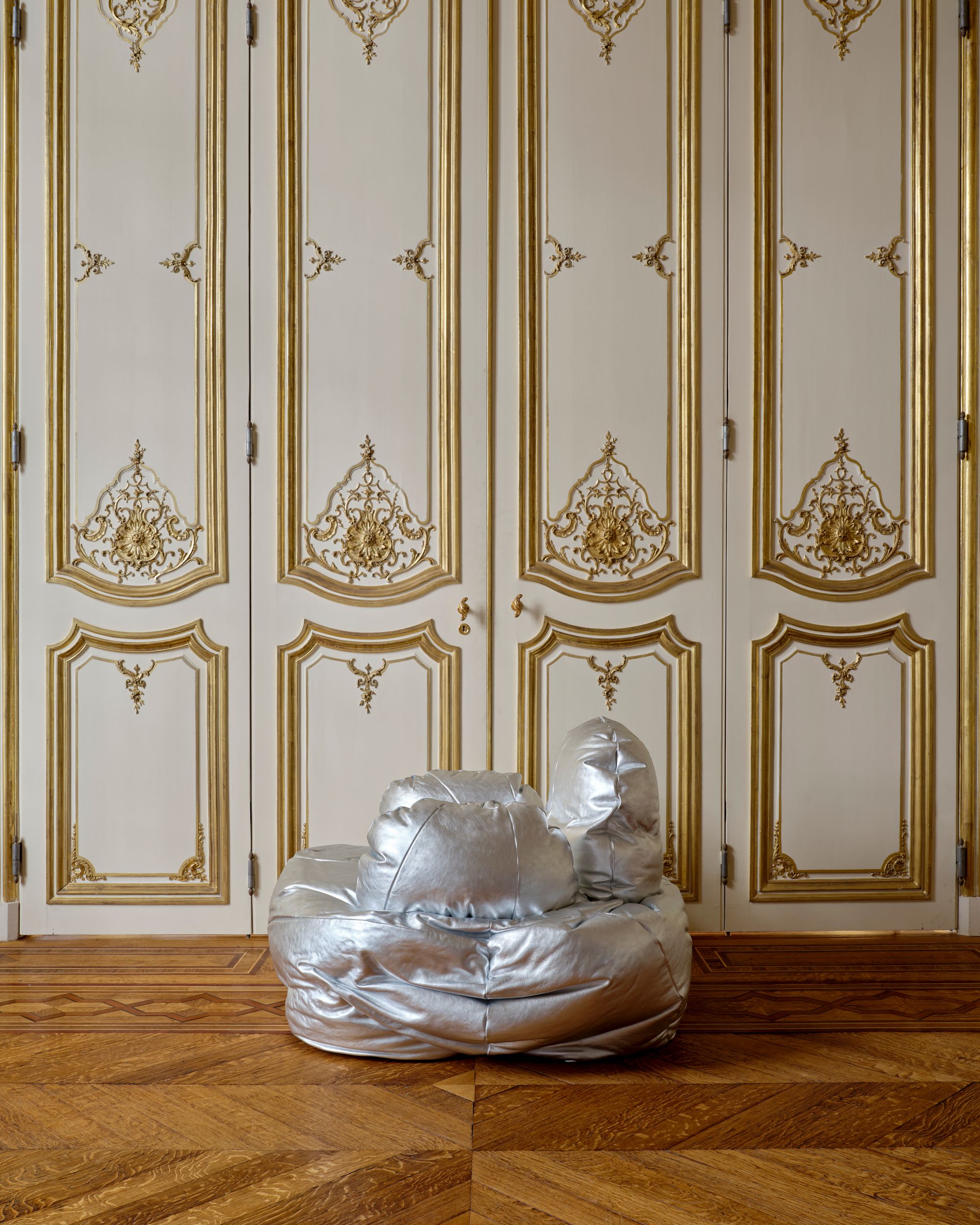 Silver leather, recycled foam, poplar plywood, linen webbing, Valchromat, flexible polyurethane foam
