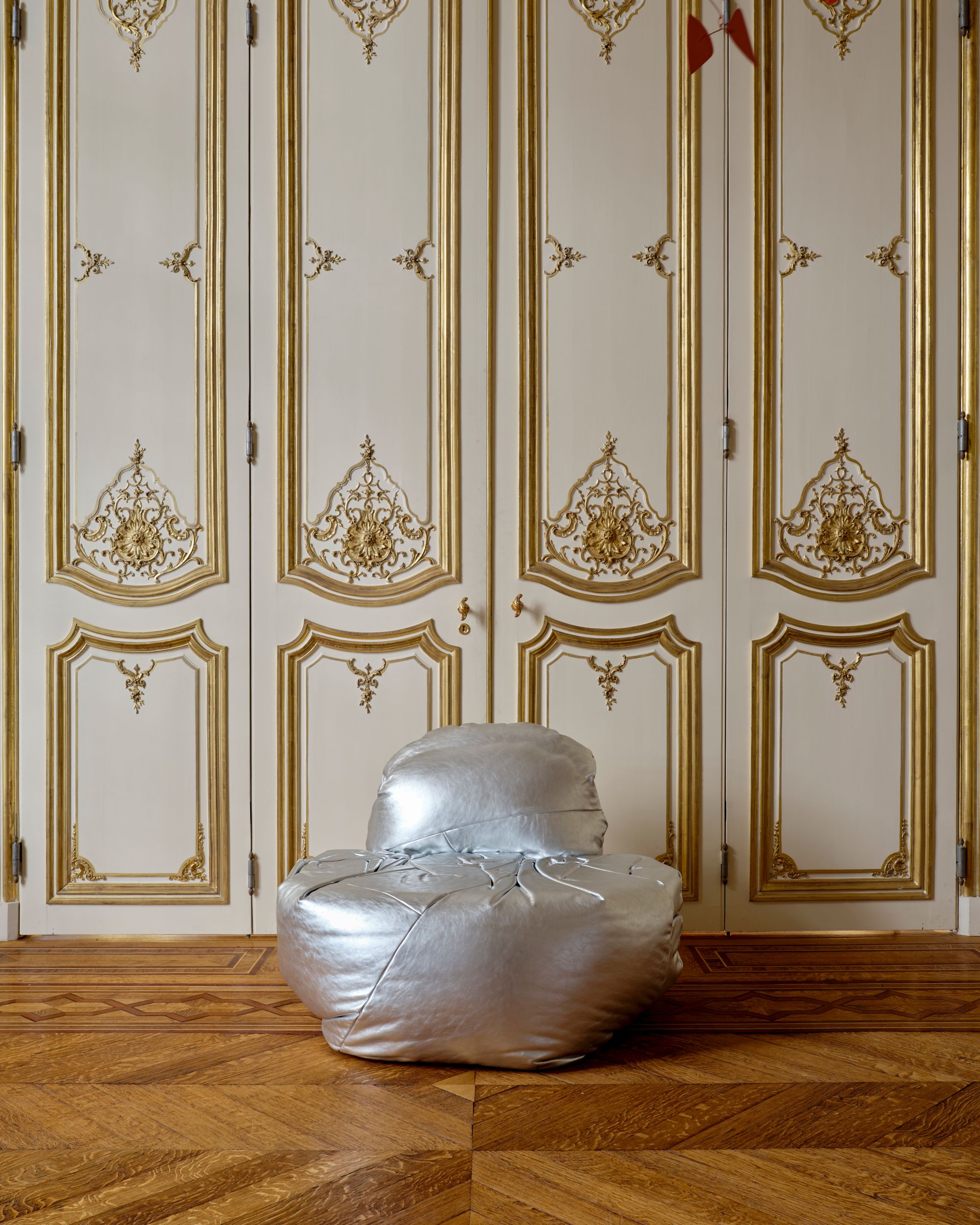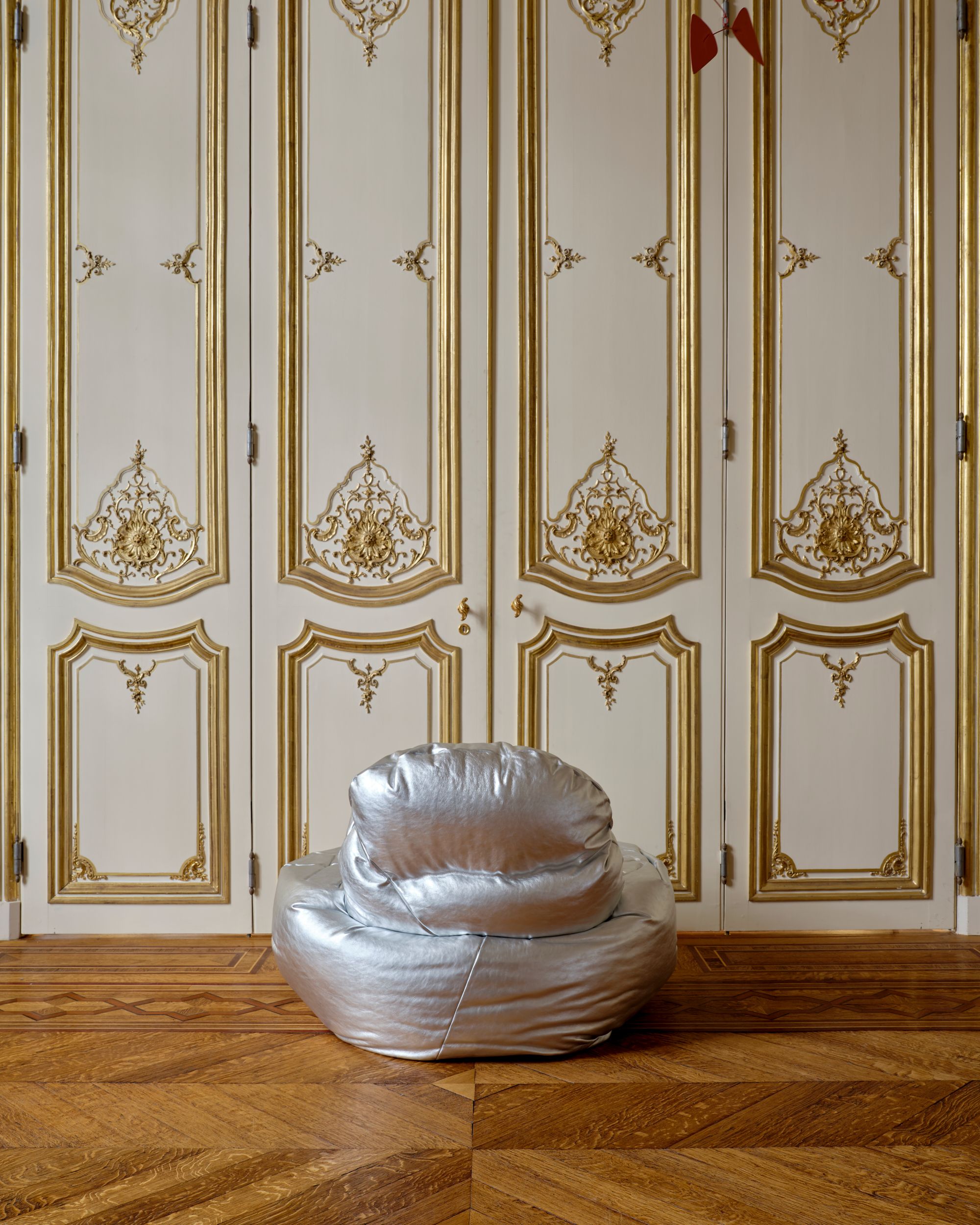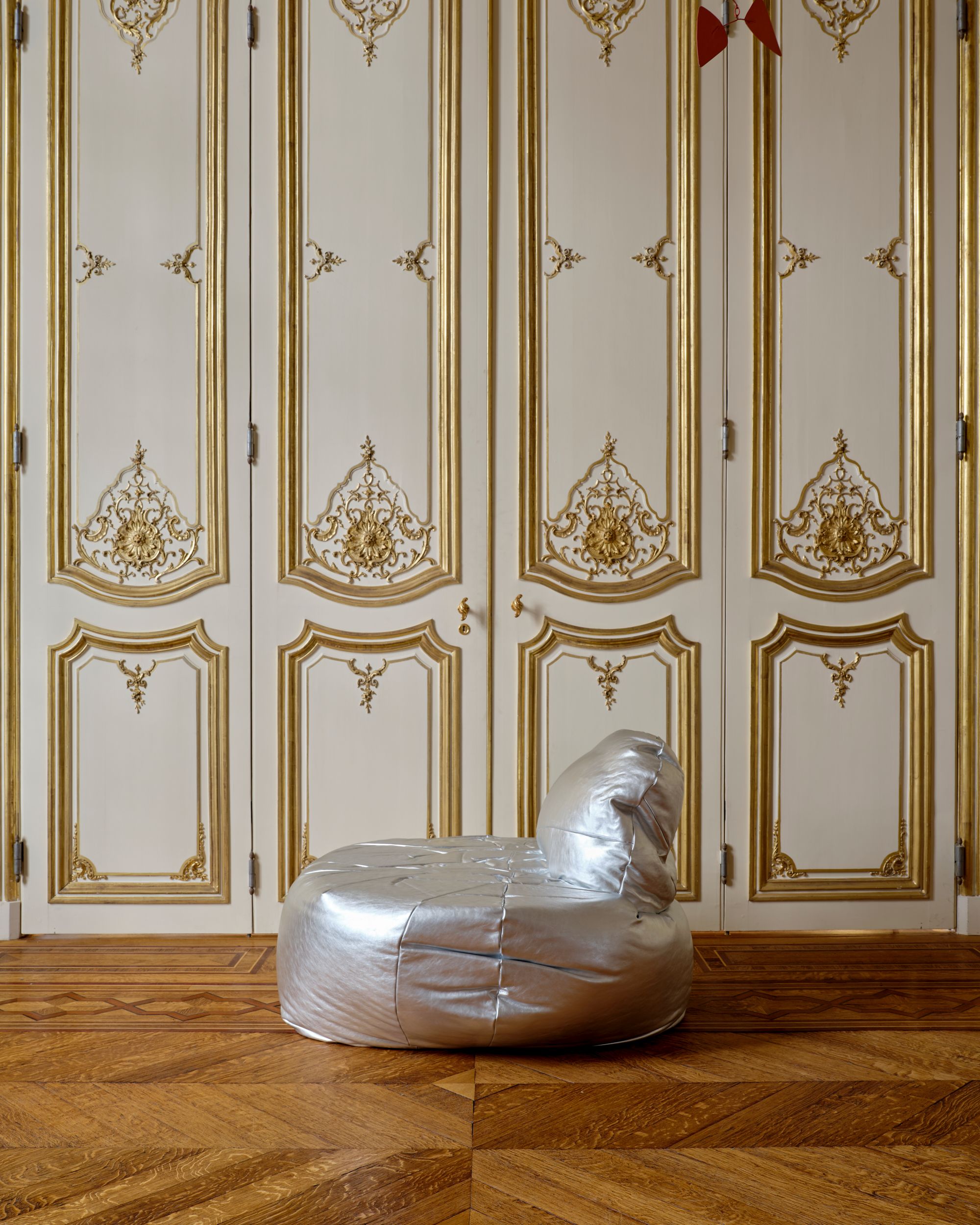 Silver leather, recycled foam, poplar plywood, linen webbing, Valchromat, flexible polyurethane foam