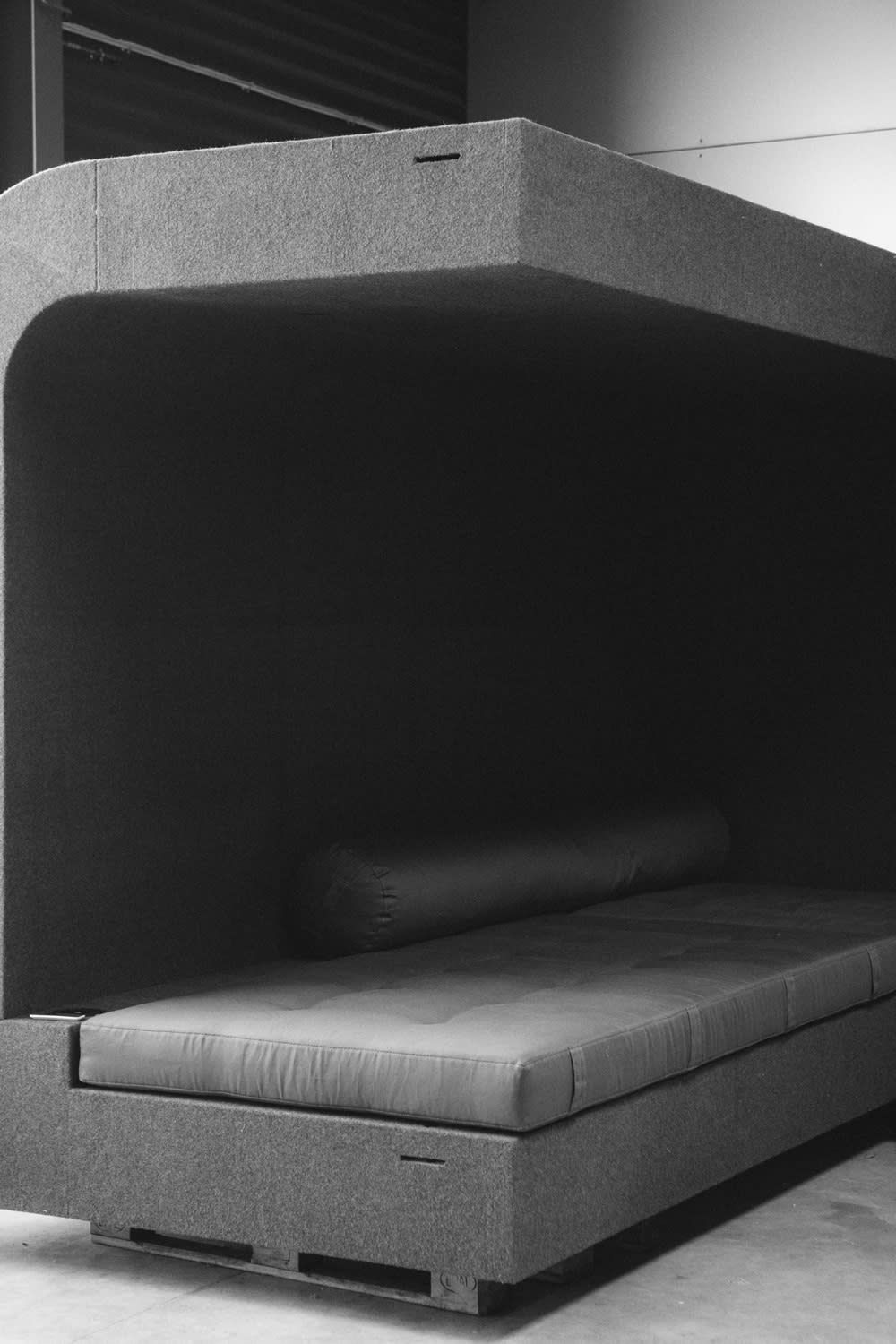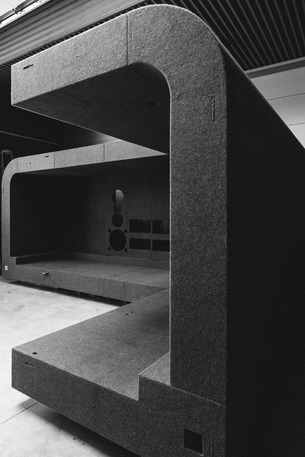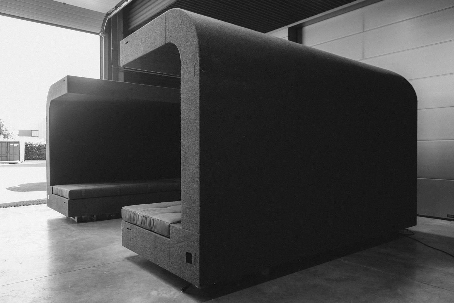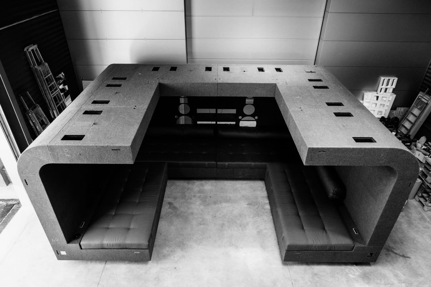 GLADE is Rick Owens’ modular architectural system that transforms between sofa, bed, workspace, and creative studio. Each selfcontained unit integrates lighting, internet, and power solutions within its Batipan plywood structure, wrapped in French military wool blankets. The system consists of two elements - the standard unit and corner piece - which can function independently or connect to form larger configurations.