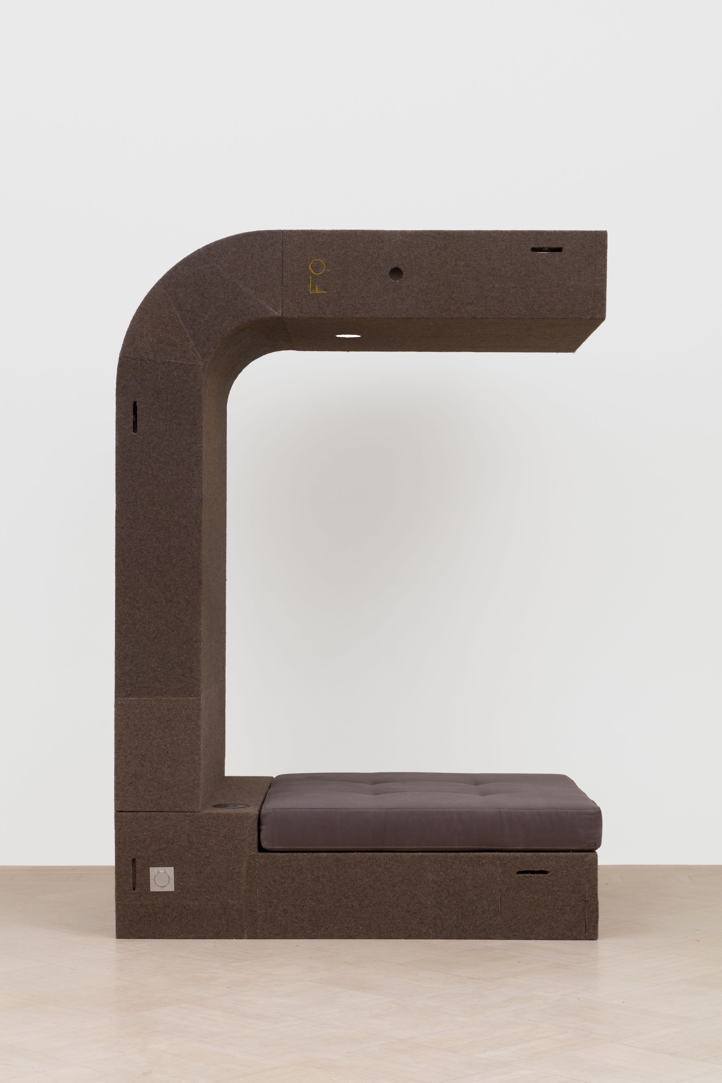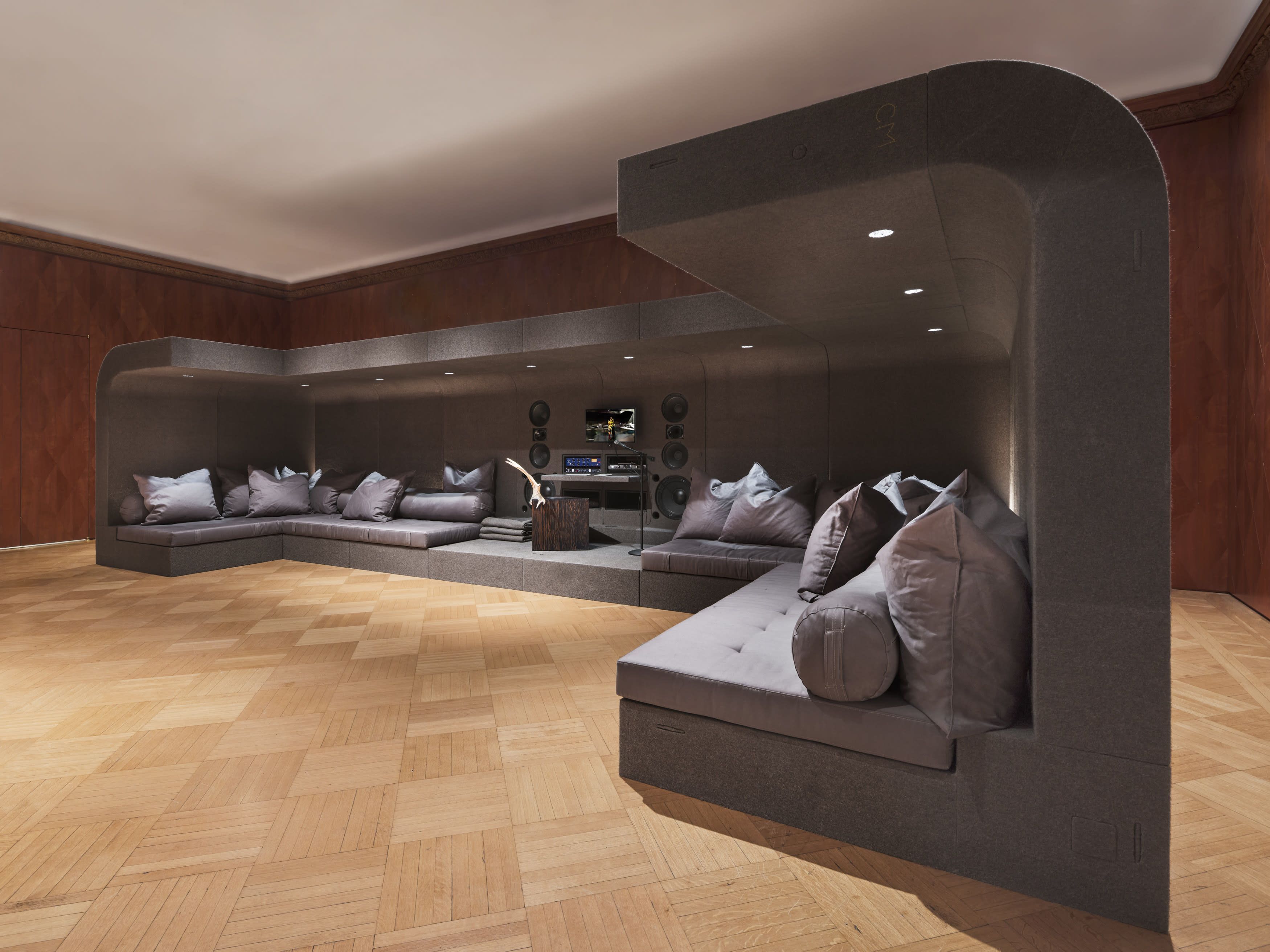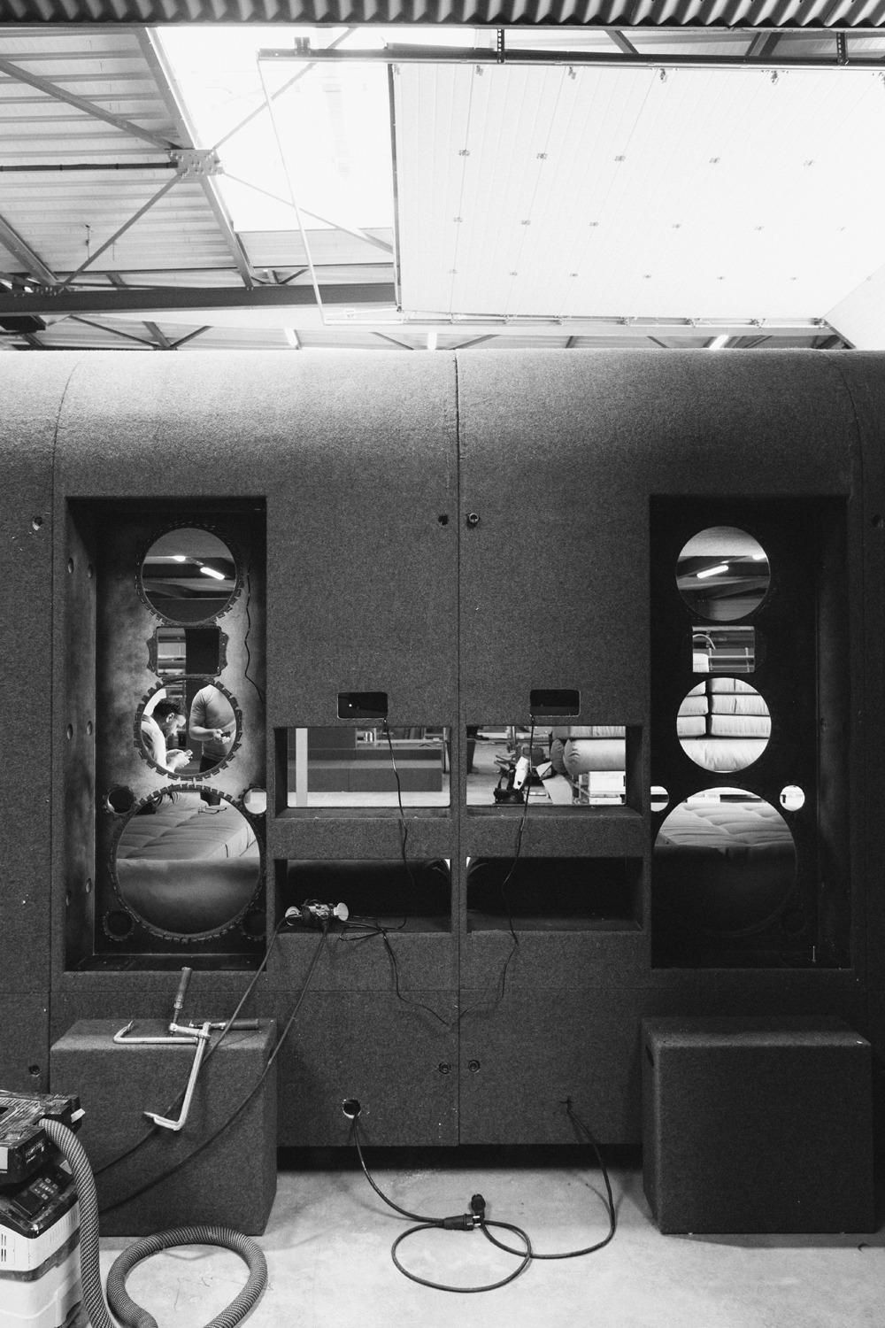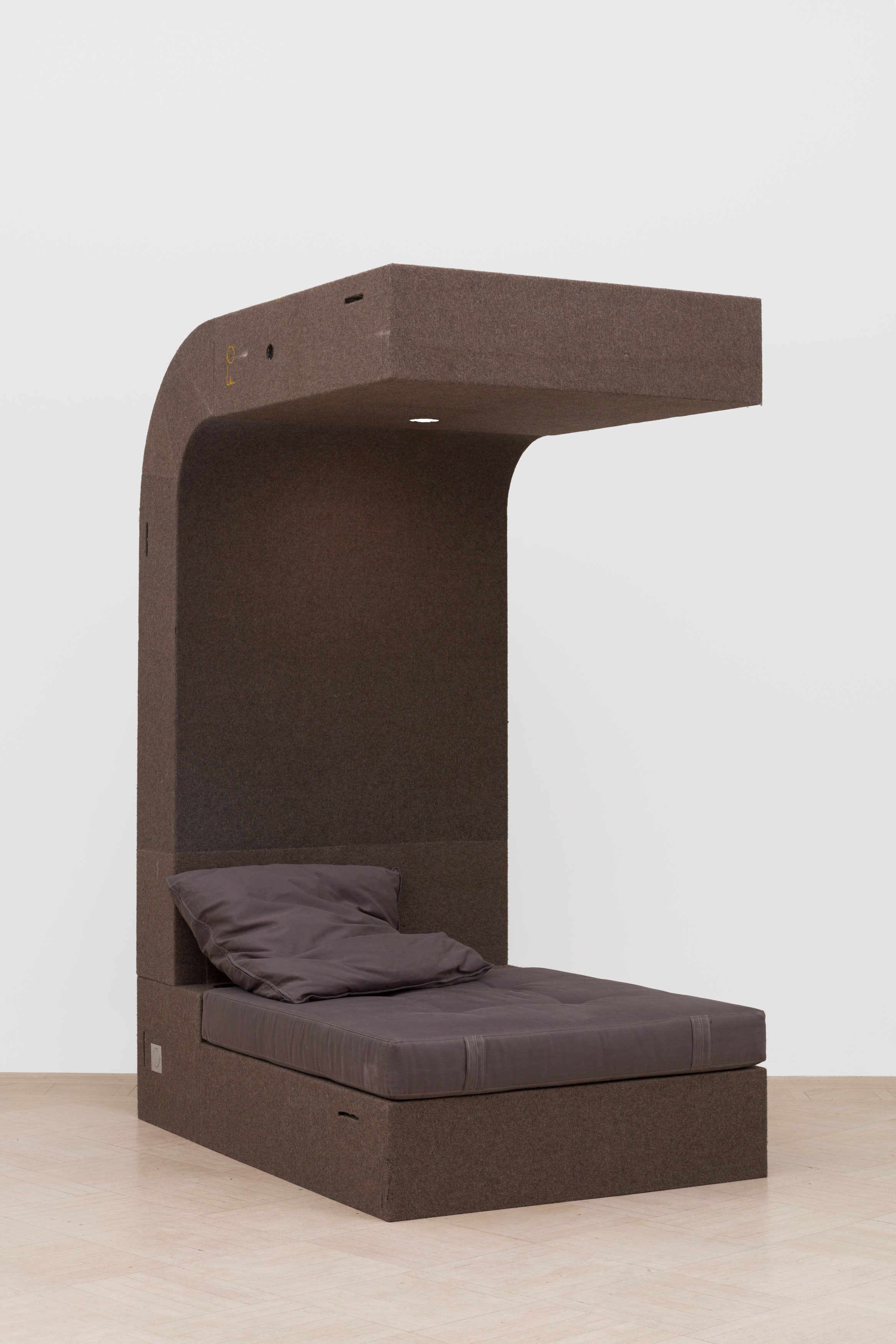 GLADE is Rick Owens’ modular architectural system that transforms between sofa, bed, workspace, and creative studio. Each selfcontained unit integrates lighting, internet, and power solutions within its Batipan plywood structure, wrapped in French military wool blankets. The system consists of two elements - the standard unit and corner piece - which can function independently or connect to form larger configurations.
