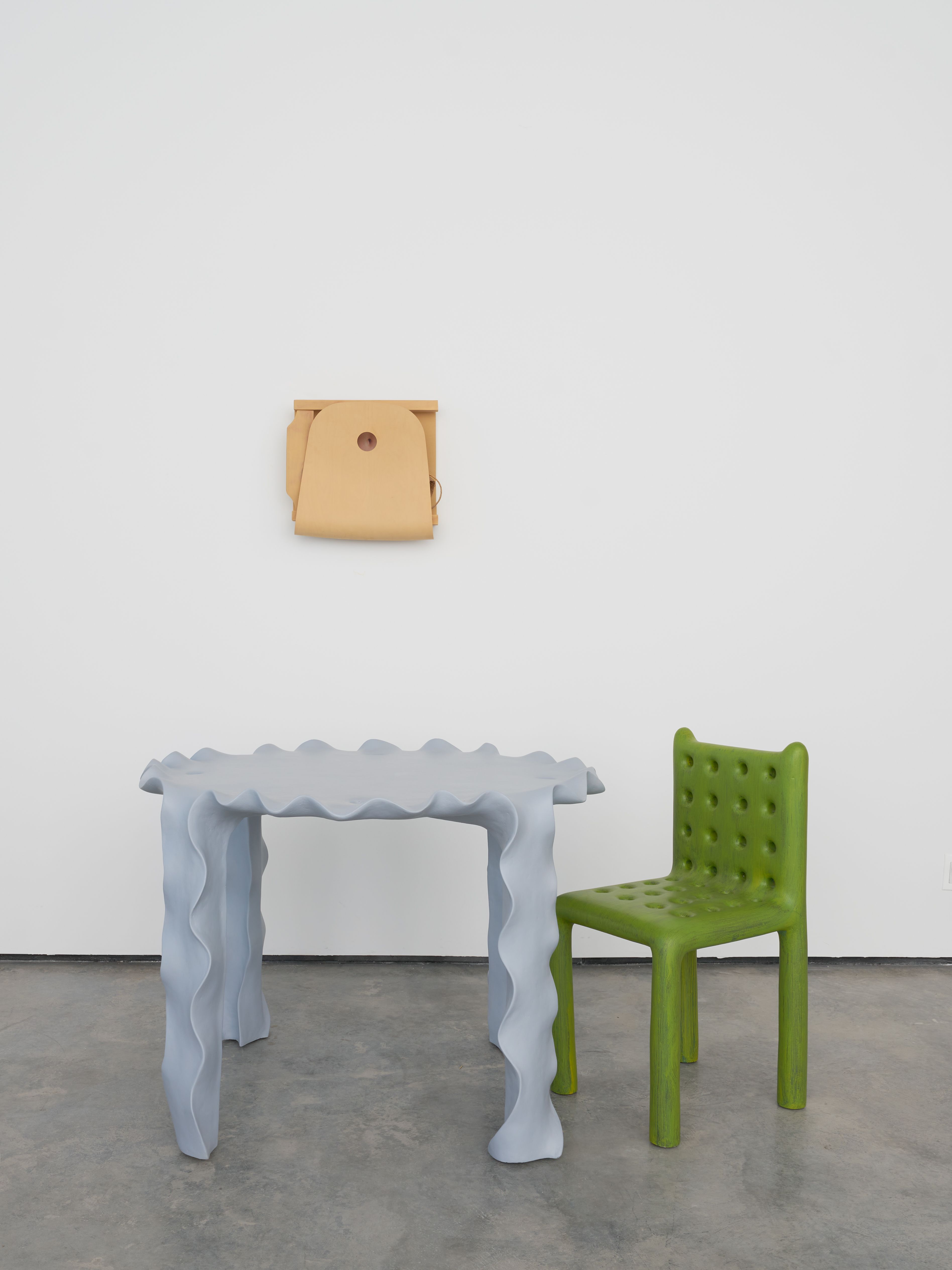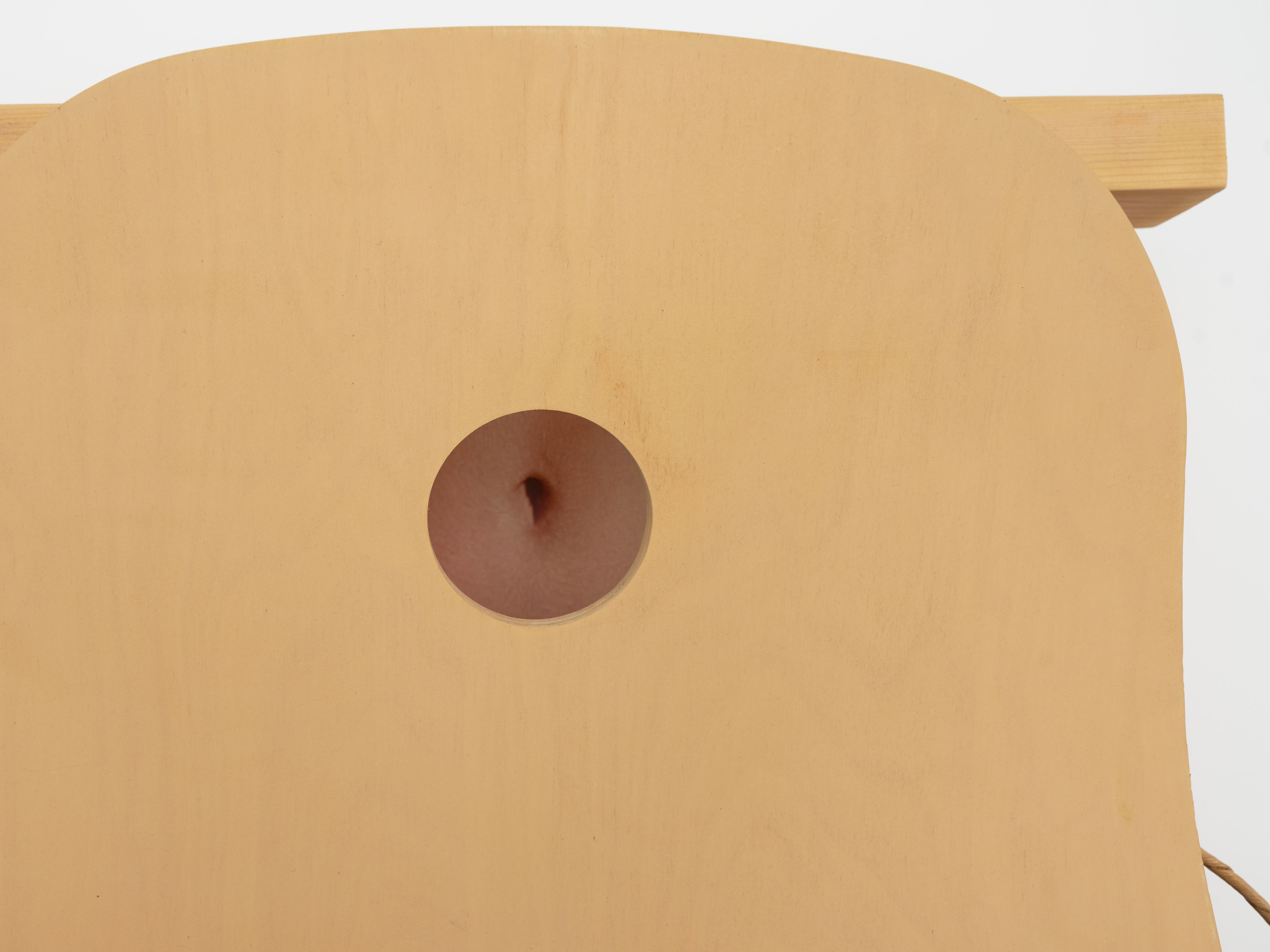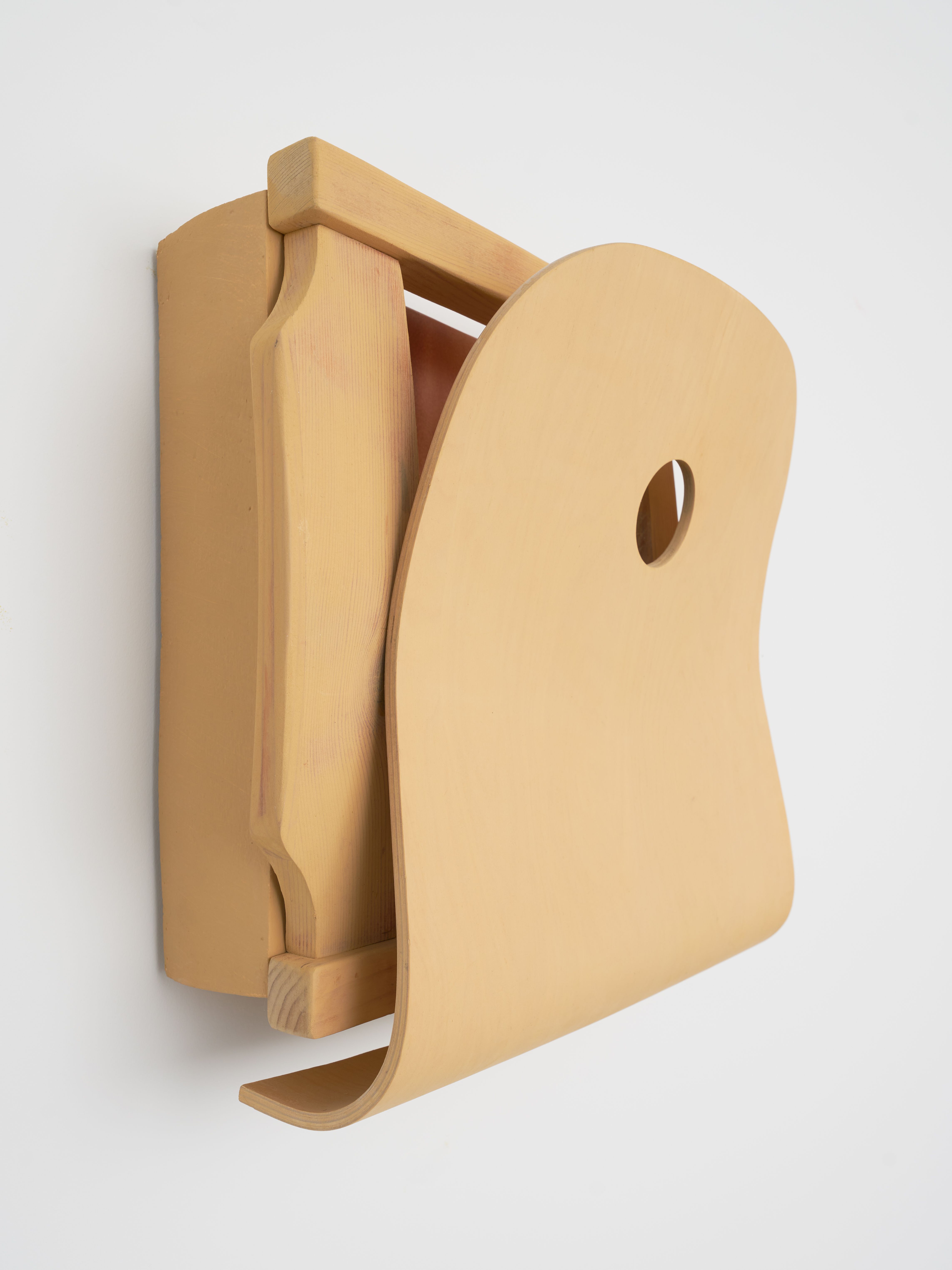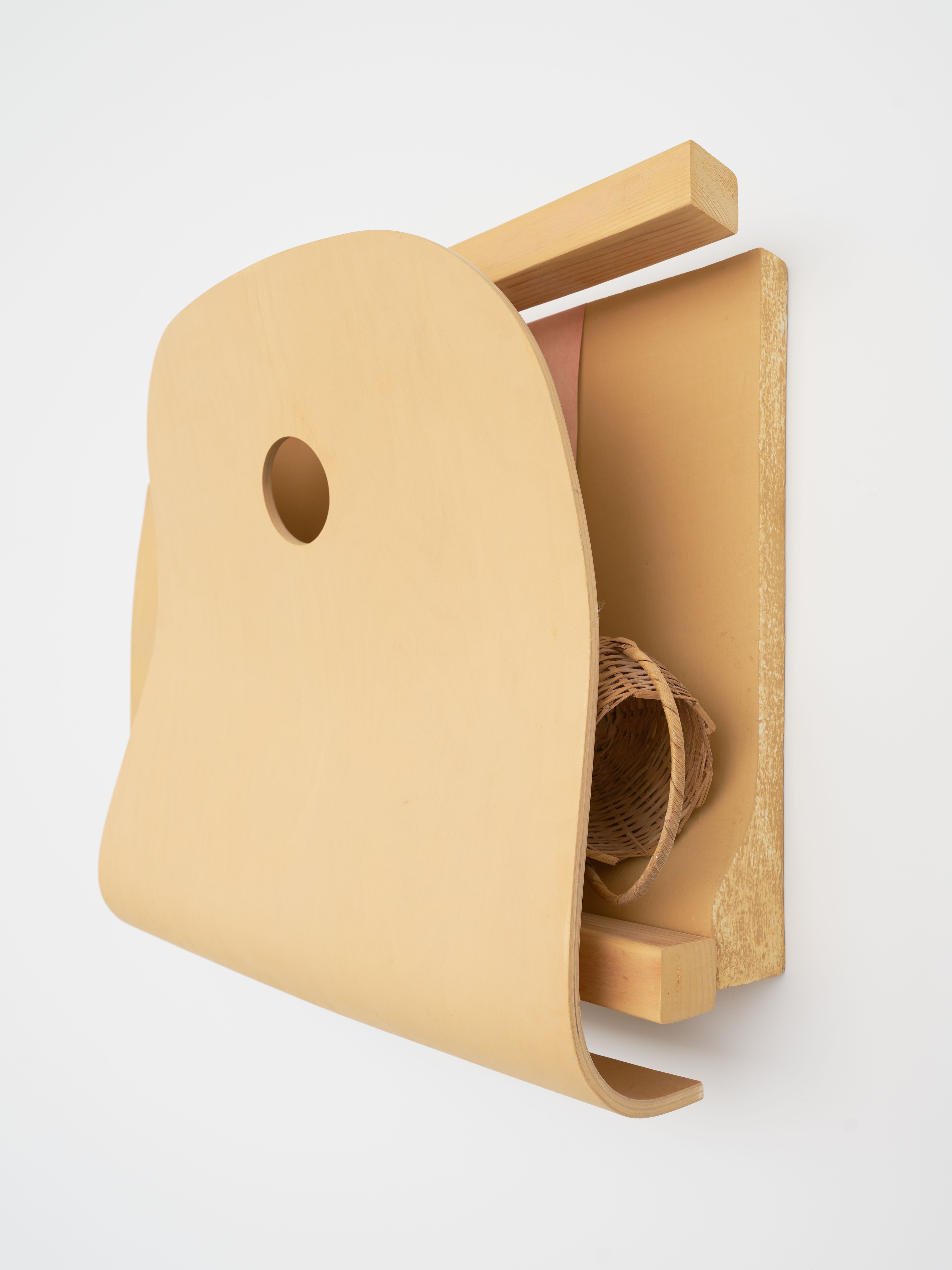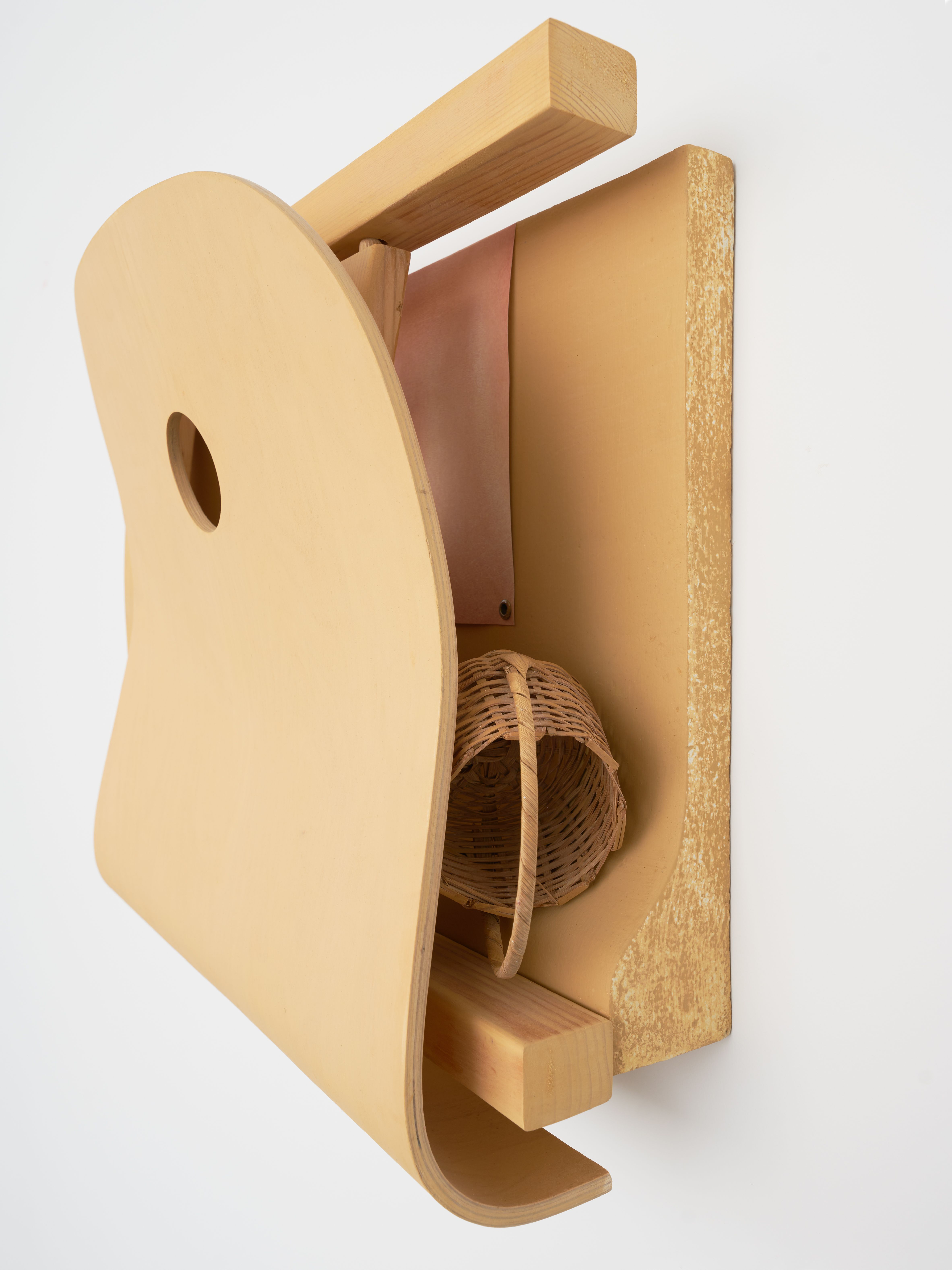 Wood, paper, sawdust, paint, found chair parts, photo, found basket, grommets