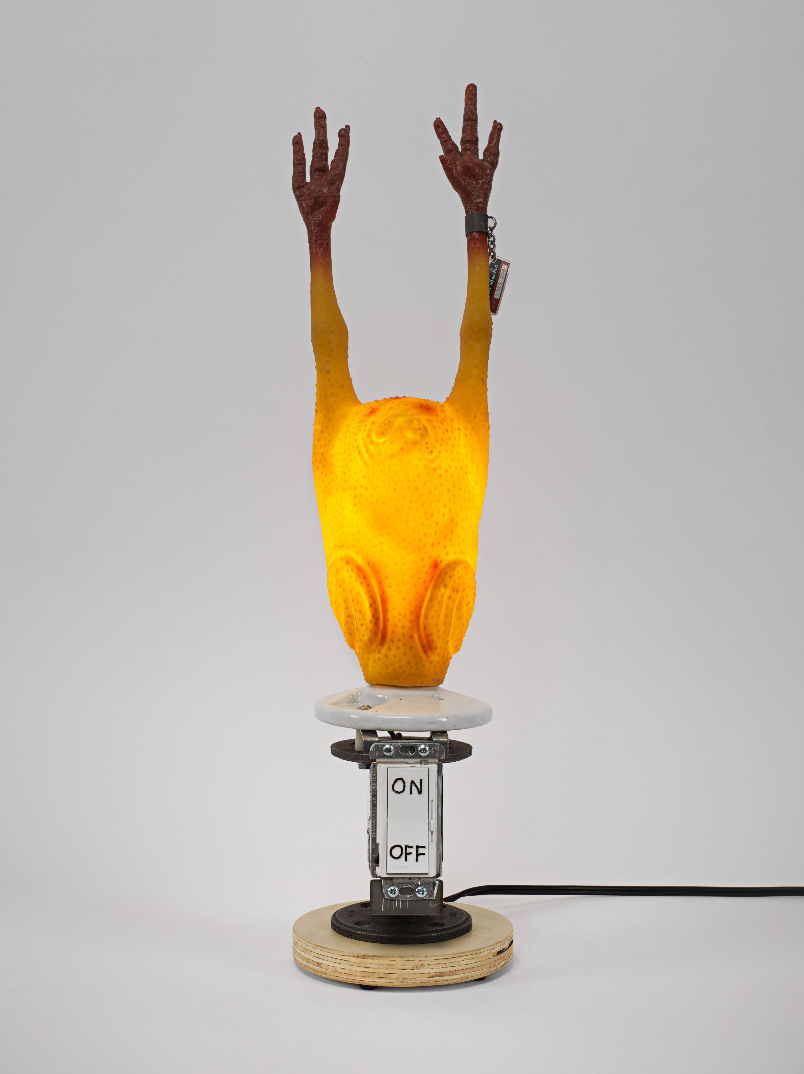 Rubber chicken, plywood, steel, electrical components, and hardware
