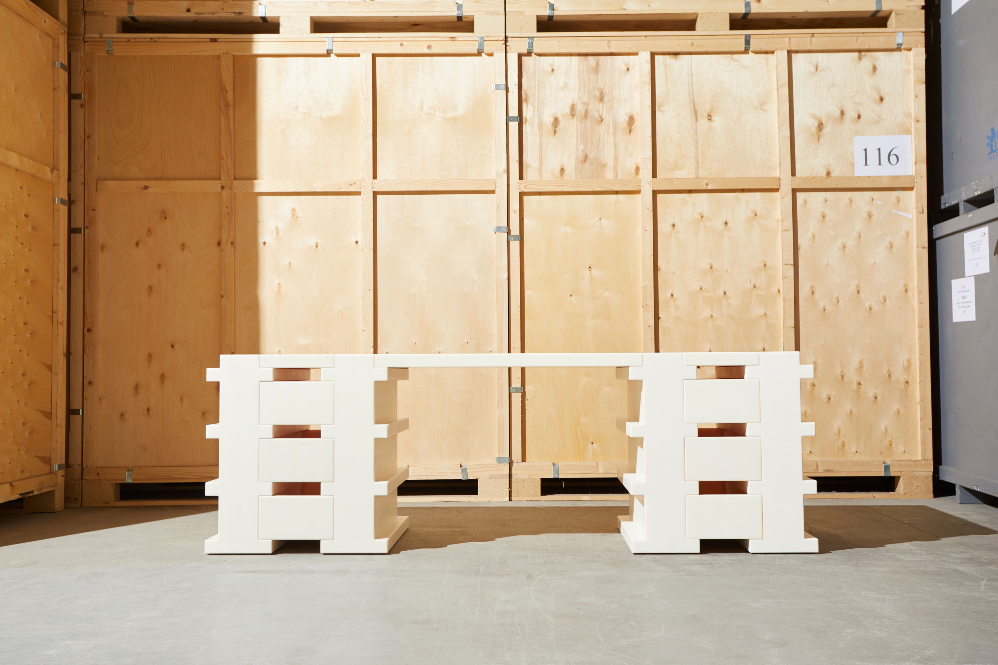 Industrial Office is an experimental exploration of executive office furniture, and a survey of his keen observations on color, scale, and materiality. Philippe manages beautifully, the complexities drawn into the histories of office furniture as it has evolved since the birth and boom of the skyscraper in the twentieth century, as he joins the industrial with objects within the executive office.