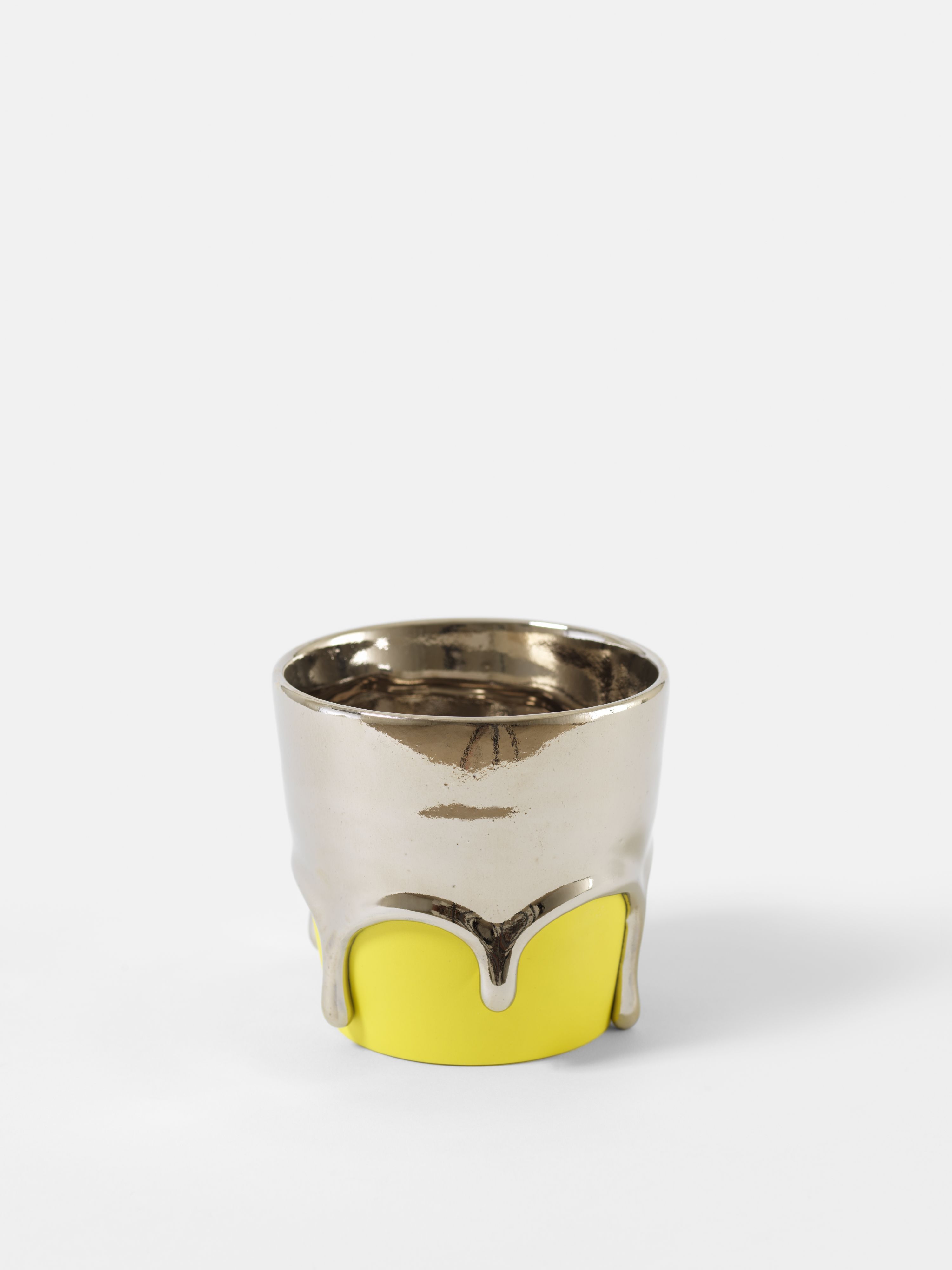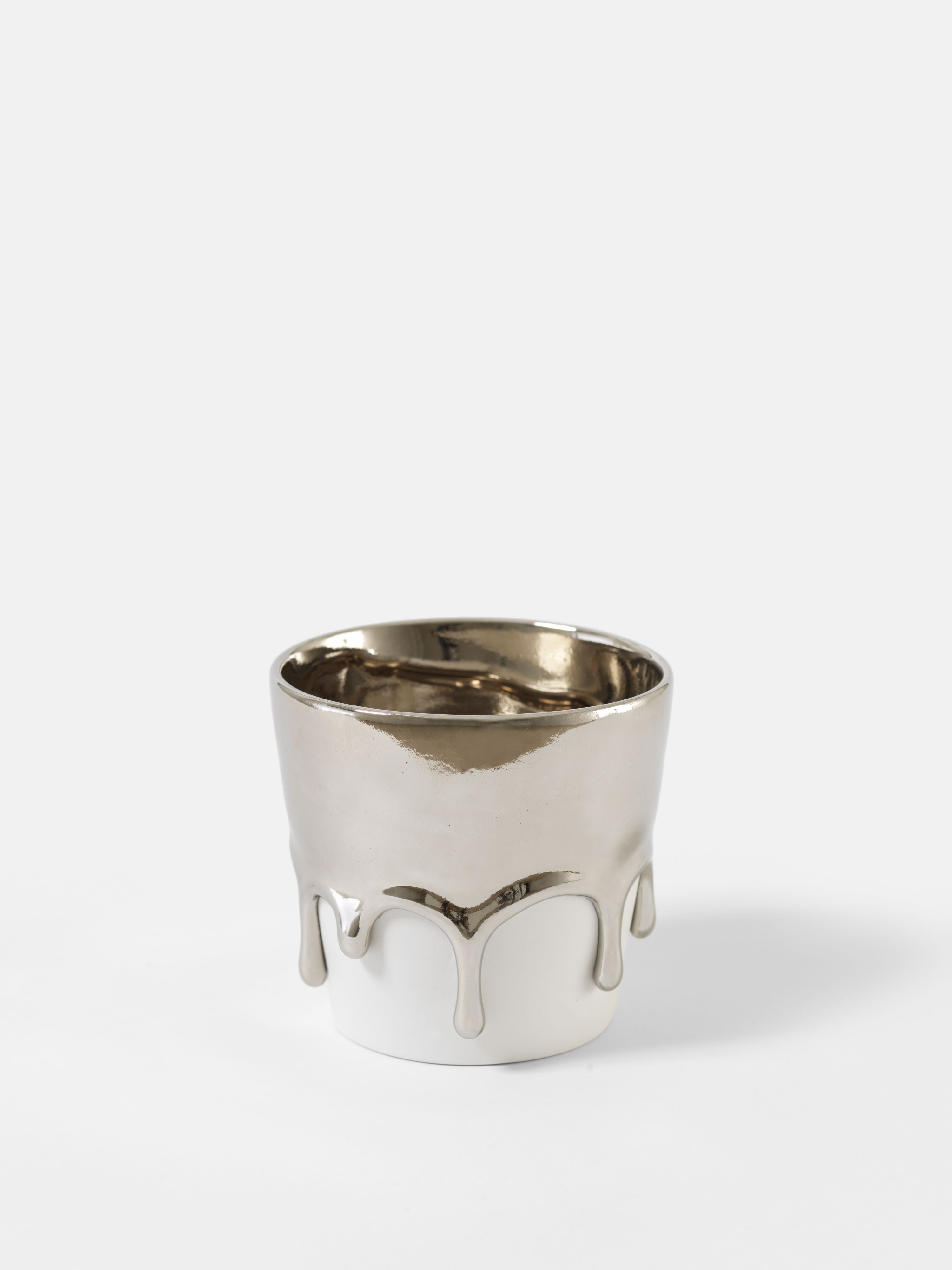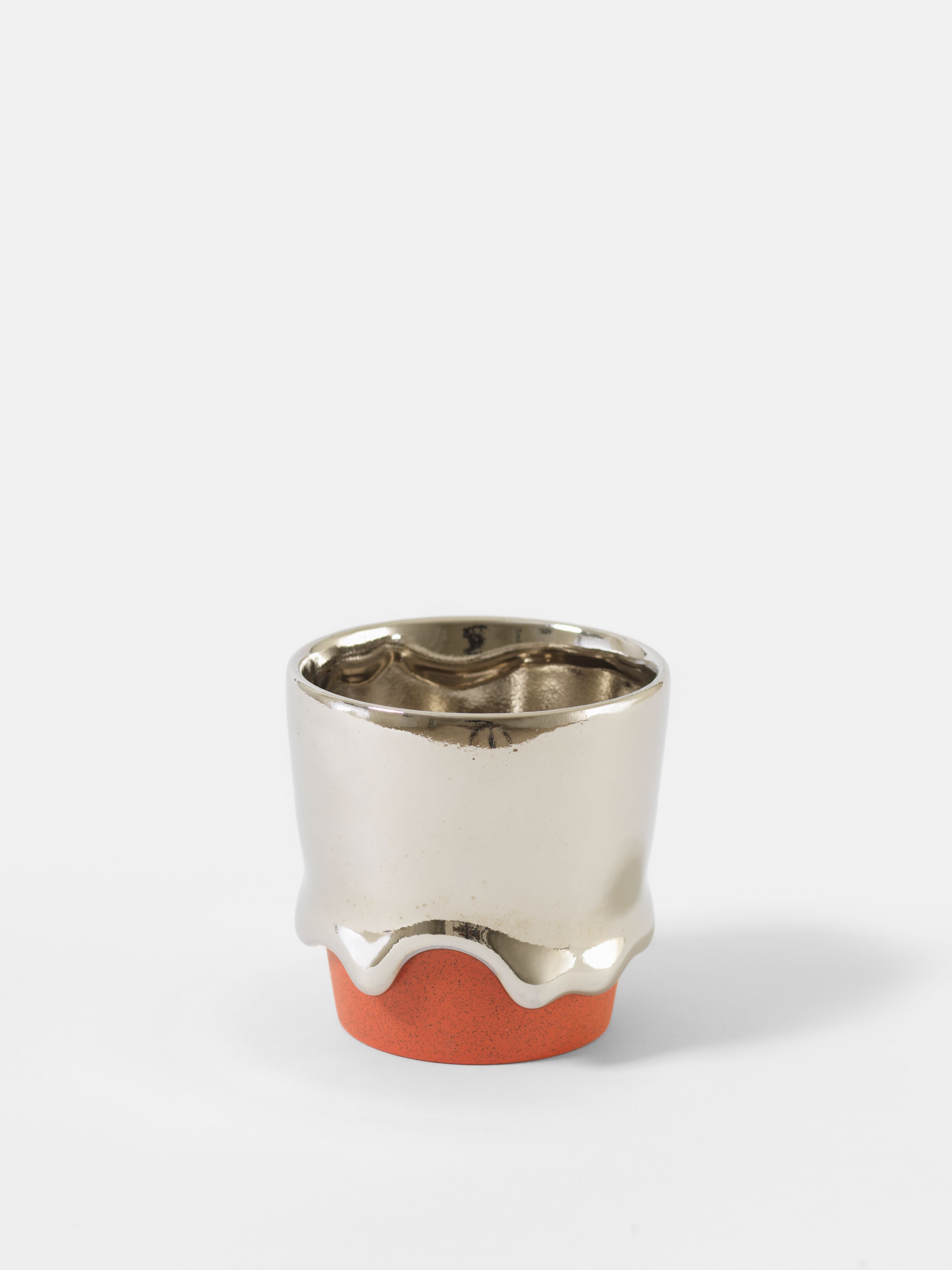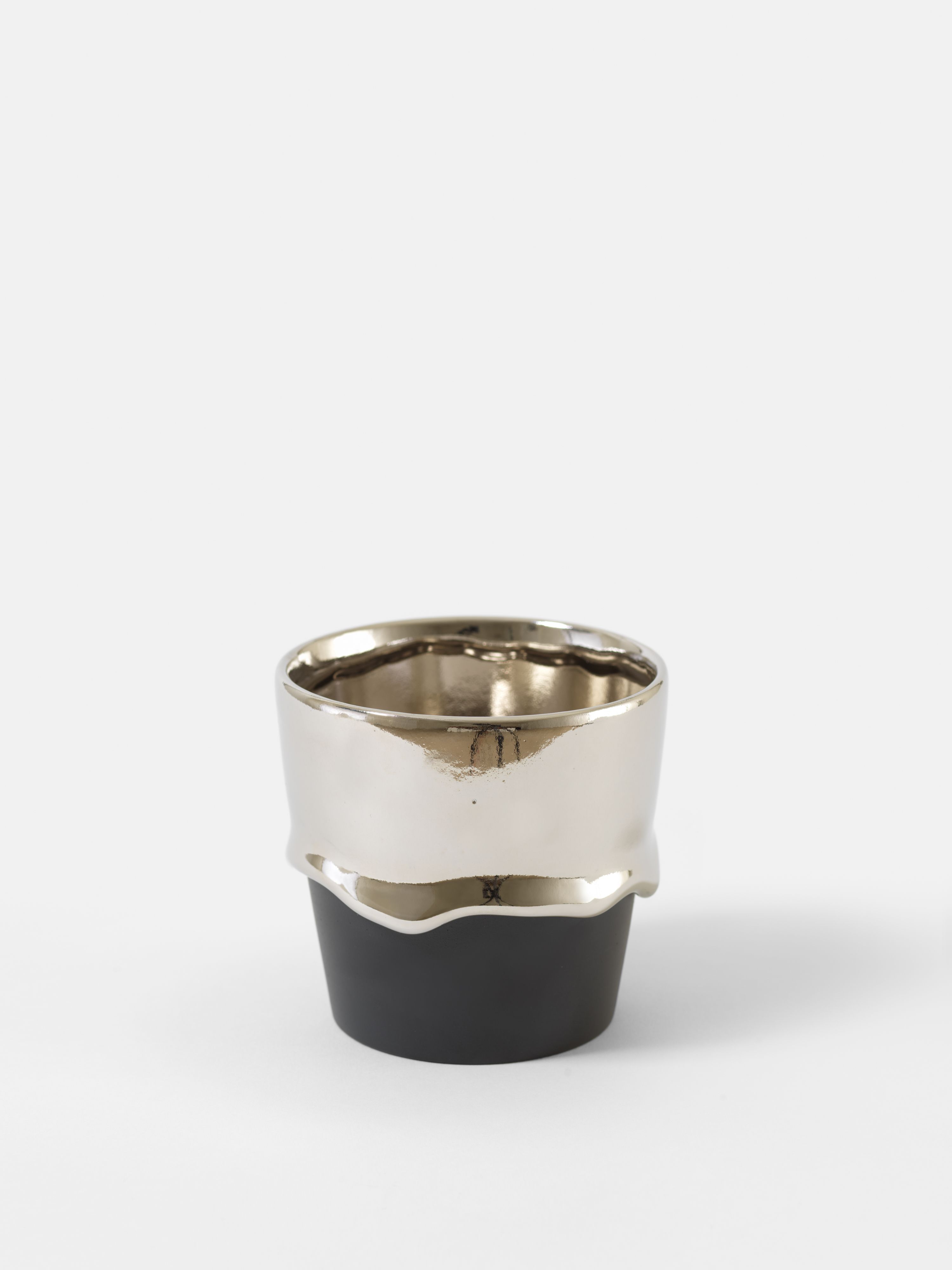 Takuro Kuwata’s cups are a contemporary take on the classic yunomi, the most common type of Japanese teacup, made for daily or informal tea drinking. The word is derived from oyu meaning hot water and nomu meaning to drink. Each of Kuwata’s yunomi cups are created with a slip casting mold to make the porcelain base, which Kuwata then individually applies over the molded cups his signature gold or platinum and seals with a shino glaze, making each cup unique. Like Judd’s Library Stool 42, each cup comes in its own tomobako box and is the most economically accessible object in his repertoire.