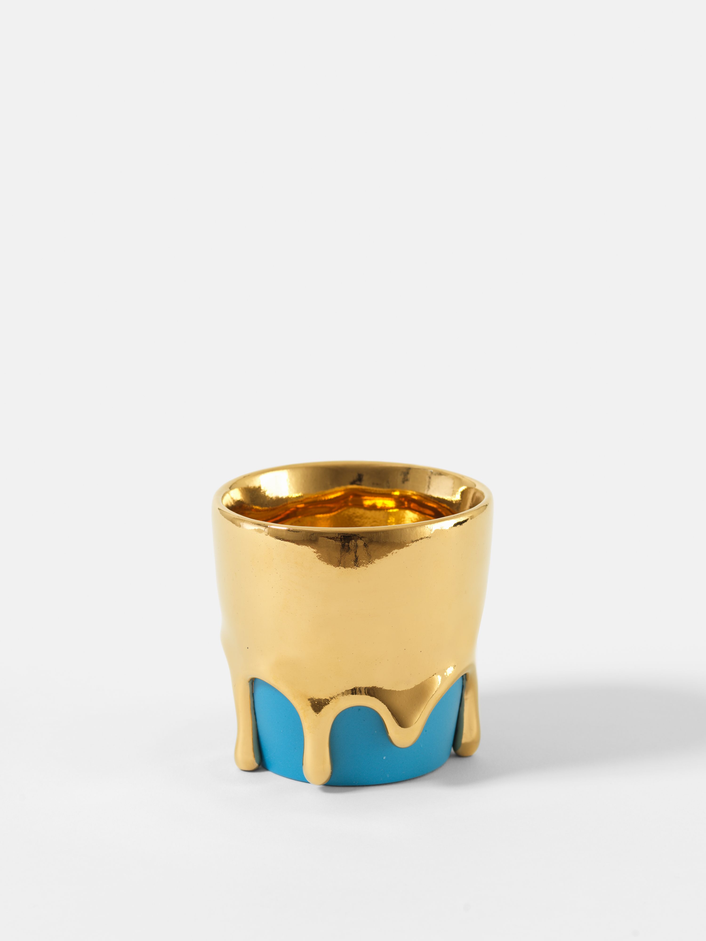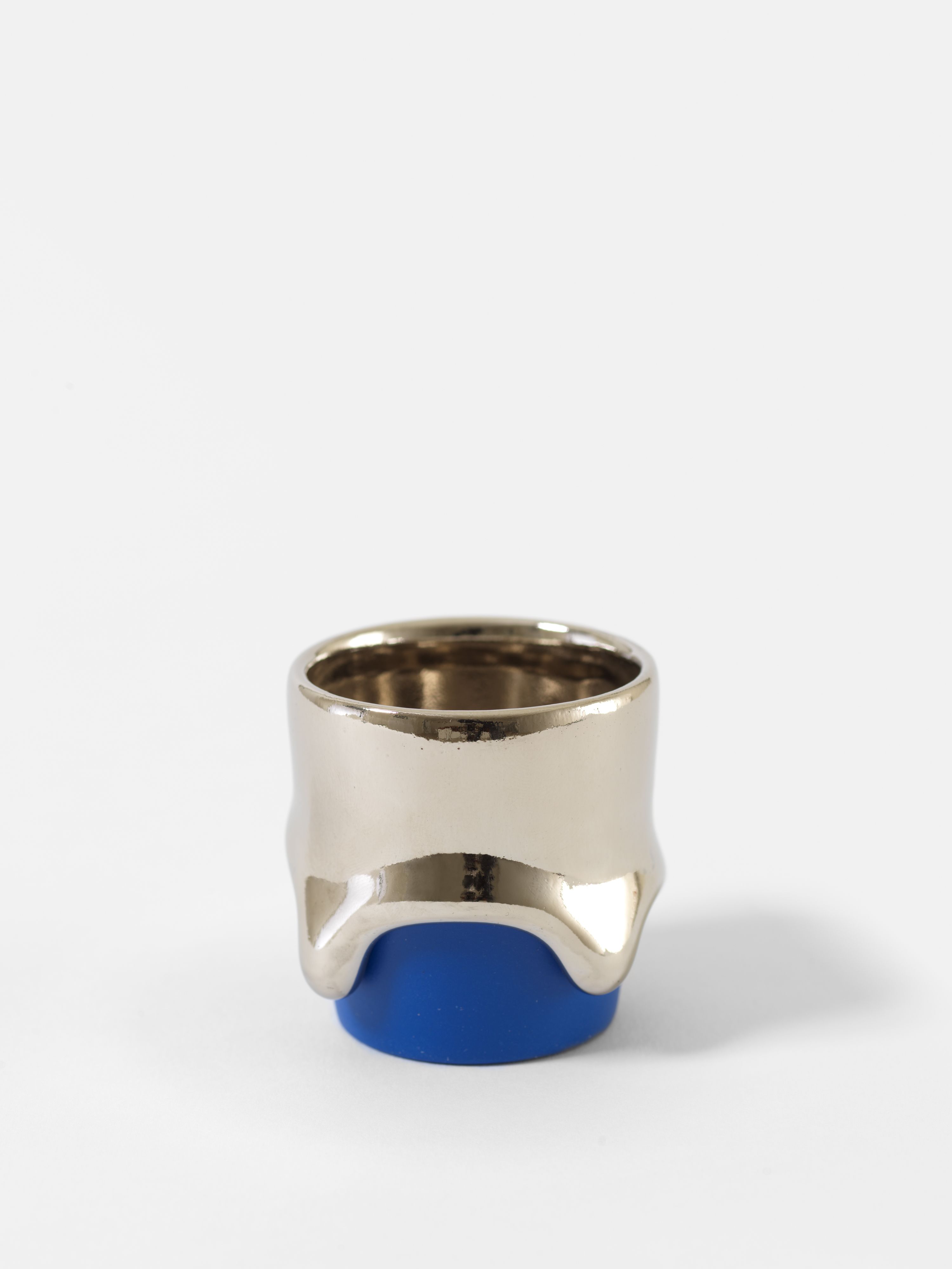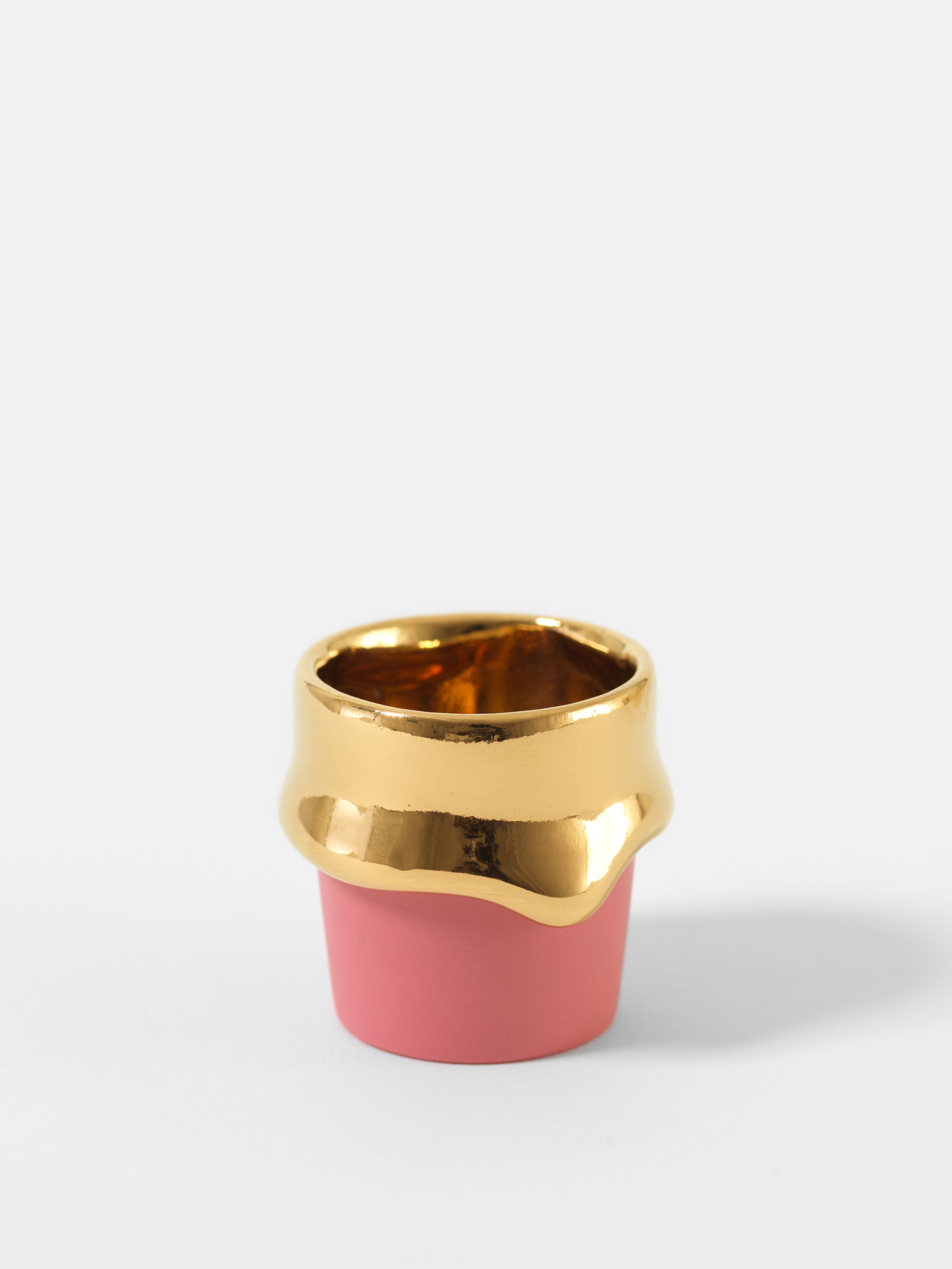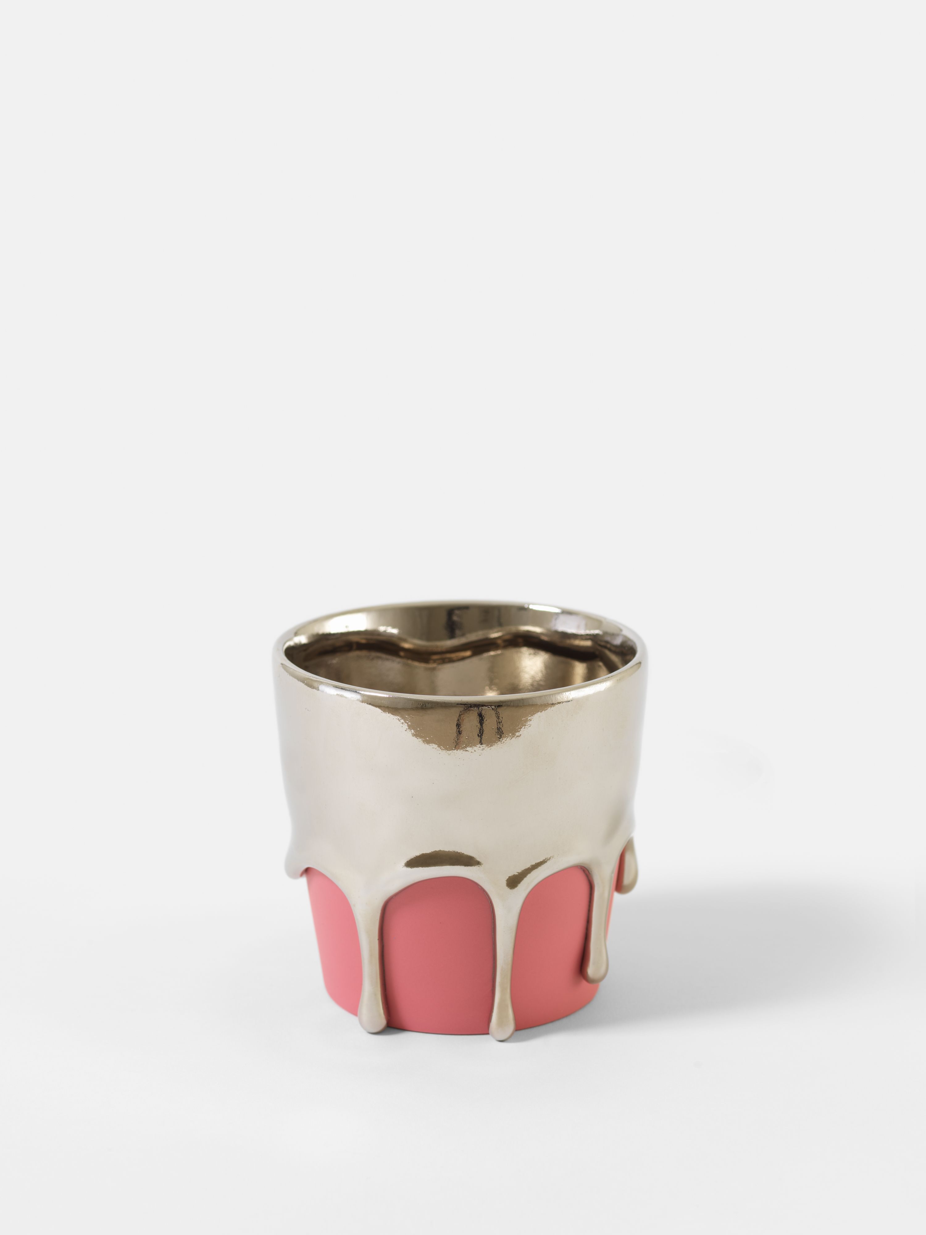 Takuro Kuwata’s cups are a contemporary take on the classic yunomi, the most common type of Japanese teacup, made for daily or informal tea drinking. The word is derived from oyu meaning hot water and nomu meaning to drink. Each of Kuwata’s yunomi cups are created with a slip casting mold to make the porcelain base, which Kuwata then individually applies over the molded cups his signature gold or platinum and seals with a shino glaze, making each cup unique. Like Judd’s Library Stool 42, each cup comes in its own tomobako box and is the most economically accessible object in his repertoire.