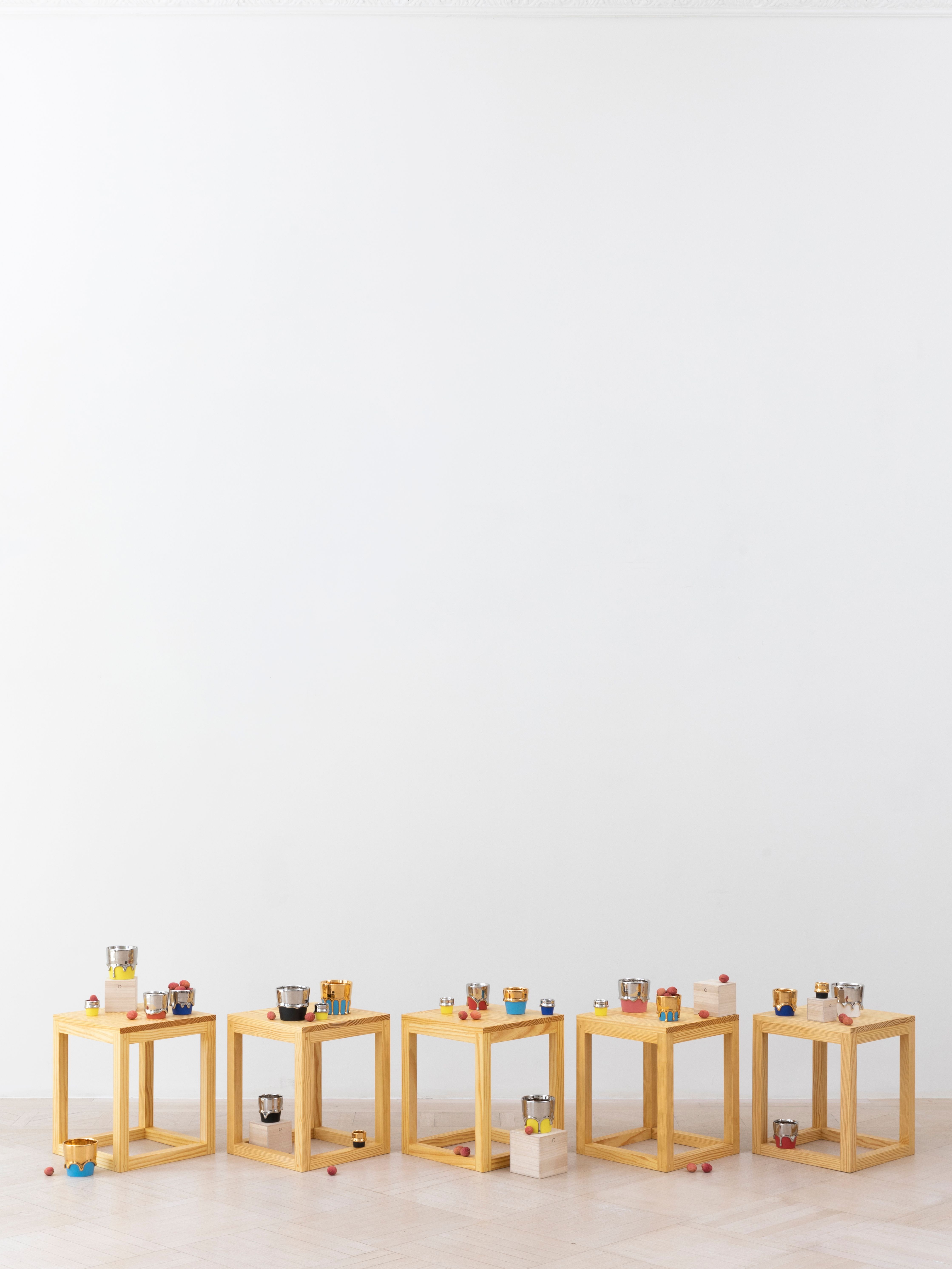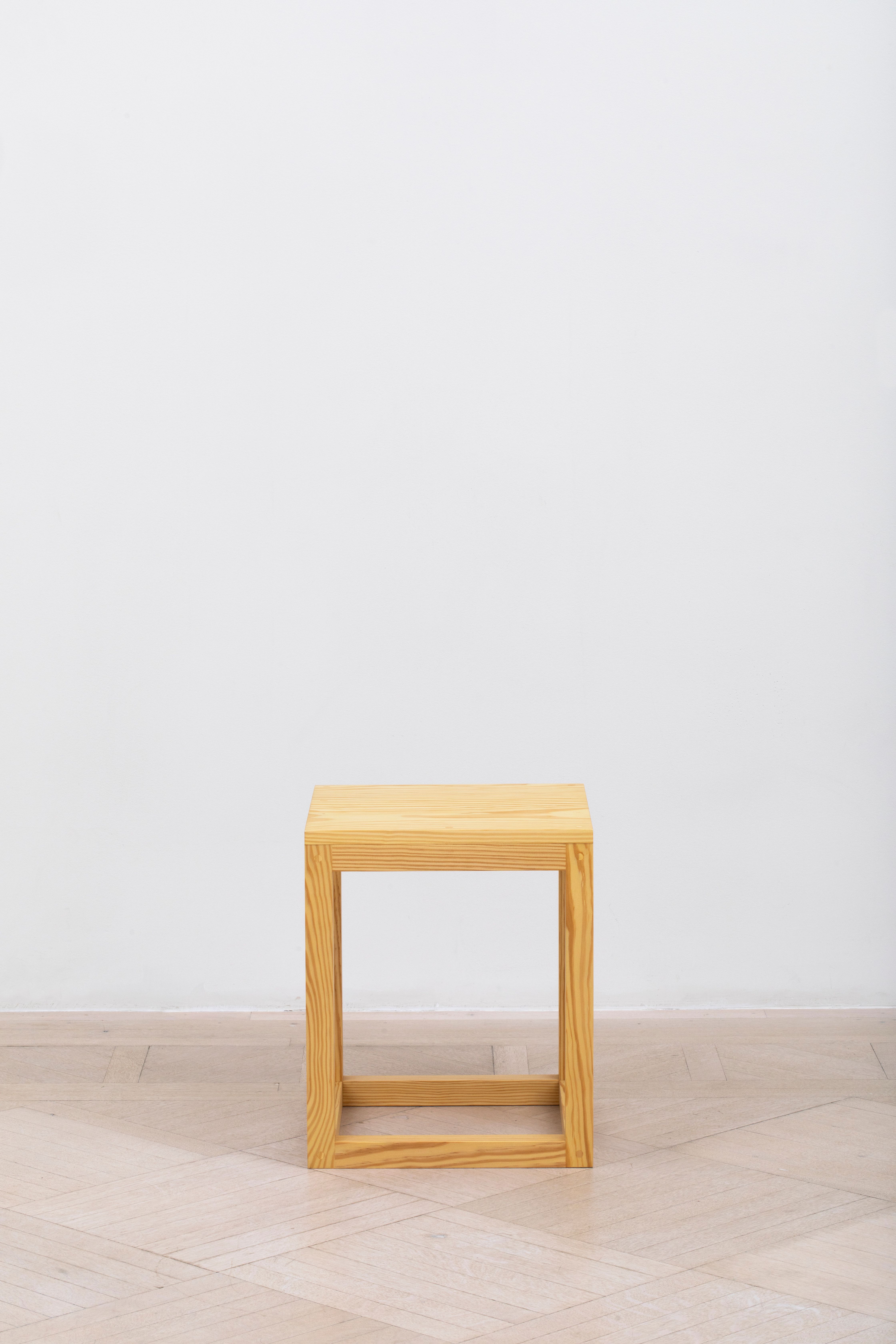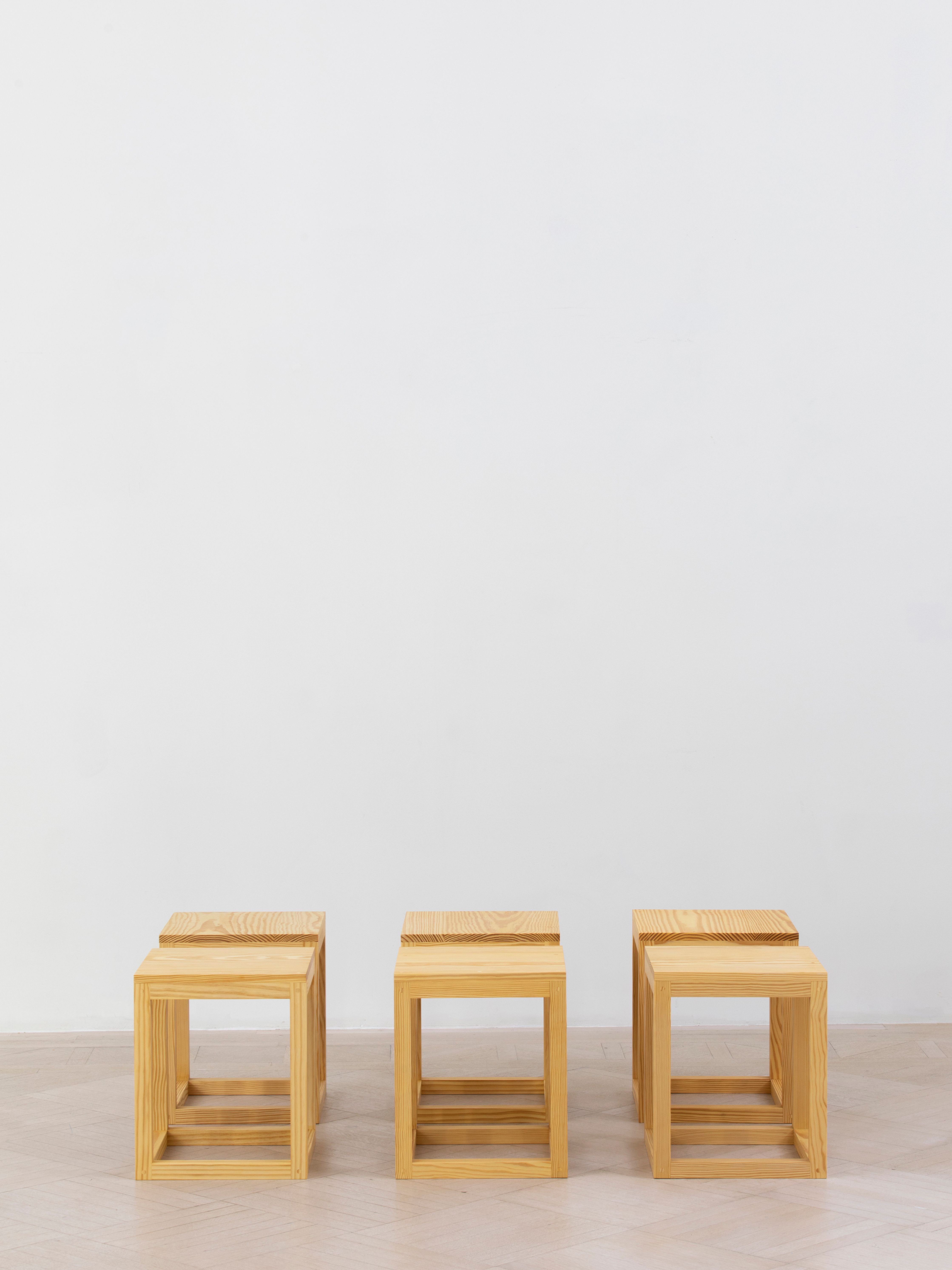 This presentation pairs Donald Judd’s Library Stool 42, with ceramic cups and vessels by contemporary ceramicist Takuro Kuwata.
