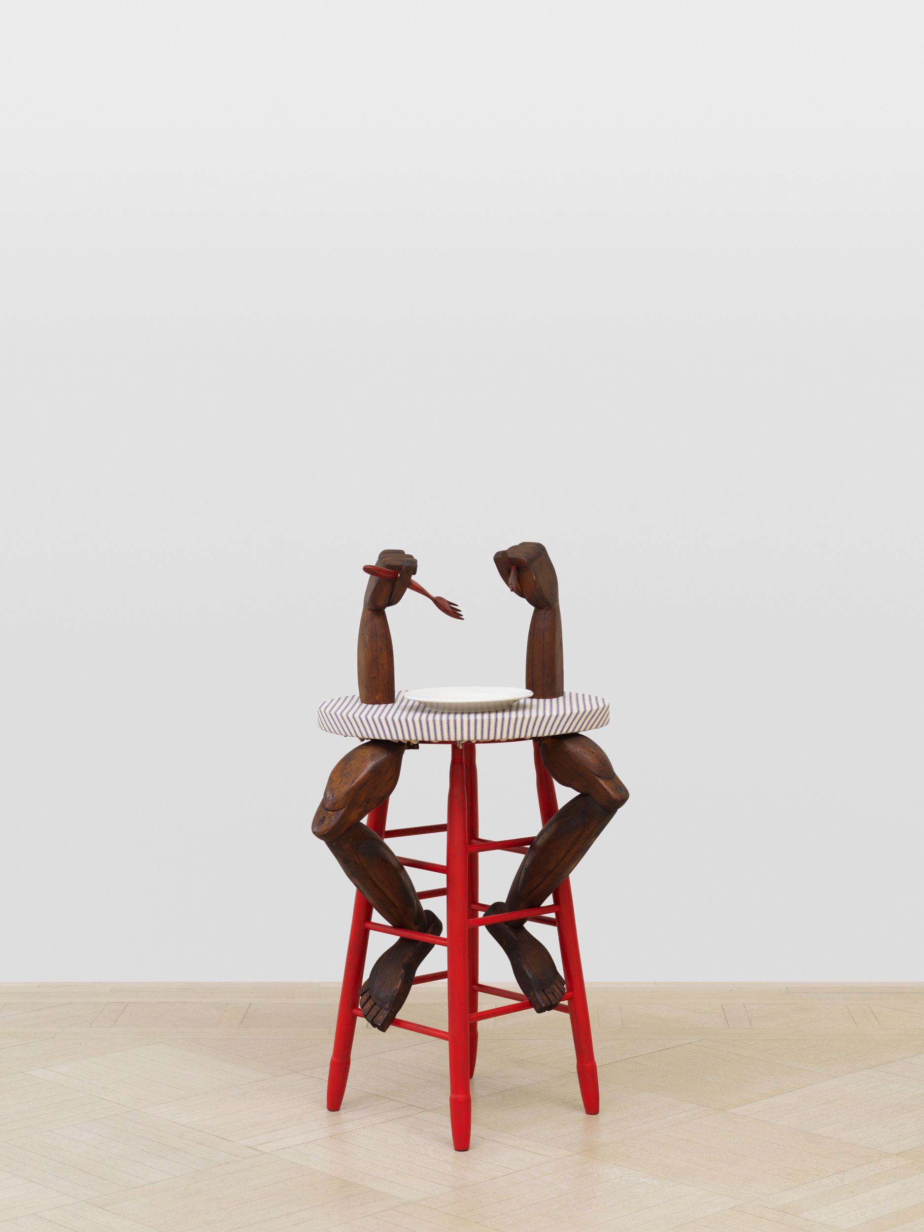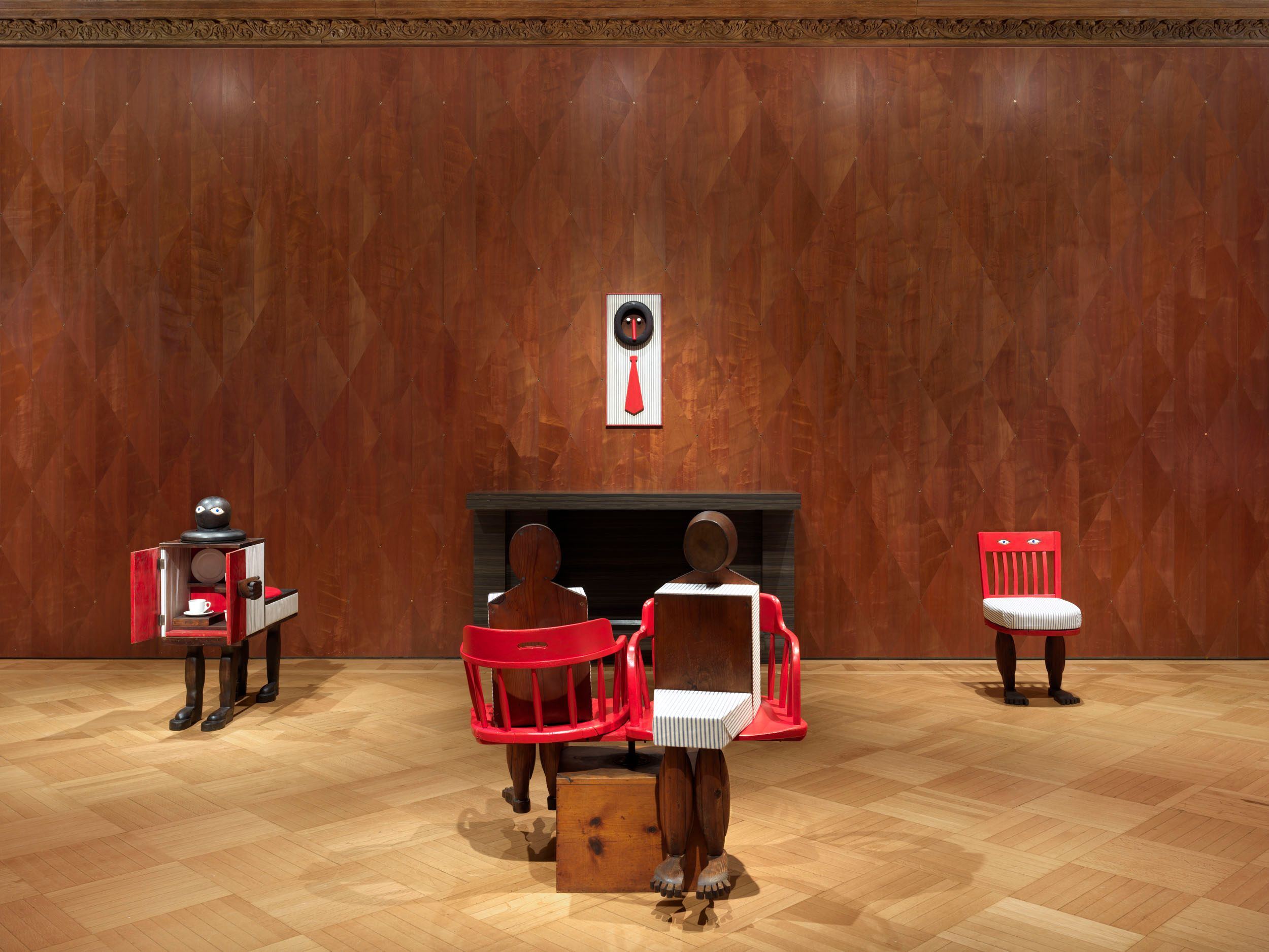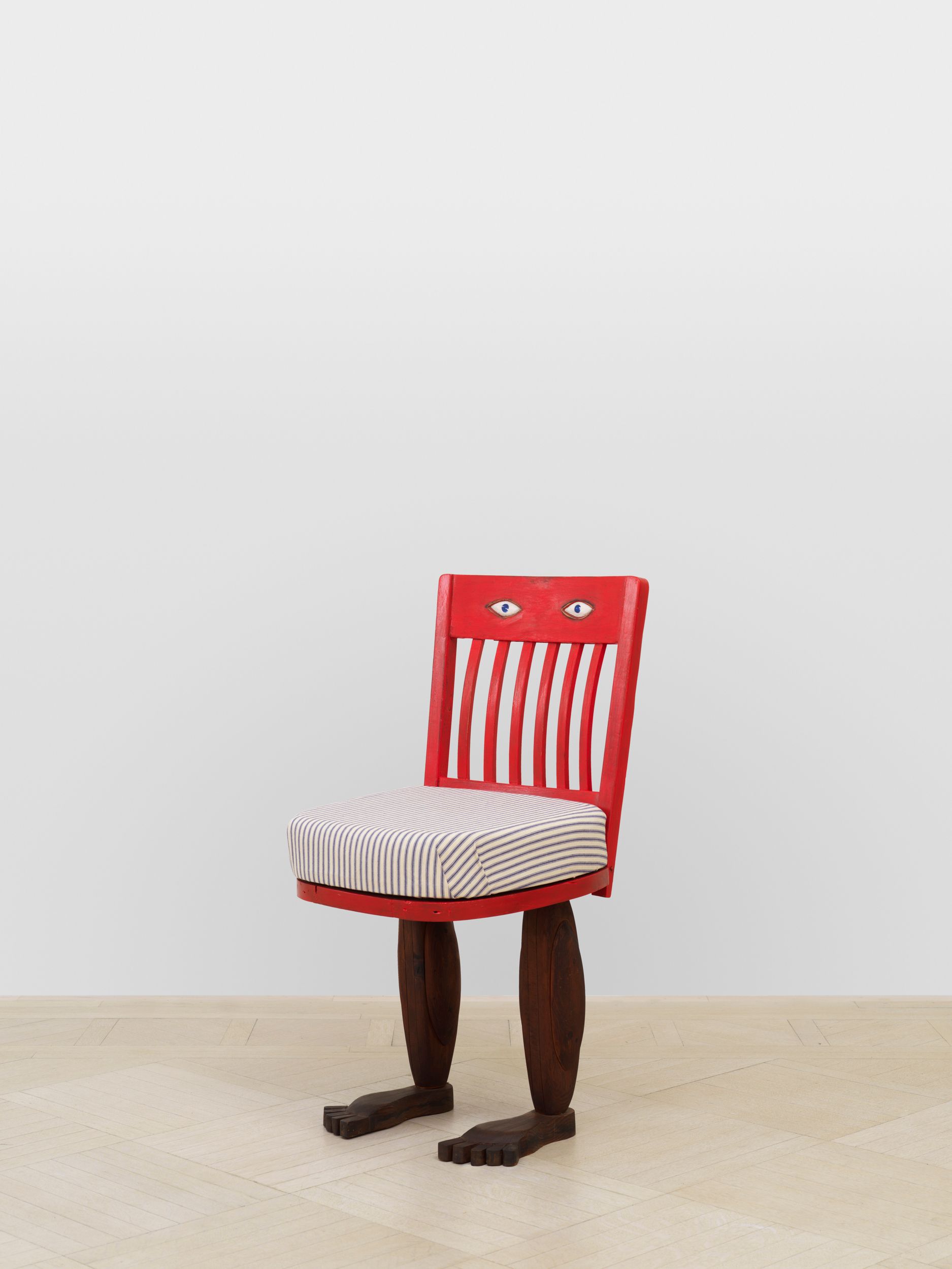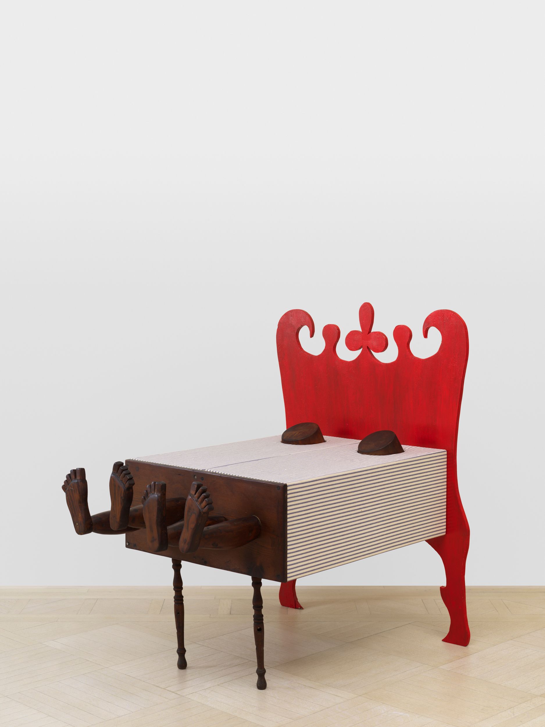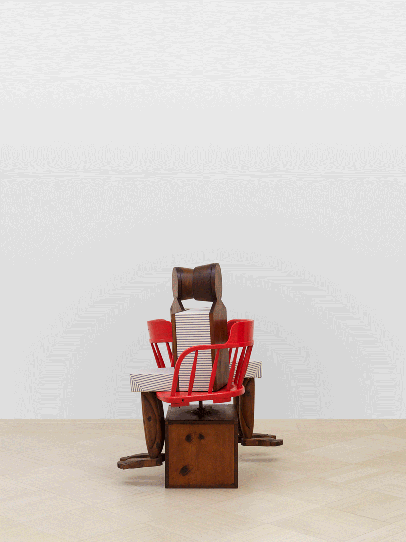 Assembled together for the first time in 50 years, Millett’s Fantasy Furniture works are hand-carved of wood, upholstered in mattress ticking and combined with found objects into anthropomorphic sculptures resembling domestic furniture; Chair, 1965 stands on two feet; Blue Eyed Marble Box, 1965, a cabinet of curiosities, peers out from a head with two blue eyes; Bed, 1965 with two sets of legs and heads protruding, suggesting a scene of two resting partners.