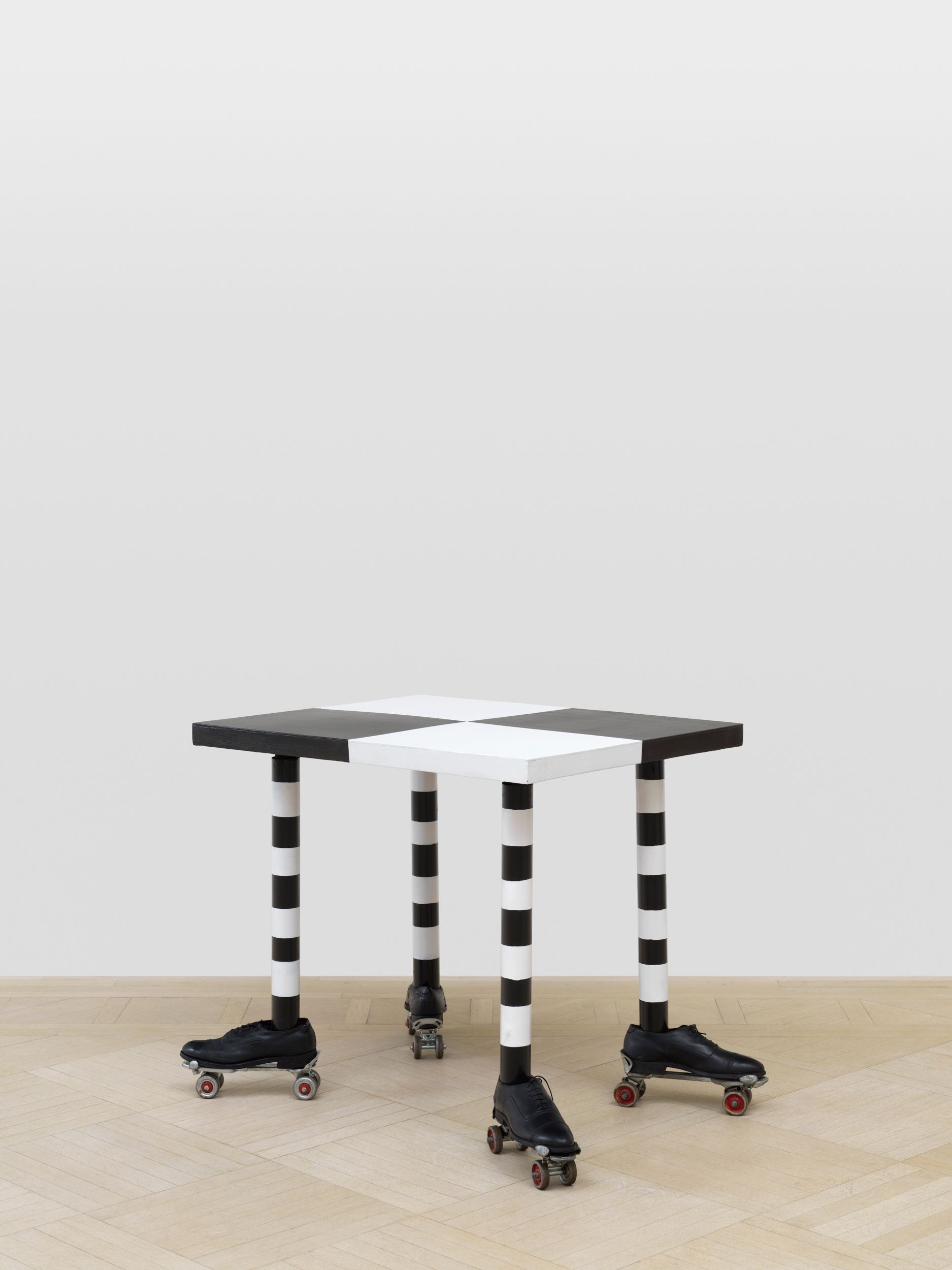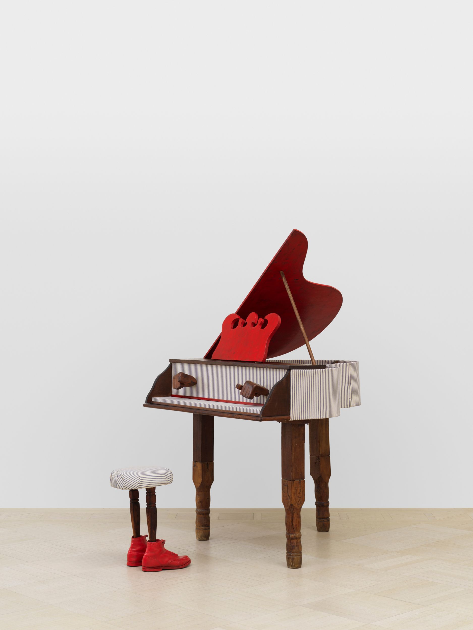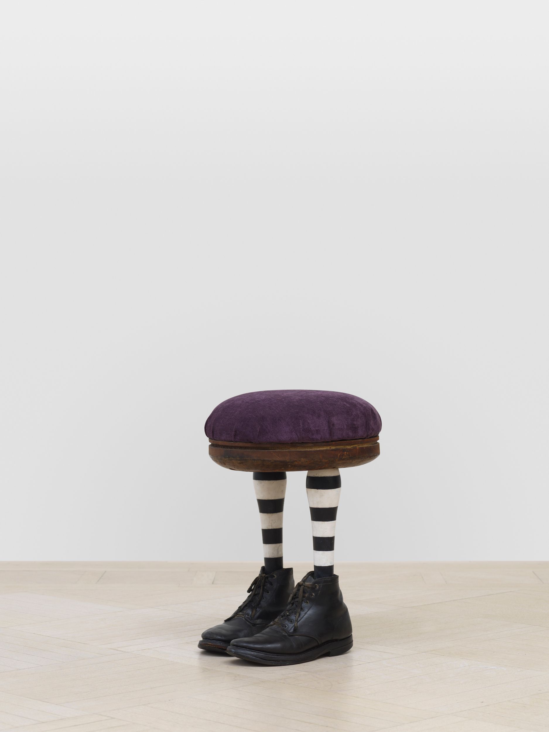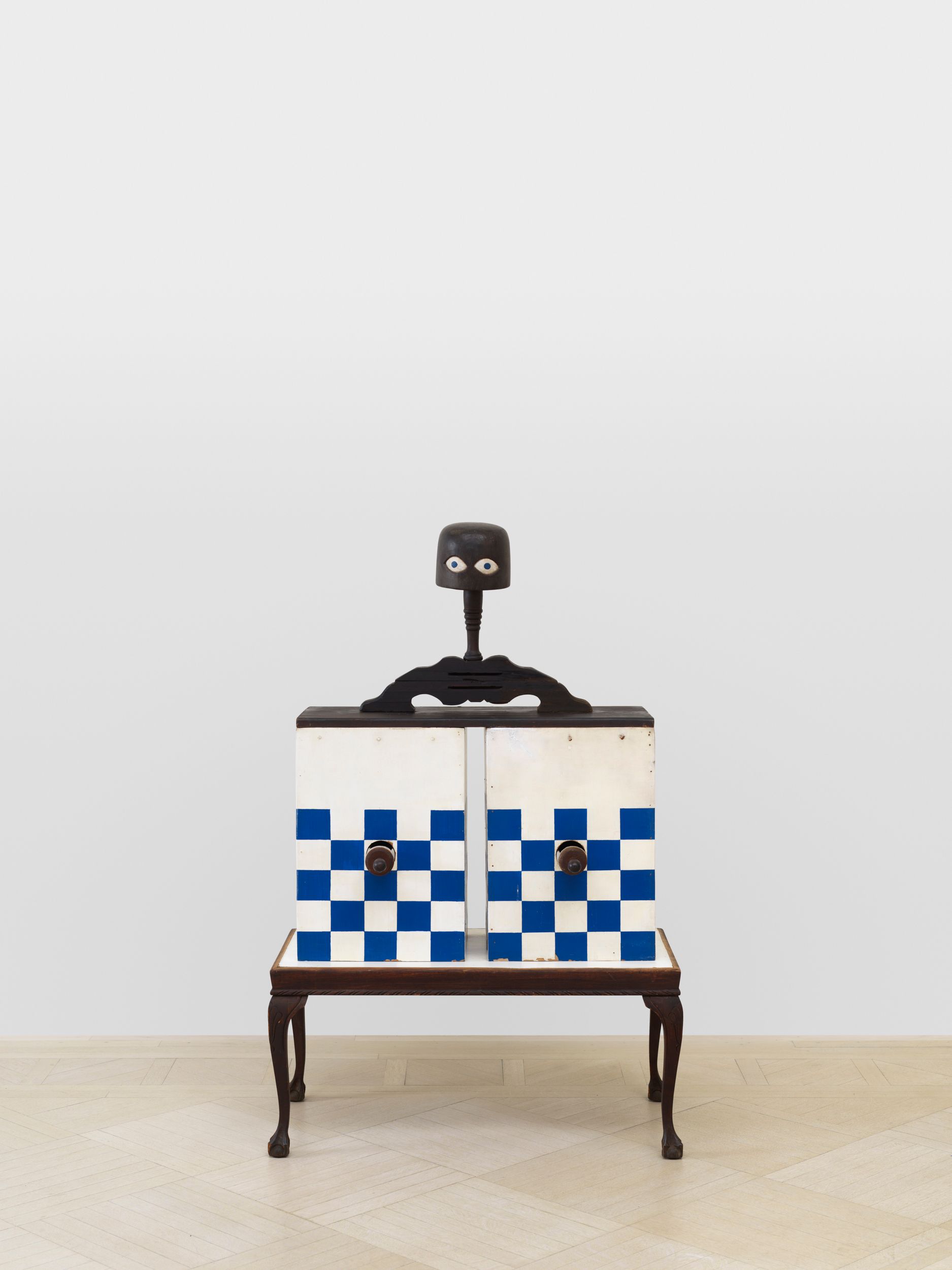 Assembled together for the first time in 50 years, Millett’s Fantasy Furniture works are hand-carved of wood, upholstered in mattress ticking and combined with found objects into anthropomorphic sculptures resembling domestic furniture; Chair, 1965 stands on two feet; Blue Eyed Marble Box, 1965, a cabinet of curiosities, peers out from a head with two blue eyes; Bed, 1965 with two sets of legs and heads protruding, suggesting a scene of two resting partners.