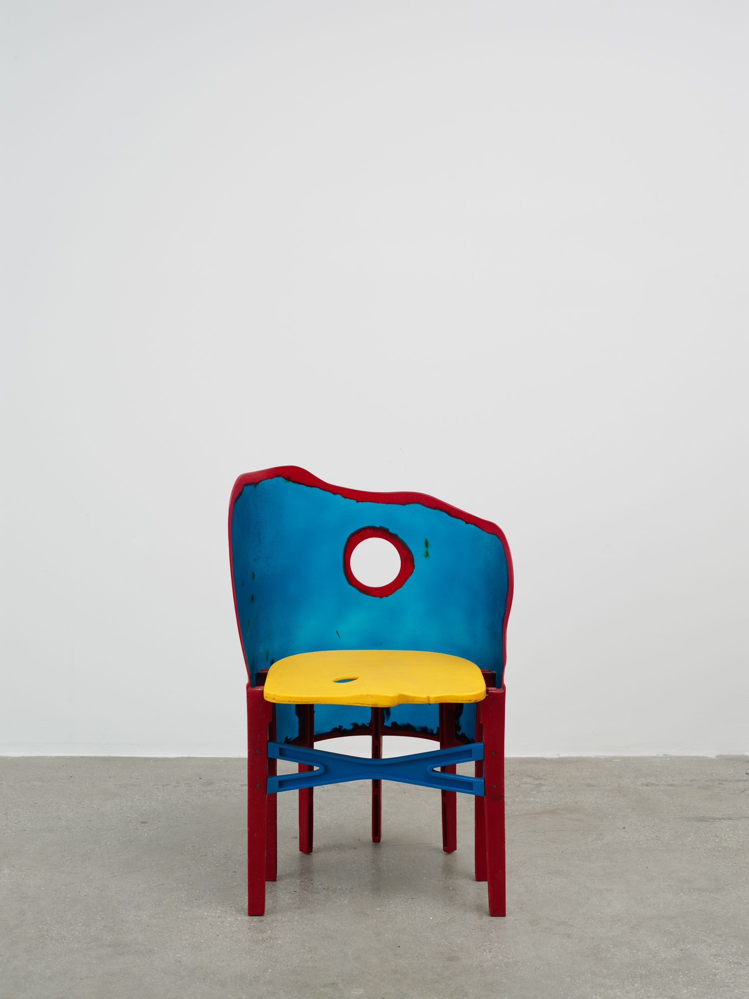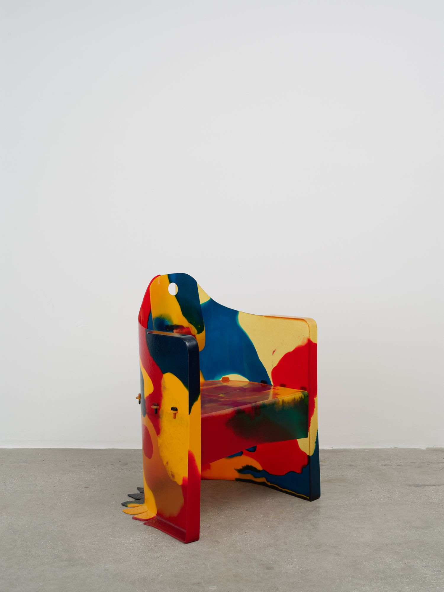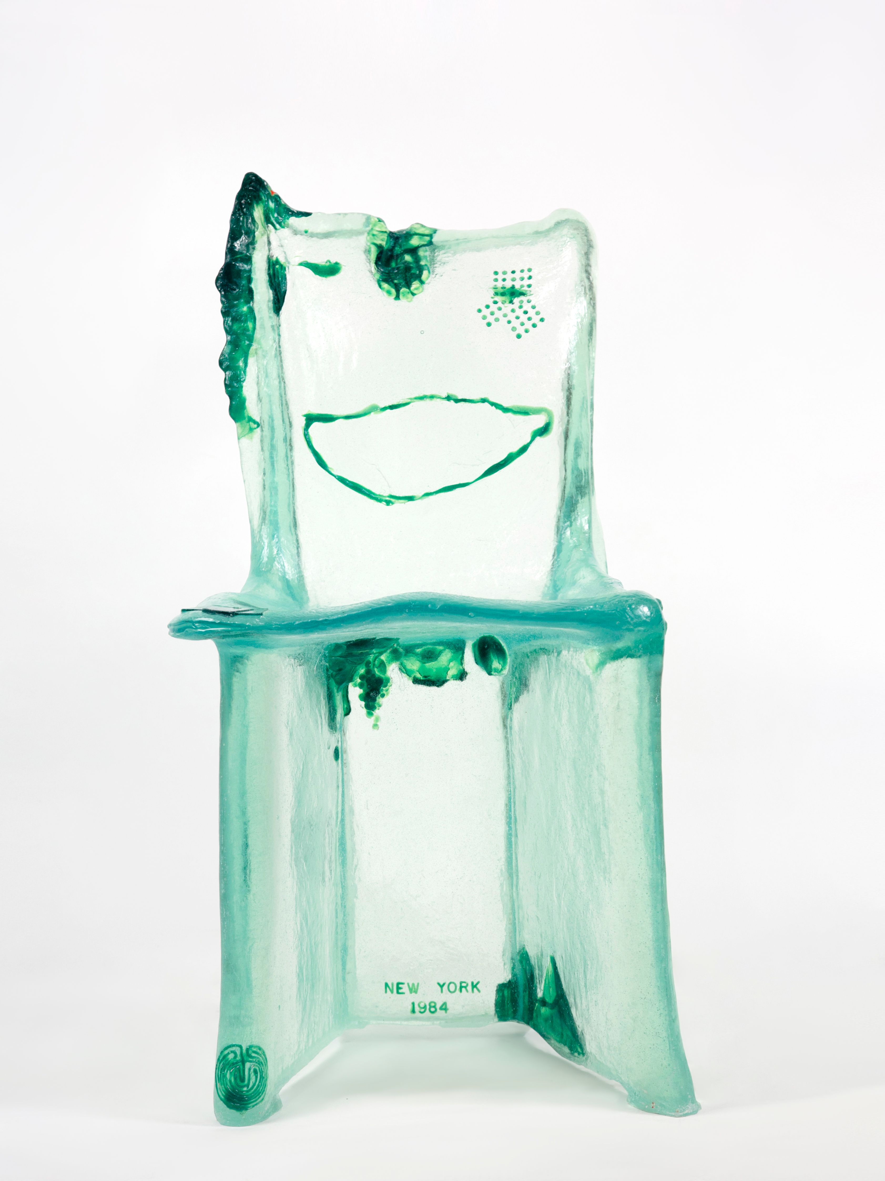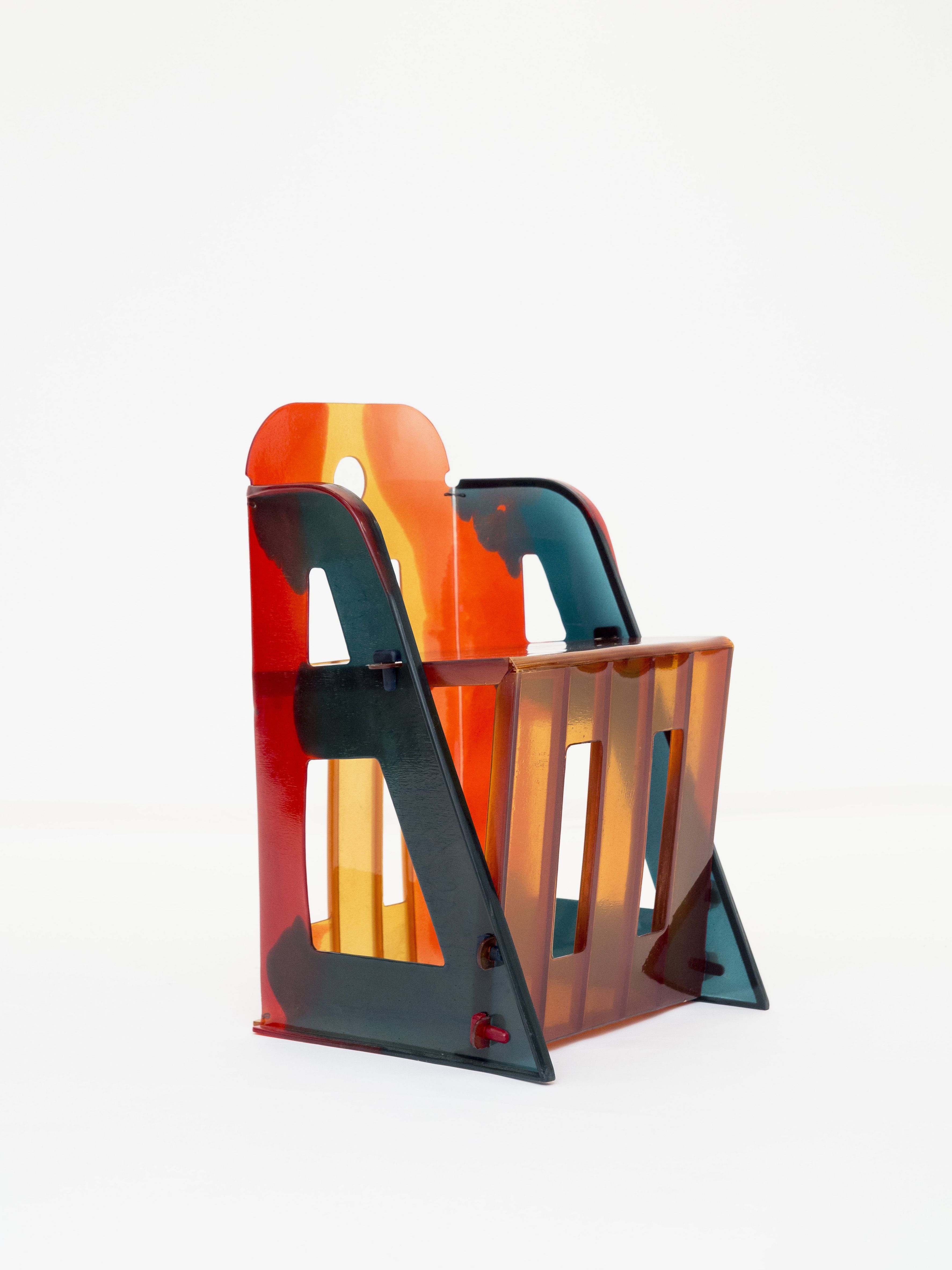 Gaetano Pesce, a true Gesamtkunstwerk artist working with all elements of art and design ranging from architecture to ornamentation and furniture. Since the 1960’s Pesce has been working primarily with resin, a progressive material which continues to elevate his practice as it has evolved over the last 50 years. Resin begins clear and viscous, and is transformed into object as Pesce adds color, form, rigidity, and content. Unrestricted by the properties of resin, Pesce has communicated narratives though his work, and has implied his own ideas and identity though these objects. The Nobody’s Perfect Chairs begin as liquid resin poured into two flat moulds, it cures into a flexible two dimensional form, which is folded and pinned into place to become functional. The title and various portrait styles of this chair suggest that each user is unique, that there is no singular form or shape that encompasses everyone.