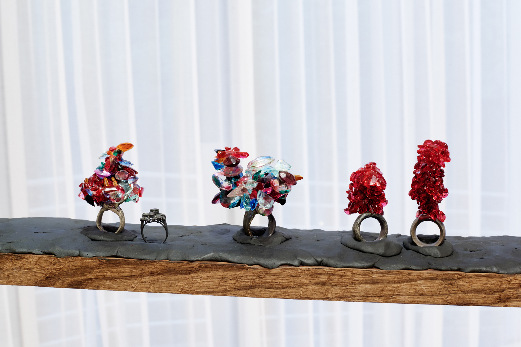 Fritsch’s rings reveal a conceptual edge and an anarchic humor that align them closer to sculpture than to jewelry. They are intricately constructed yet coarsely finished, often marked by expressive surfaces, darkened patinas and detectable fingerprints. His works combine humble and precious stones embedded in silver and niello organic masses, as if from a volcano or archaeological site. Everyday or base materials are elevated to center stage, as precious materials are degraded through processes such as oxidization. Some of his signature rings are of animals, towers of glass, and spun and cast bubblegum, and the newest, more unisex recent rings resemble prehistoric tools. Jewelry is no longer mere décor, but rather fantastical, wearable artworks.