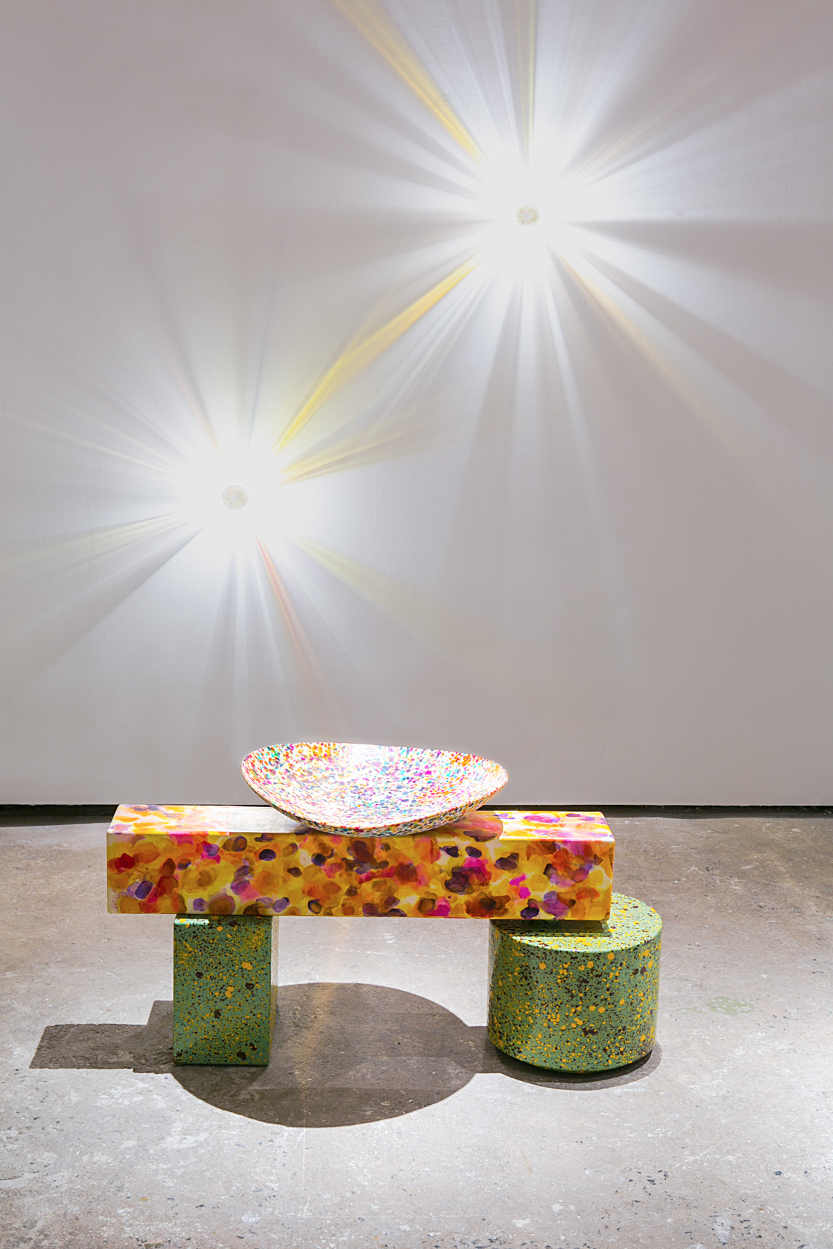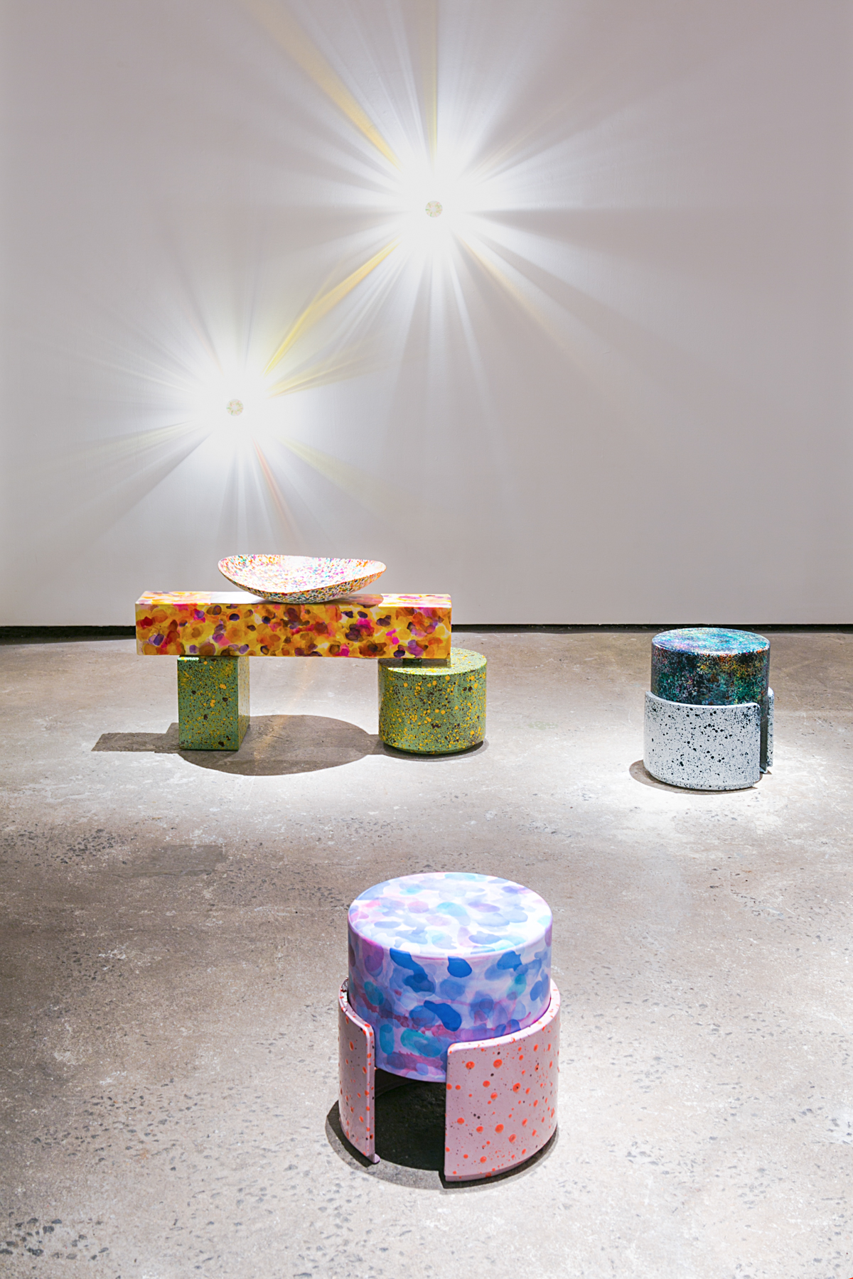 A psychedelic series of hand-painted benches, stools, bowls and lights.