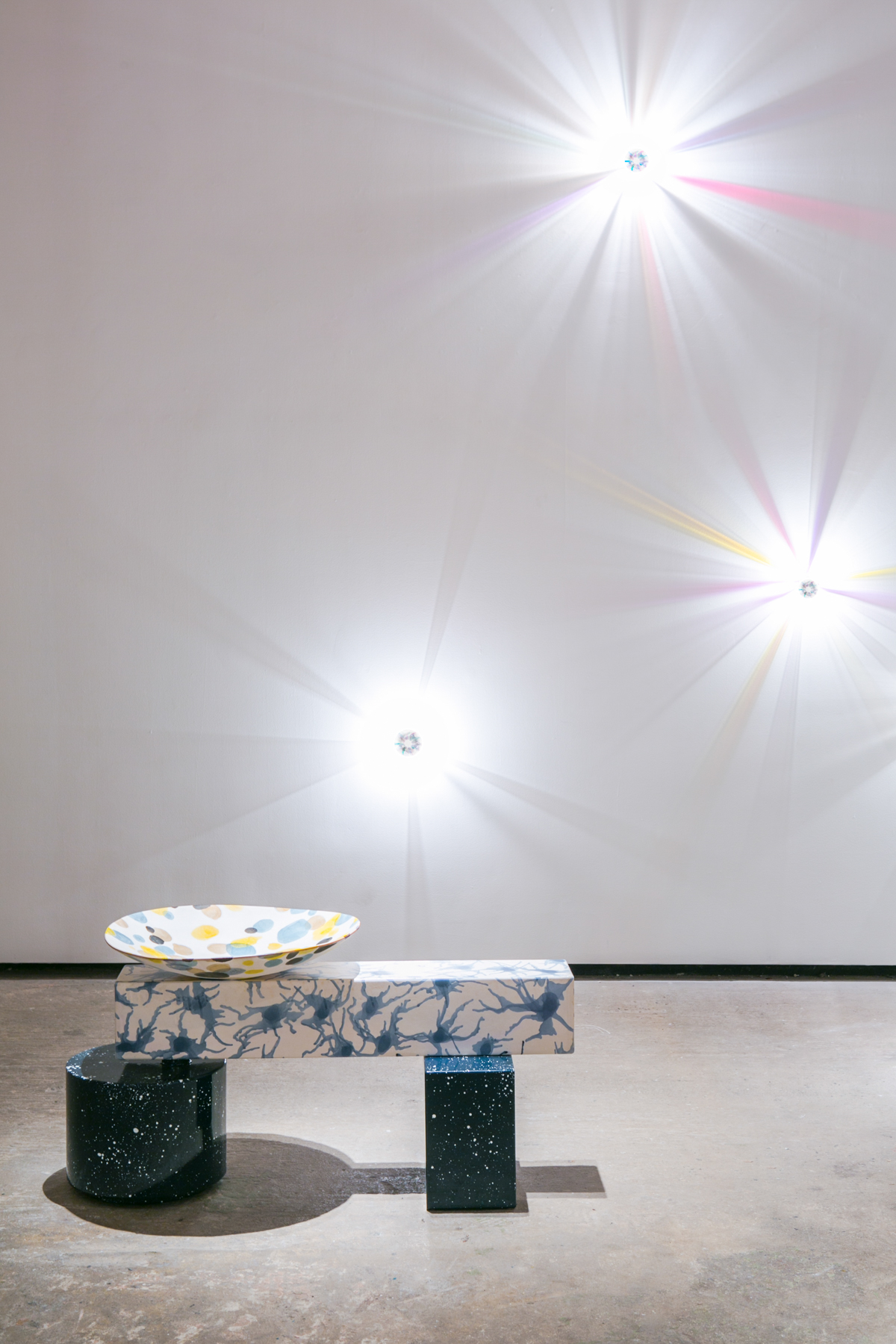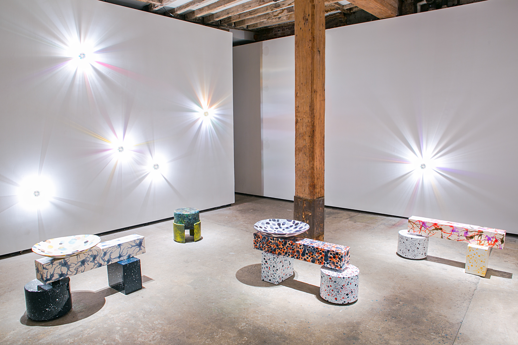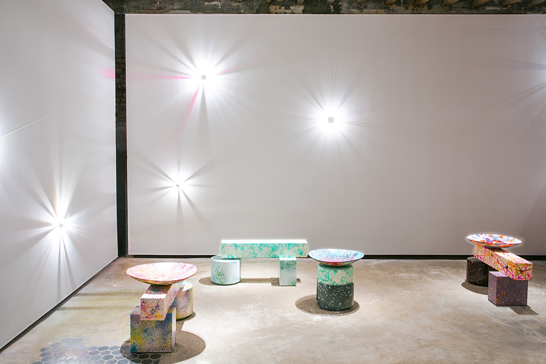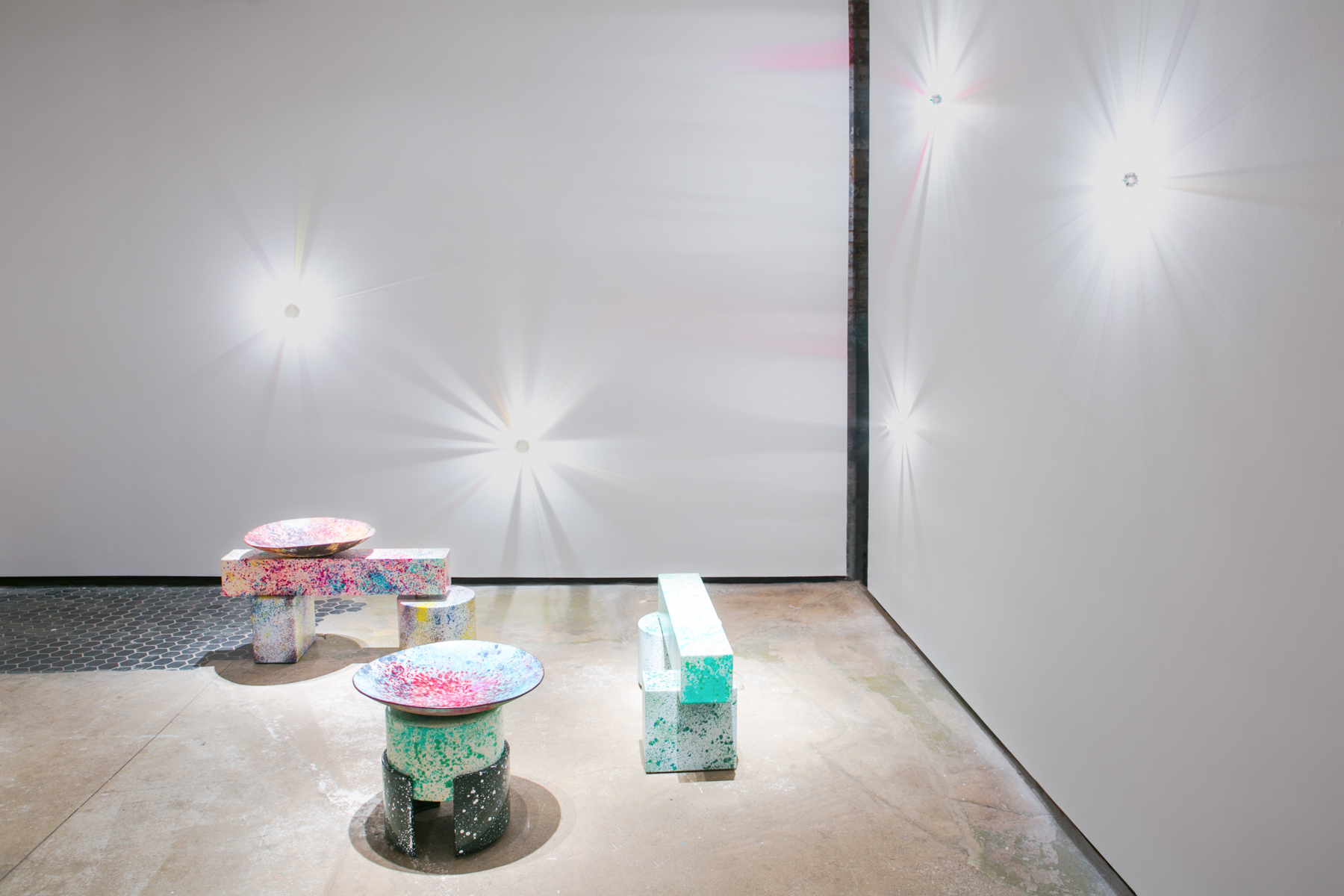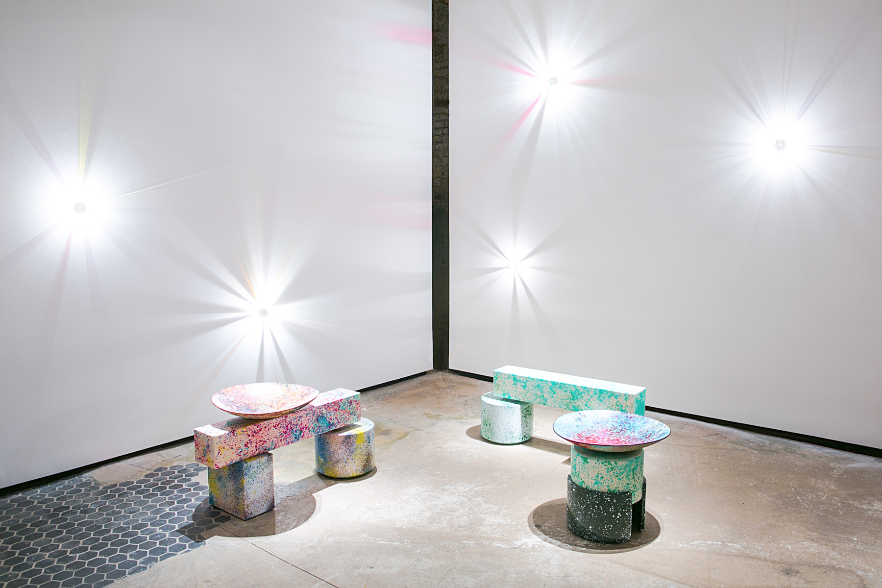 The bowls are familiar but odd, material fetish objects made only from leather. Soft and supple hide on the inside, and a stony suede for the outside. Store-bought, hand-painted lightbulbs offer an all-over light installation that mimics the overlapping stains of color. Slightly retro and trippy, like the effect of a lava lamp, the installation feature reflects their improvised process of layering color until they hit a visual combination they’ve never experienced before.