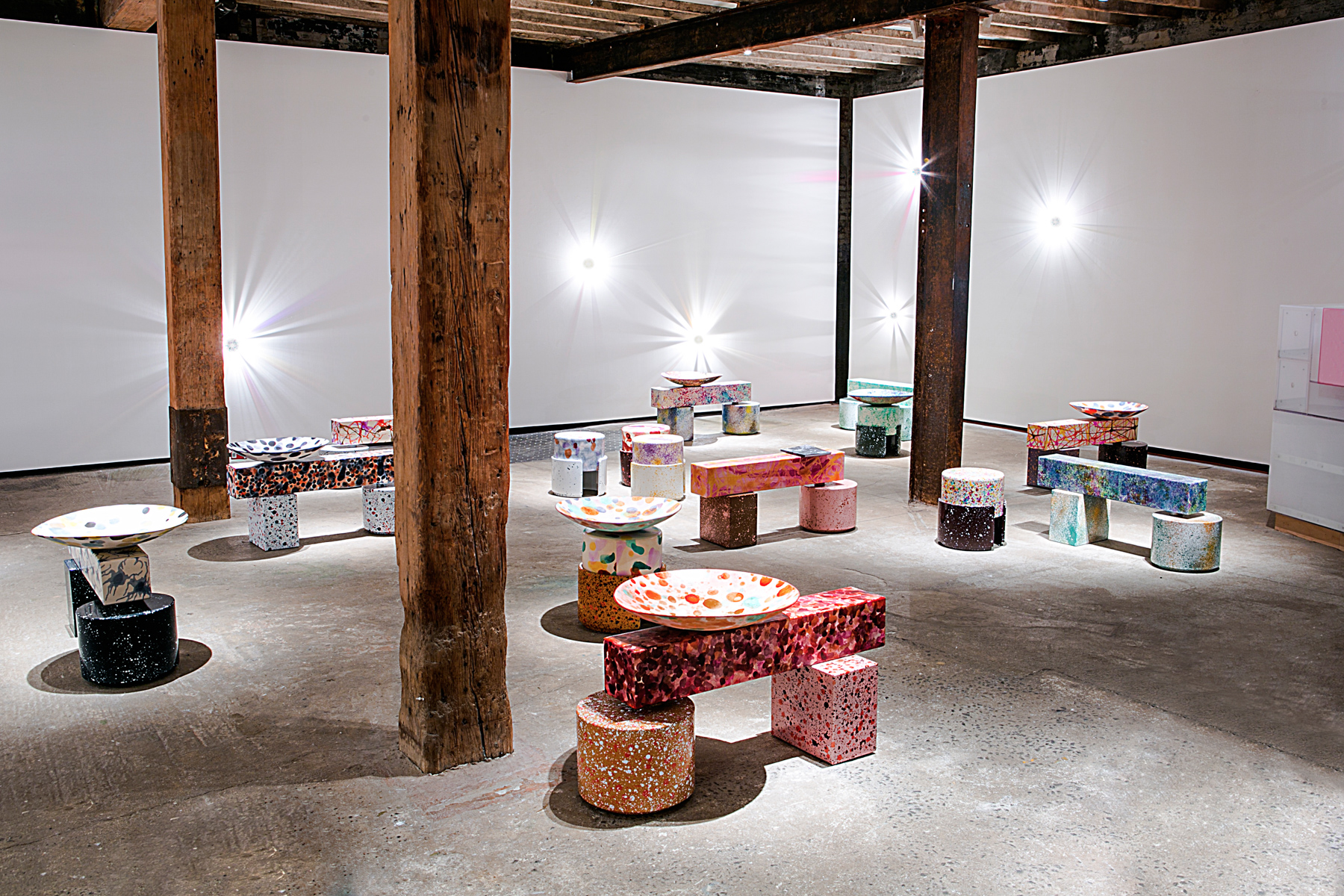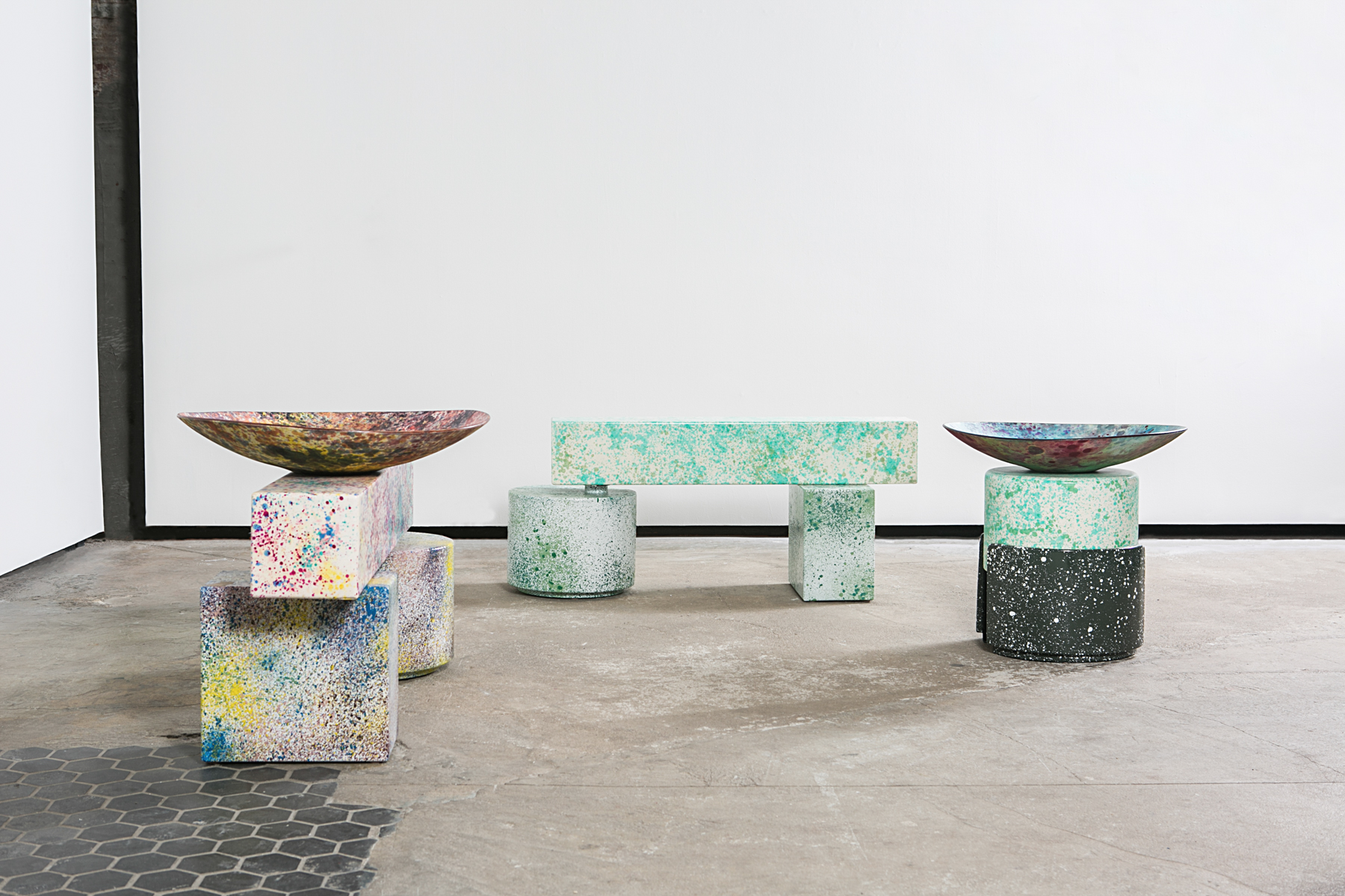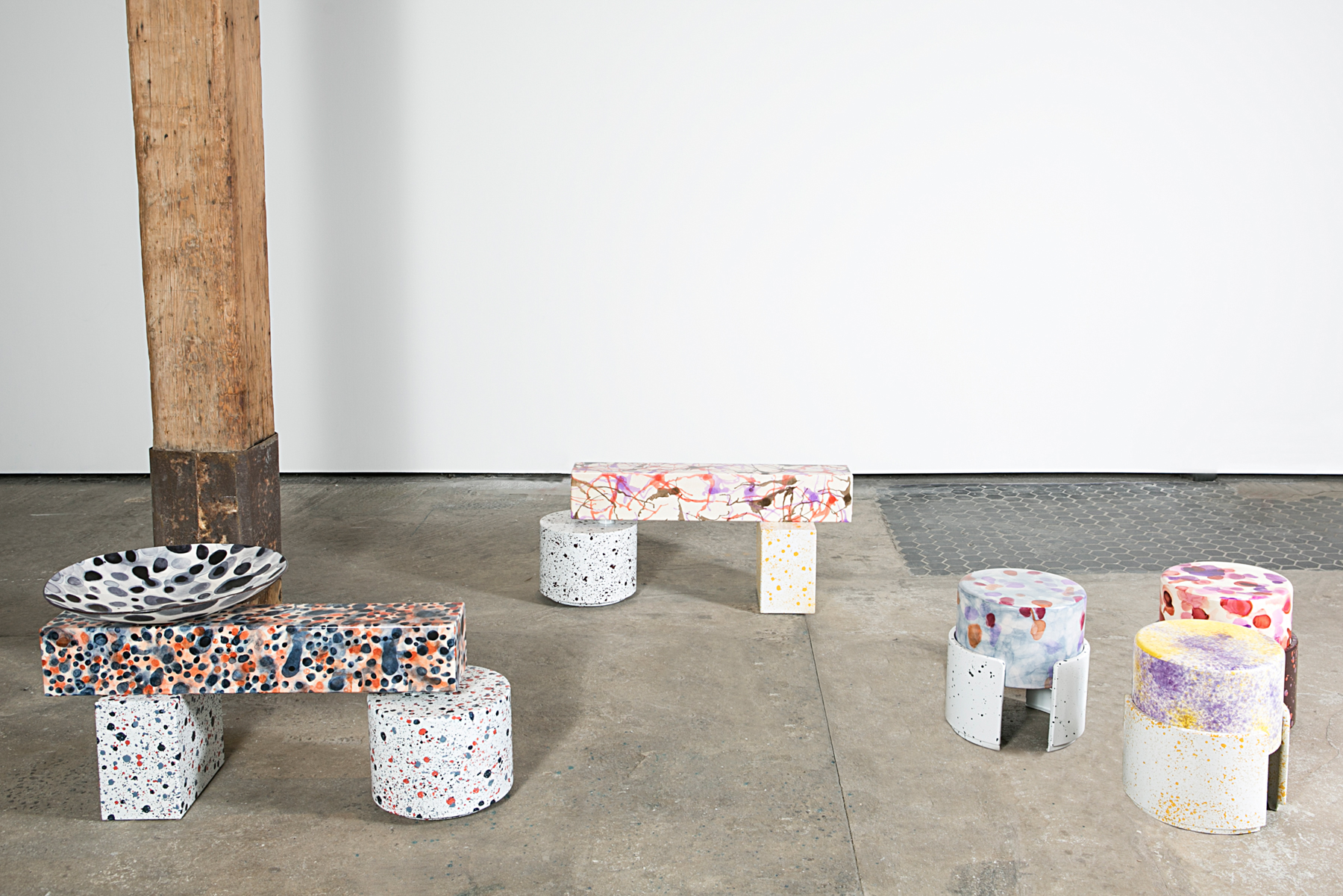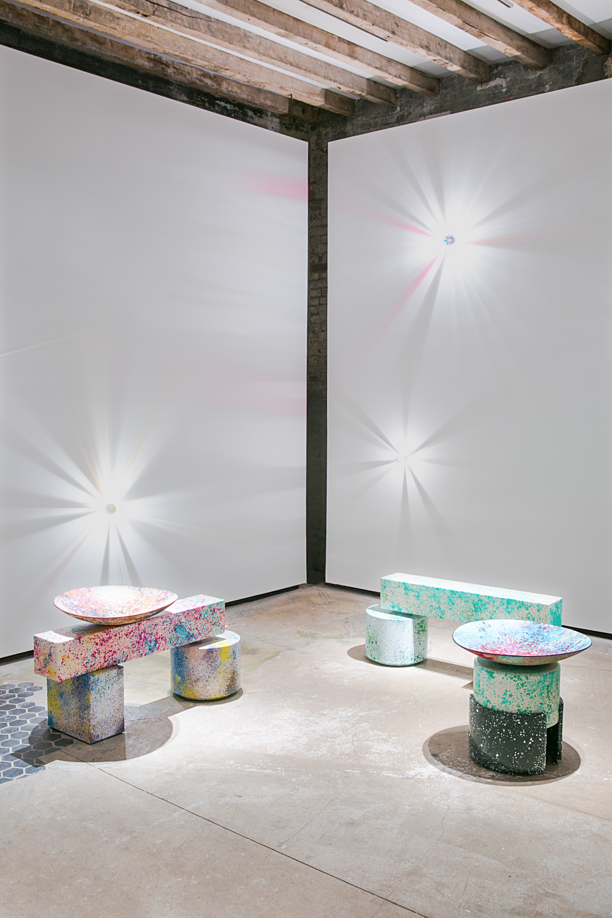 Salon 94, in partnership with Rudy Weissenberg, is delighted to present the latest collection from Swiss design duo Kueng Caputo. Never Too Much is a psychedelic series of hand-painted benches, stools, bowls and lights. The artists pair and mirror the contrasting materials of dyed leather for the seat with traditional enamel for the base. The soft Italian leathers are used in a hard way, wrapped around a metal drum. The skins are naturally dried and tanned, then splattered and sprayed with organic vegetable stains. In contrast to the “wet” process of staining, each color in the enamel is fashioned from a metal coating, independent layers baked-on separately and methodically, resulting in a complex and deep surface texture. The dynamic works celebrate process experimentation, material play, and exuberant color.
