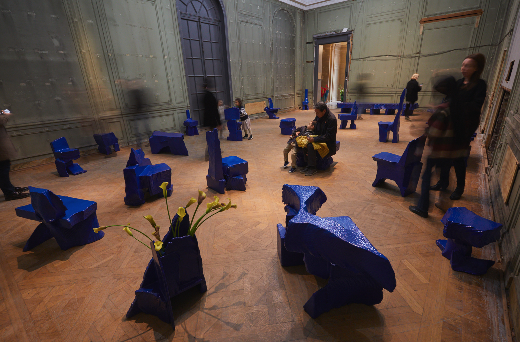 Once constructed, the works are sprayed in a high-density polyurethane rubber coating to form a permanent, waterproof exoskeleton over the fragile polystyrene, making these works functional both indoors and outdoors.Today he has chosen a primary mineral color—lapis lazuli.The blue is a standard “off the shelf” unadulterated colour—“straight out of the tin.” Lamb enjoys the duality of a practice that combines the fundamentals of nature with the synthetic.