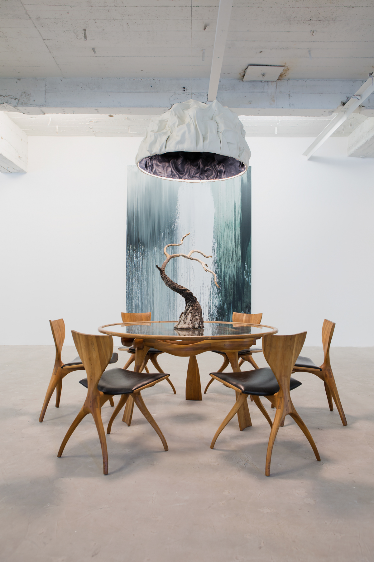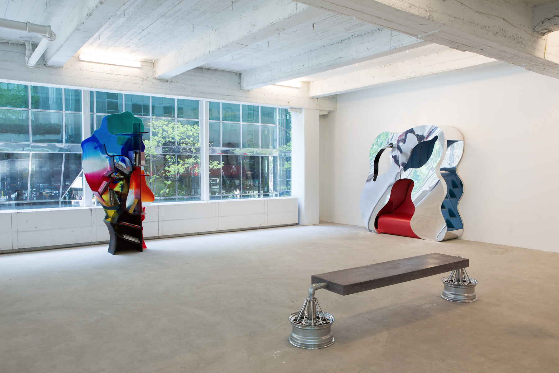 Together, the works on view provoke further questions about value. If an object does not look slick, fabricated, and over-produced, does it have more integrity? If a work is handmade, is it more or less valuable? The fine lines between art and craft, artist and artisan, fade. This show demonstrates an interest in exploiting this collision. Artists such as Rosy Keyser, Leonor Antunes, and Josep Grau-Garriga create contemplative yet confrontational scenarios using paint, rope, and fabric. Jessi Reaves’ deconstructed and recomposed fan, Urs Fischer’s cast foam recliner, and Gaetano Pesce’s poured resin floor seduce. Vito Acconci, Max Lamb, and Nate Lowman tell stories, and their works are made by the span of their own bodies. They distort, radicalize, and improve upon the familiar and functional. Luis Flores, Sarah Lucas, Carly Mark, and Ruby Neri use sculptural surrogates to extend their absurd fantasies based on a collective cultural consciousness. Kenzi Shiokava, Kwangho Lee, and Oscar Tuazon carry a deep reverence for nature, and their works elegantly reinforce the precarious relationship between the organic and synthetic. Anton Alvarez, Dozie Kanu, and Andrea Zittel’s works examine ways to make new domestic propositions.