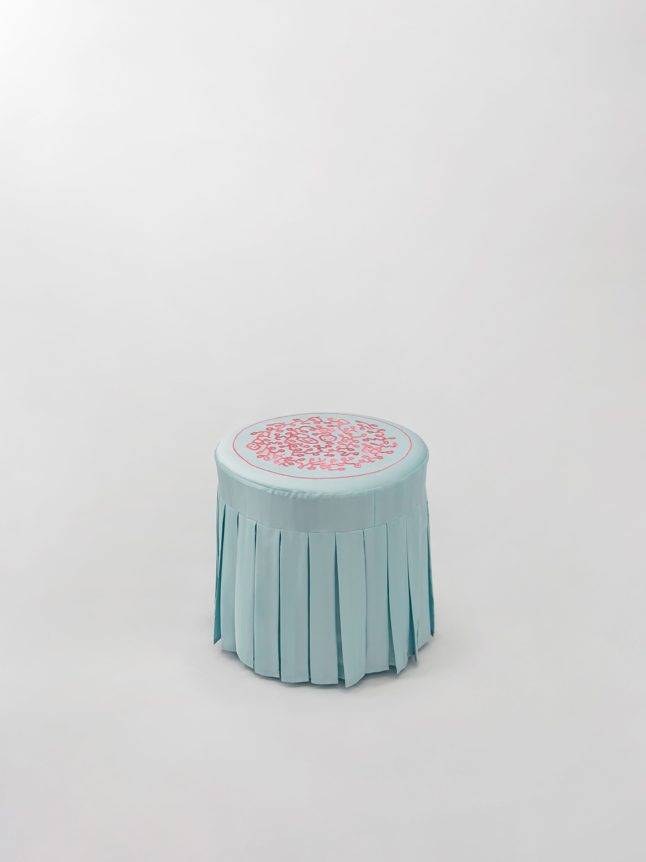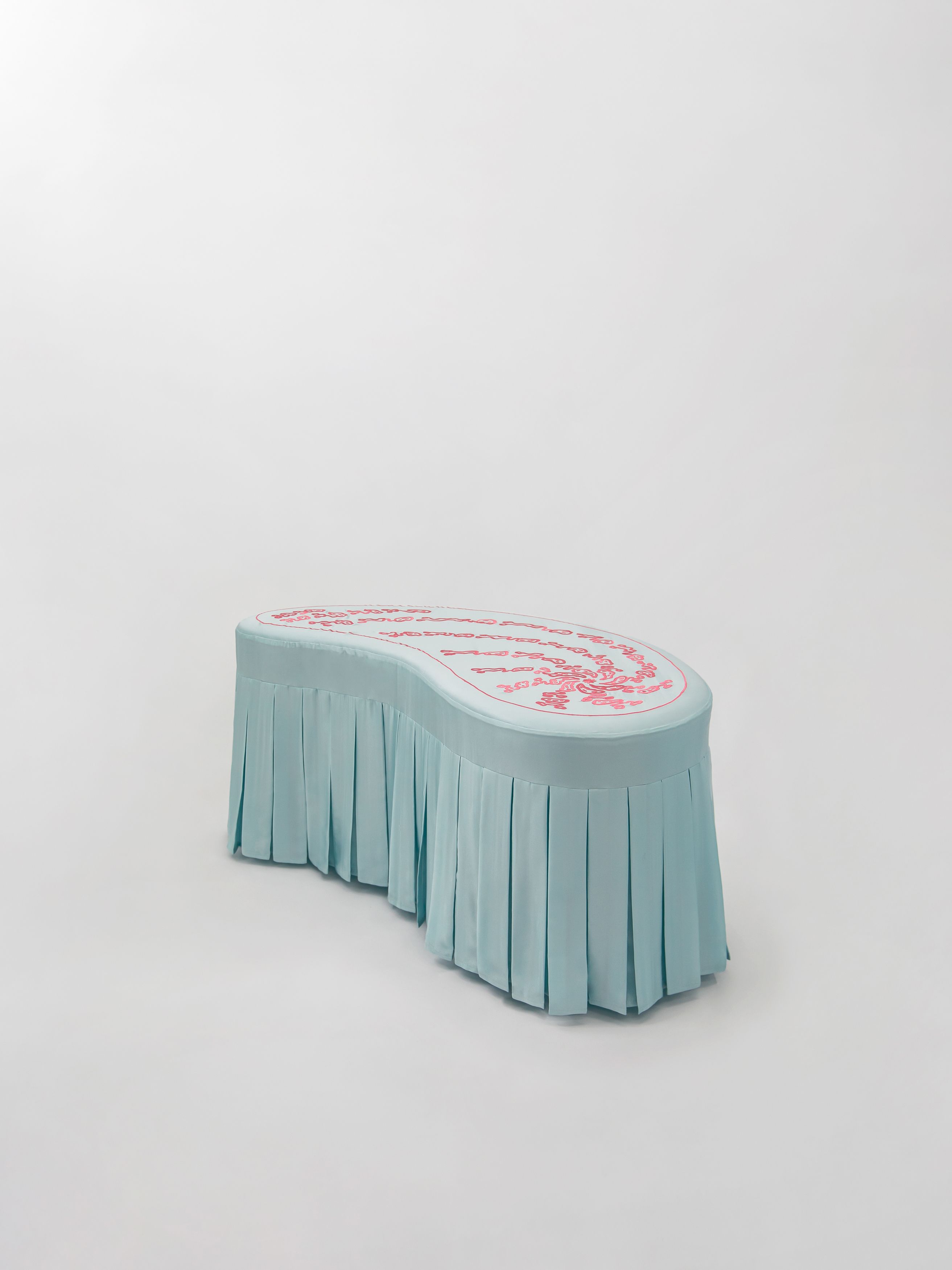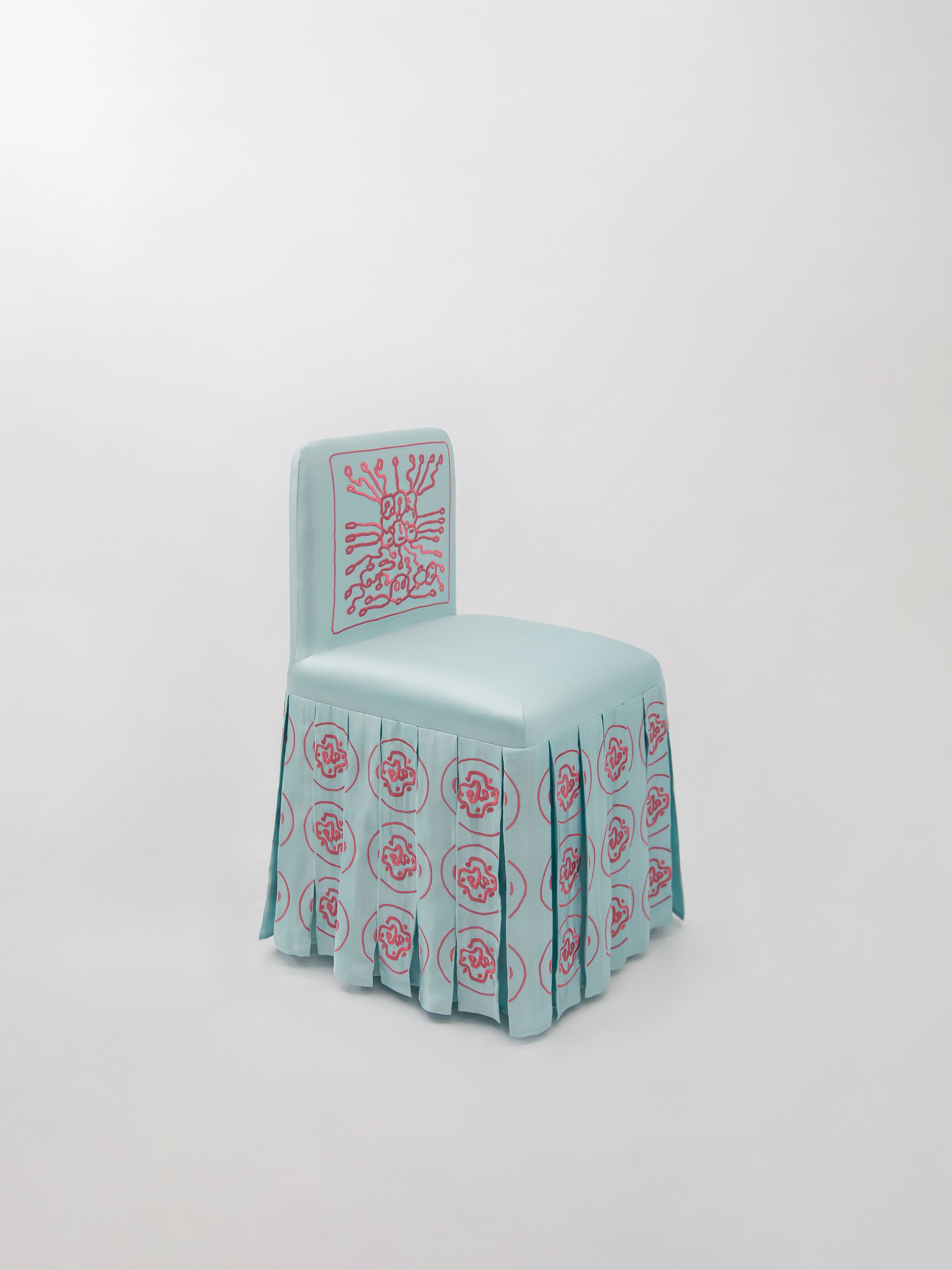 Ordinance of the Subconscious Treatment is a collection of neuroaesthetic objects and environments investigating mental health through contemporary Chinese culture. Intended to be both provoking and hypnotic, intimidating and soothing, the objects interweave religious and folkloric references with scientific and narrative cues informed by contemporary mental health practices. The Collection is reimagined for Salon 94 Design in new Moonlight Aqua silk with Magenta Sunrise embroidery.