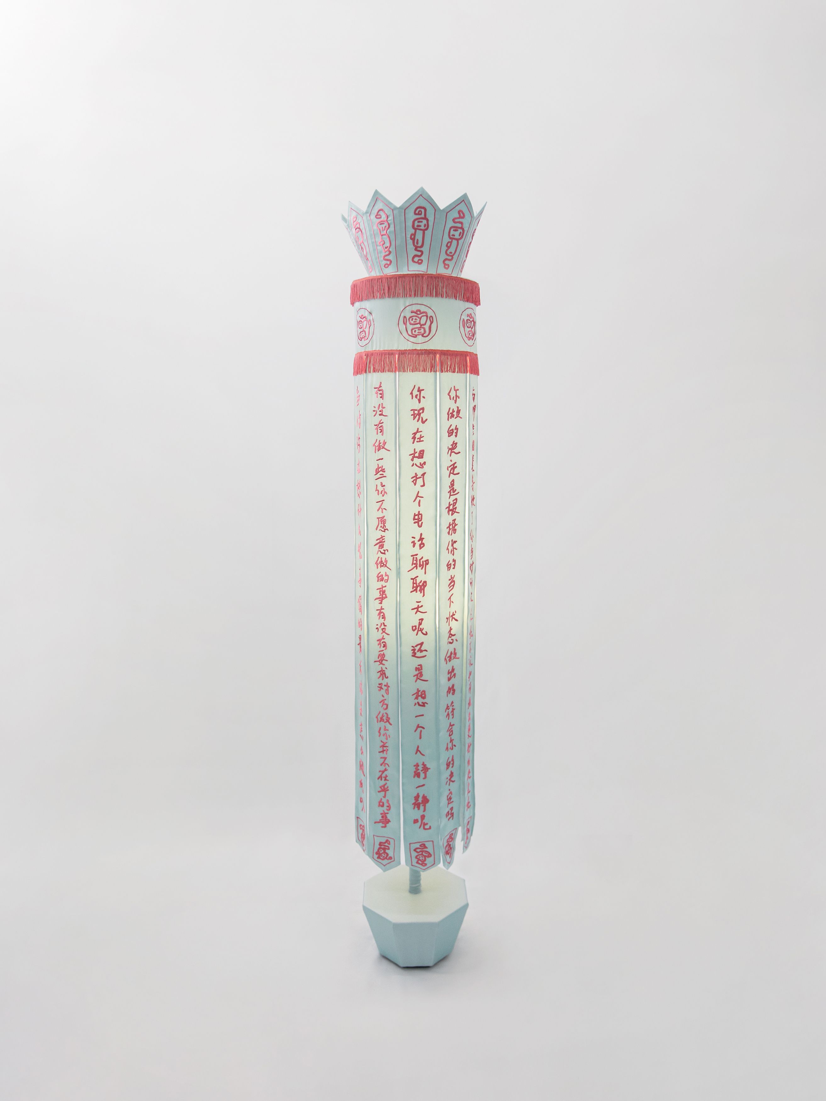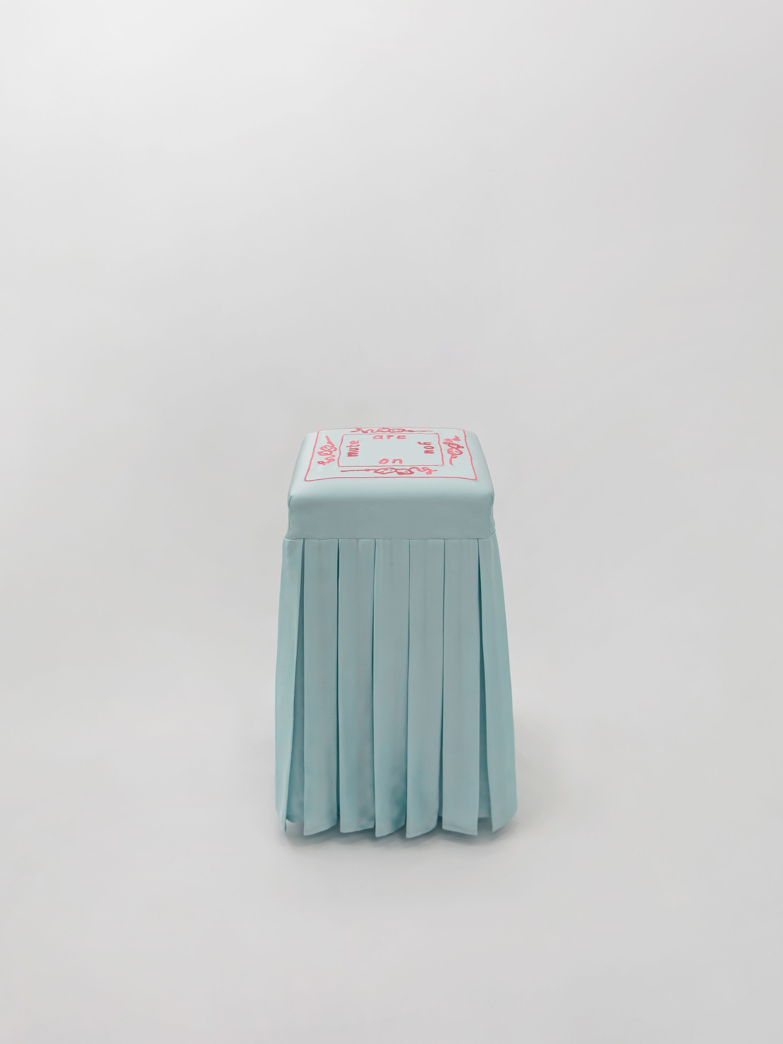 Duyi Han, a previous student of architecture at Cornell University, focuses on traditional Chinese architectural motifs, specifically the decorative elements from Buddhist temples including crowns, parasols and draping banners. Han recontextualizes the motifs into functional design objects. At first sight, the iconography embroidered on the silk references religious symbolism, but in fact draws inspiration from the chemical symbols for neurological health. A coffee table decorated in the chemical compound for Amphetamine (more commonly known as Adderall), a pair of Melatonin Side Tables, a Vitamin D Daybed naturally paired with two Vitamin B-12 Chairs with pleated silk covers (the two vitamins support each other in nutrient absorption in the body). The symbols exist in the context of Western medicine while retaining the potency of ancient Taoist talismans. Called Fulu, these talismans, calligraphy drawn on objects, are used to dispel evil and illness. The practice remains widely used by Chinese folk healers today. Han describes the work, not as chairs or lamps but as “manifestations” through a process of “prescribing” visual and material content, exploring the dialectic of homeopathic traditions and scientific medicine through visual culture.