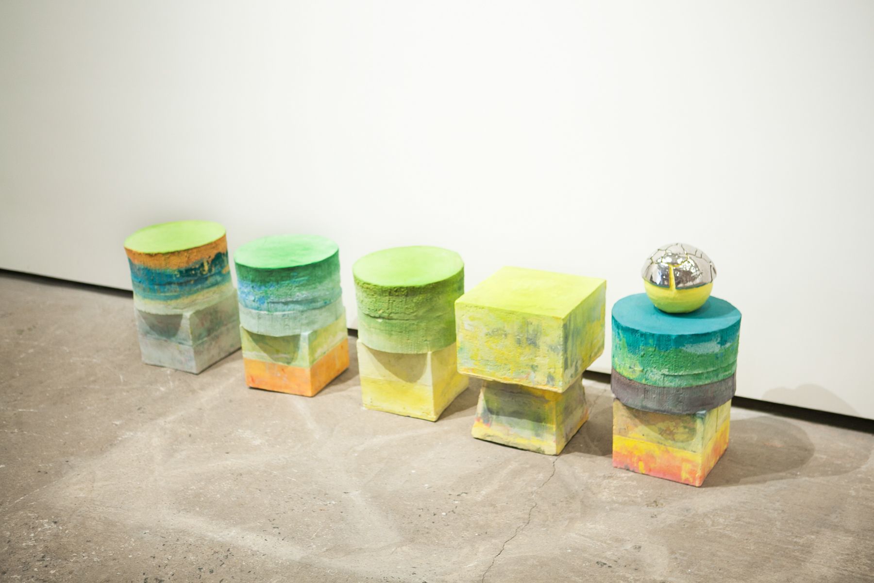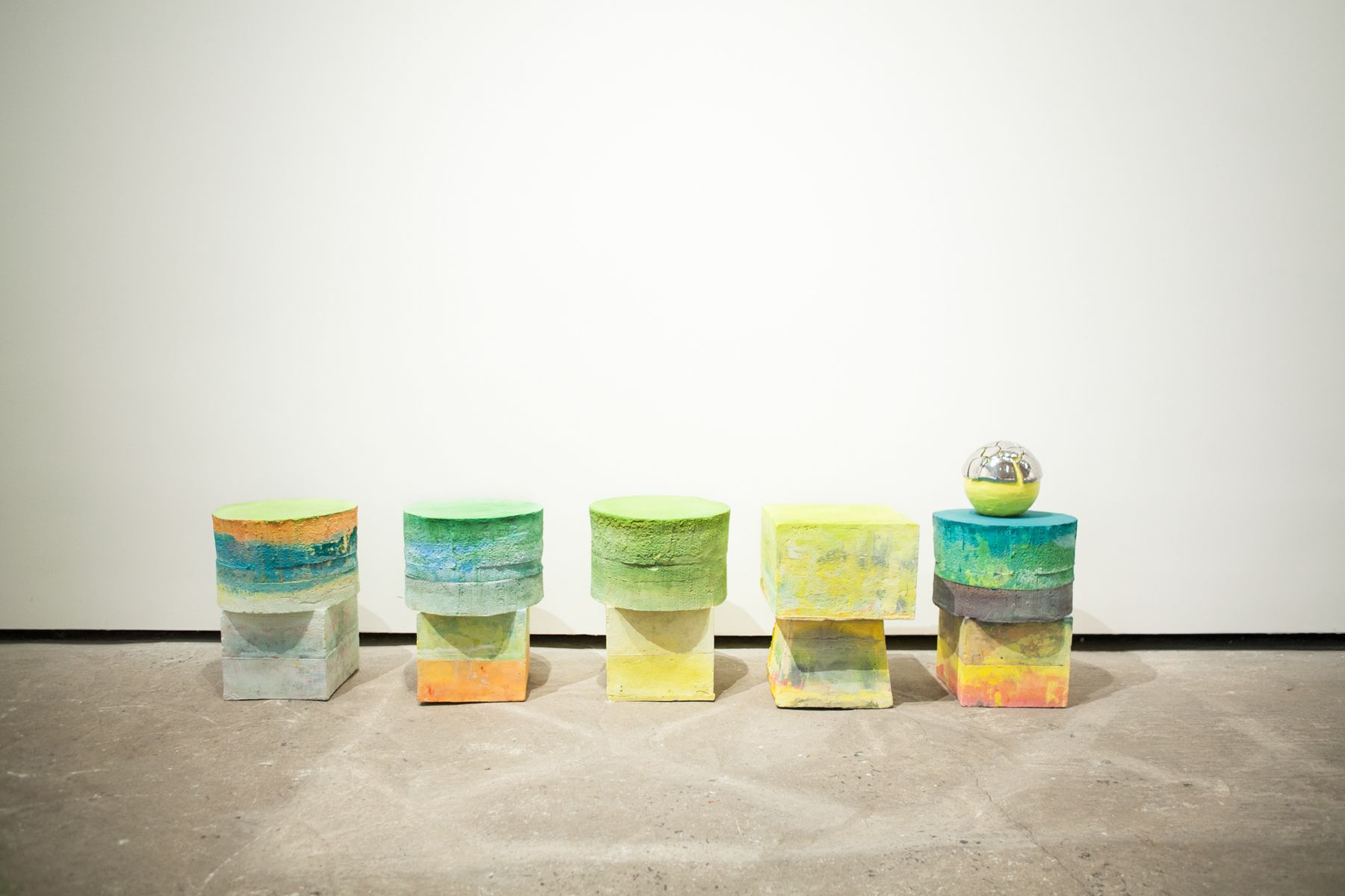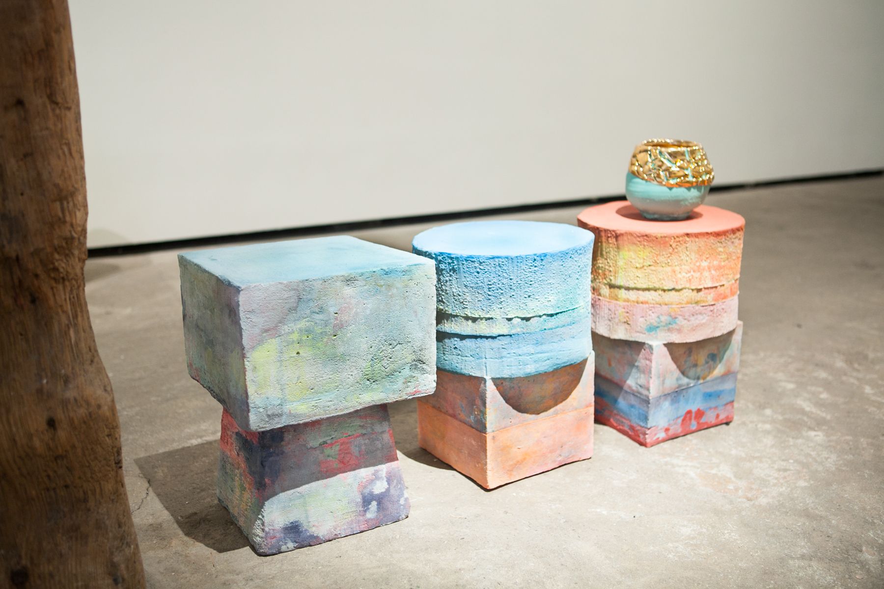 The works of these artists and designers are all rooted in ritual handicraft and employ raw materials to frame unique and unusual architectures. Upritchard's low hanging chandelier made of colorful glass and two mixed media snakes foregrounds the space. Small lights inside each blown glass piece provide a ceremonial feel to the ornaments that hang celestially like a cosmos around gauzy, back-bending serpents. Another sculpture by Upritchard is the bright and willowy figure The Toe Picker. The seated figure along with the other-worldly ceramic sculptures of Kuwata, populate the furniture by the Swiss collaborative Kueng Caputo. Their multicolored, unique sandstone stools are lined up and stacked, functioning simultaneously as tables, chairs, and shelves. The pairing of these offbeat and playful objects with the Brutalist and oversized furniture of Rick Owens underscores their nature as both primitive and futuristic. Two embroidered plastic bags by Josh Blackwell reiterate the mixing of high and low materials. Where Owens pairs raw plywood with solid, milky blocks of alabaster, Blackwell continues his series Plastic Bag as Humble Present, weaving bright colors and patterns onto black plastic deli bags in an inspired act of reinvention.