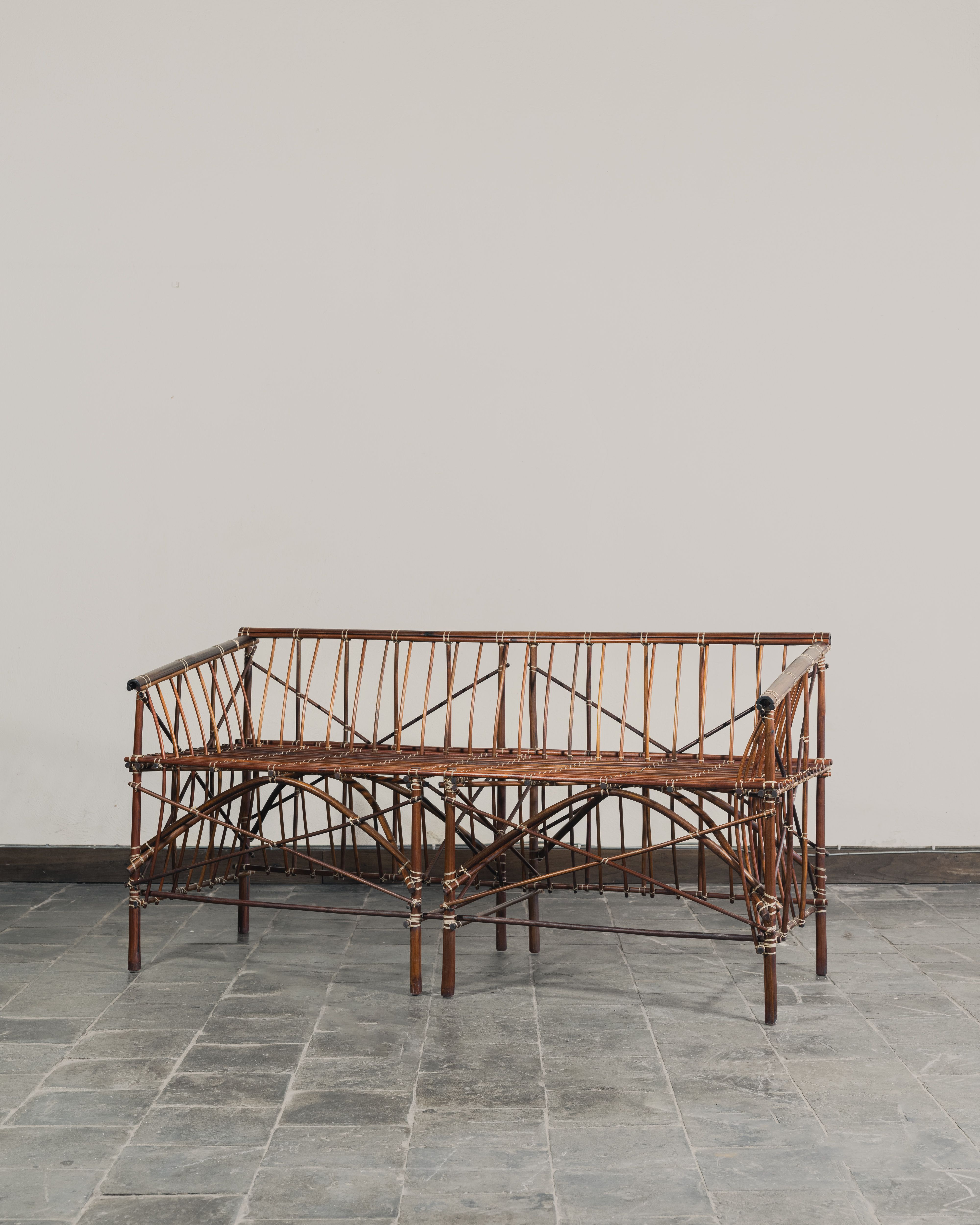 Like Asakura, architect and designer Bijoy Jain transforms traditions with innovation. Jain works with elemental, raw materials—bamboo, stone, clay, indigo, urushi, and silk—that carry long histories and come directly from the natural environment. Organic materials abound as Jain presents a hand-carved and indigo-dyed wooden chair, a bamboo bench finished with urushi lacquer and bound with muga silk, and a trestle table composed of marble, lime, rice husk, marble dust, and lapis lazuli.