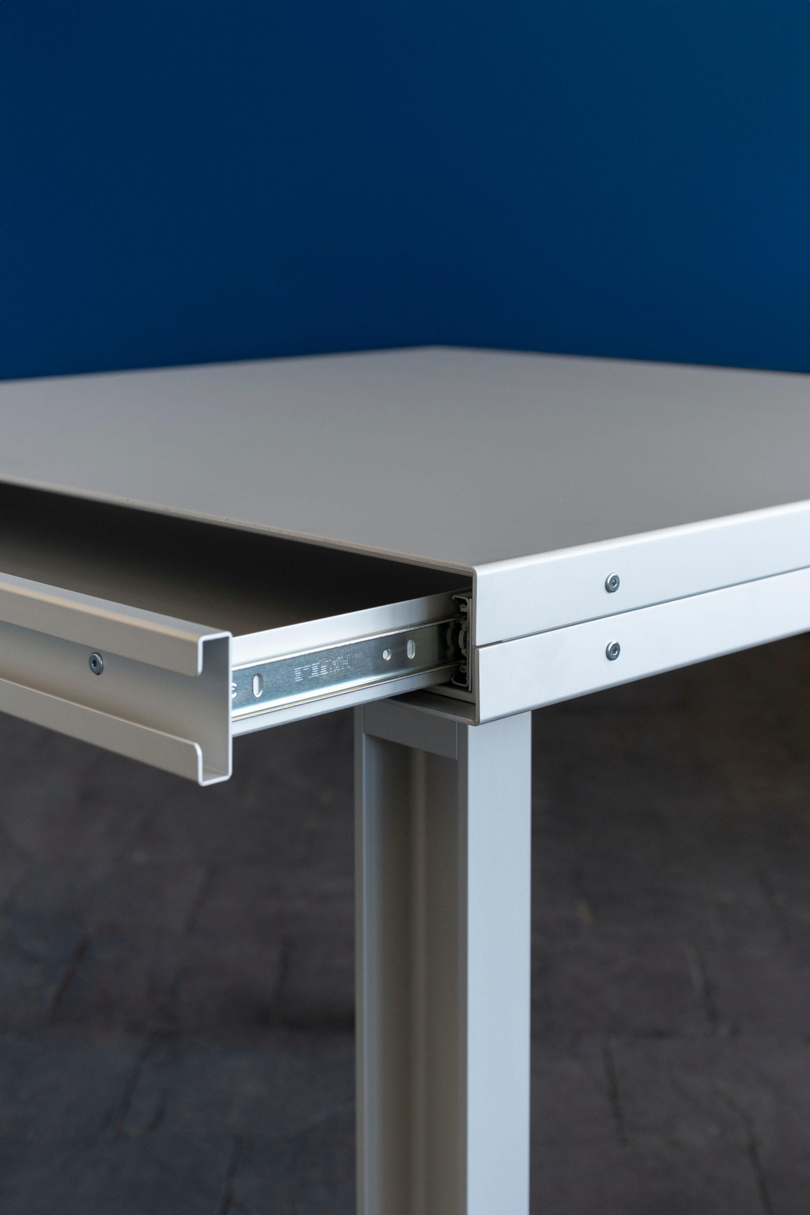 During the Salone del Mobile 2025, Salon 94 Design presents a new body of work by designer Philippe Malouin, created in collaboration with Swiss furniture manufacturer Lehni. The collection, Bent Aluminium, features a series of tables, consoles, and shelves equipped with storage drawers. Notably, pieces with legs are equipped with massive nylon blocks.