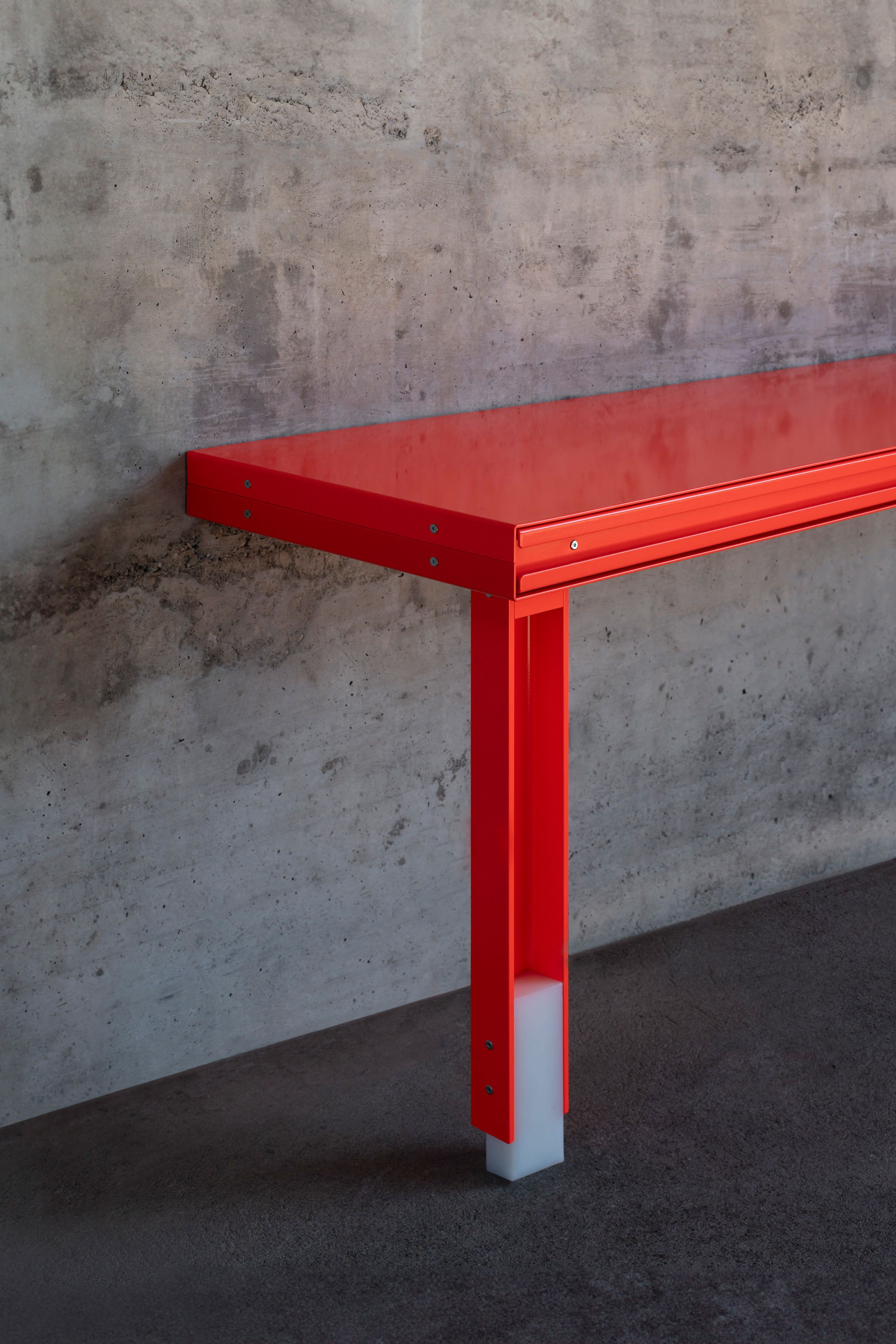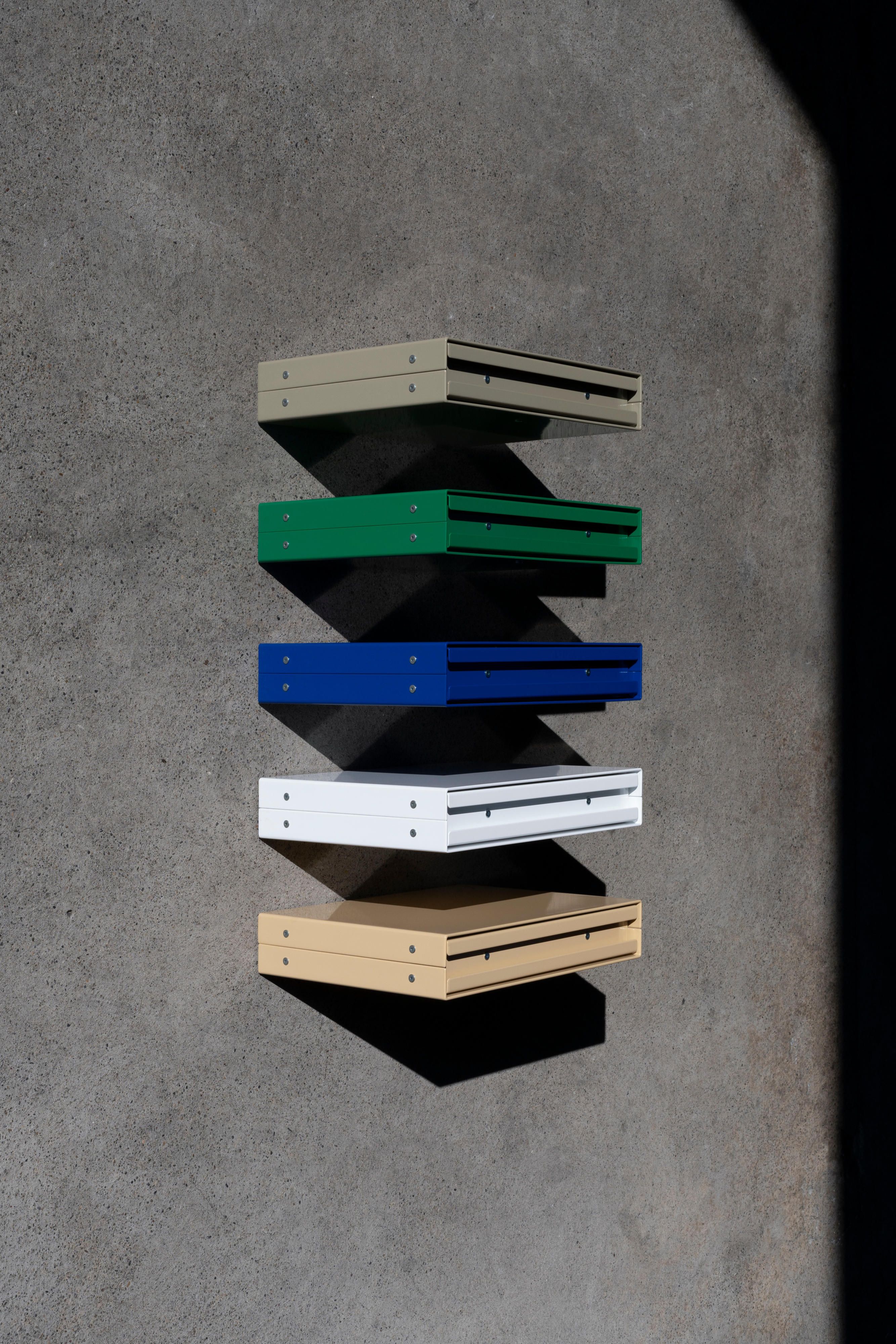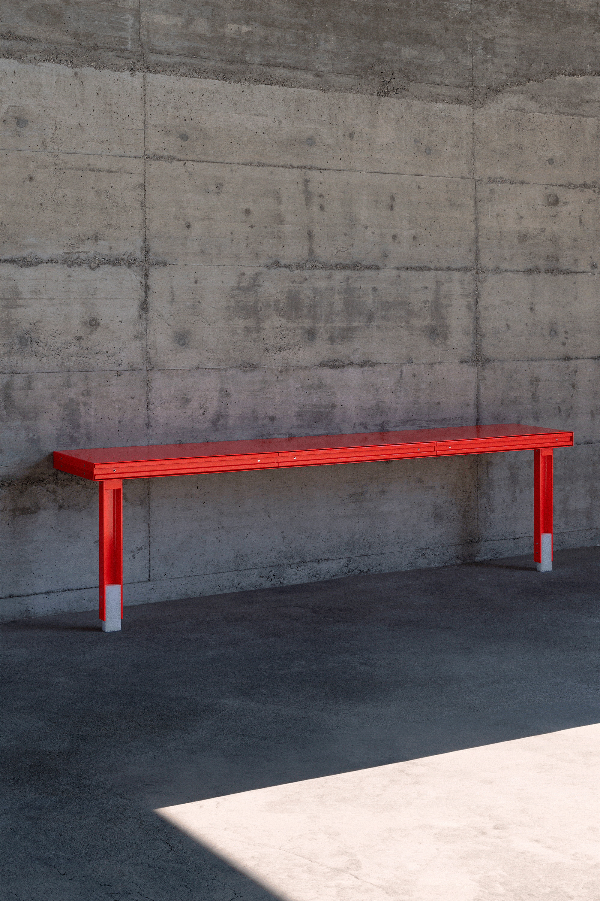 The collection represents Malouin’s continued exploration of industrial materials and manufacturing processes, transformed through his distinctive design language and masterful color selections. Working closely with Lehni, renowned for their expertise in aluminum fabrication and a family business since 1922, Malouin has developed works that highlight the versatility of bent aluminium while maintaining structural integrity, and incorporates strage and functionality. The contrast of precisely-folded aluminium surfaces against the solid blocks of nylon components creates a visual tension that defines the collection’s unique character. Each piece balances technical precision with thoughtful proportions, offering practical storage solutions that disappear into the clean lines of the design.