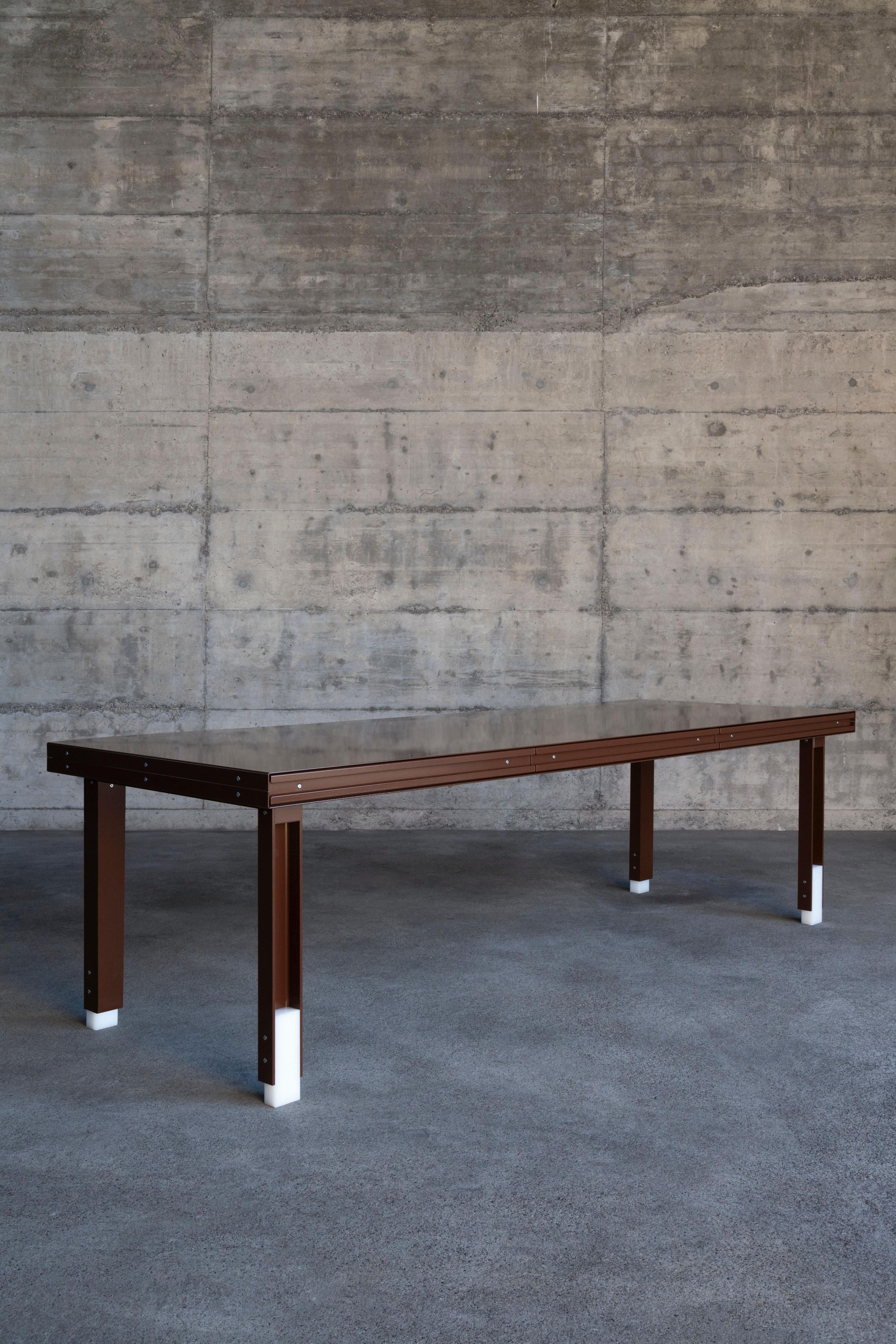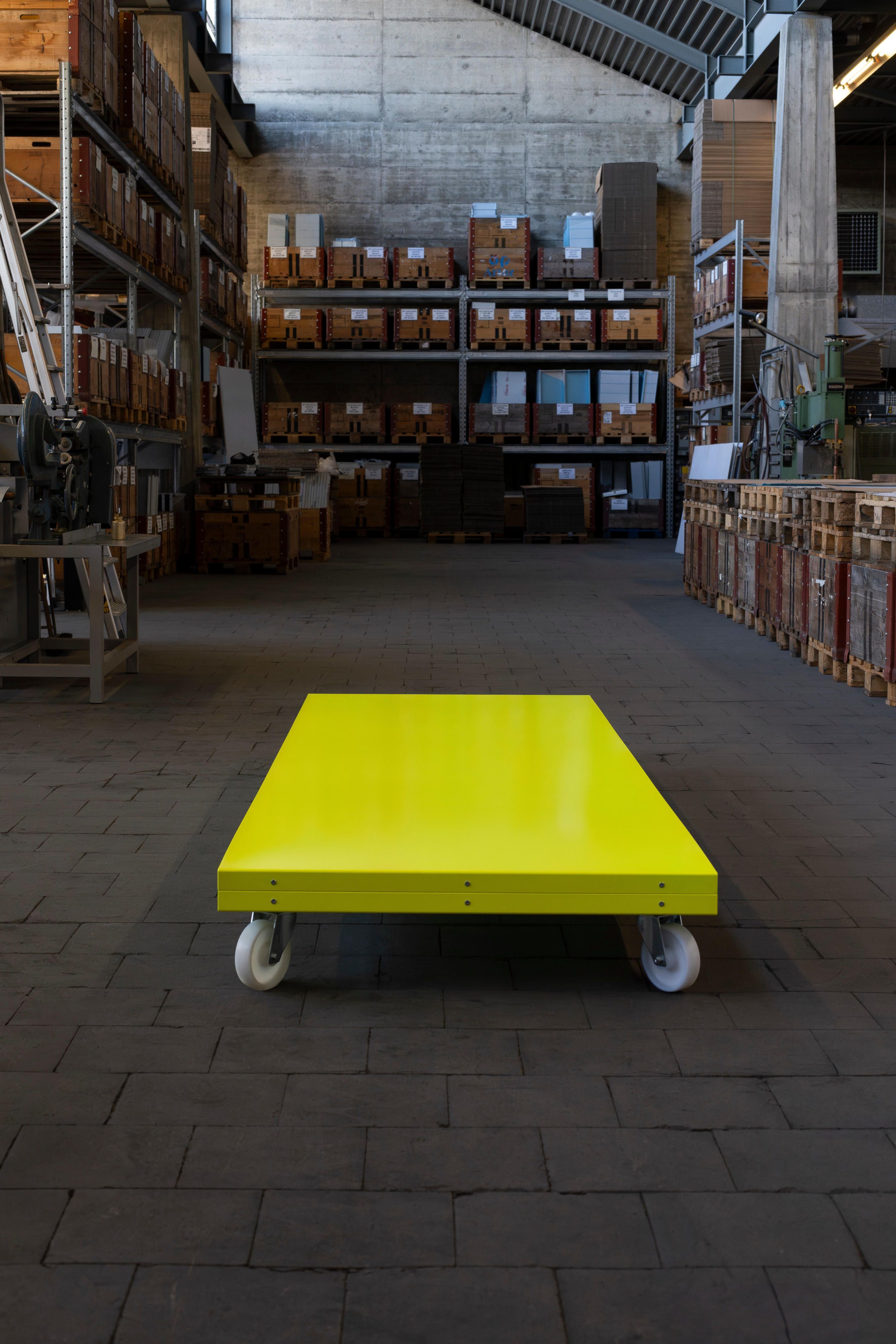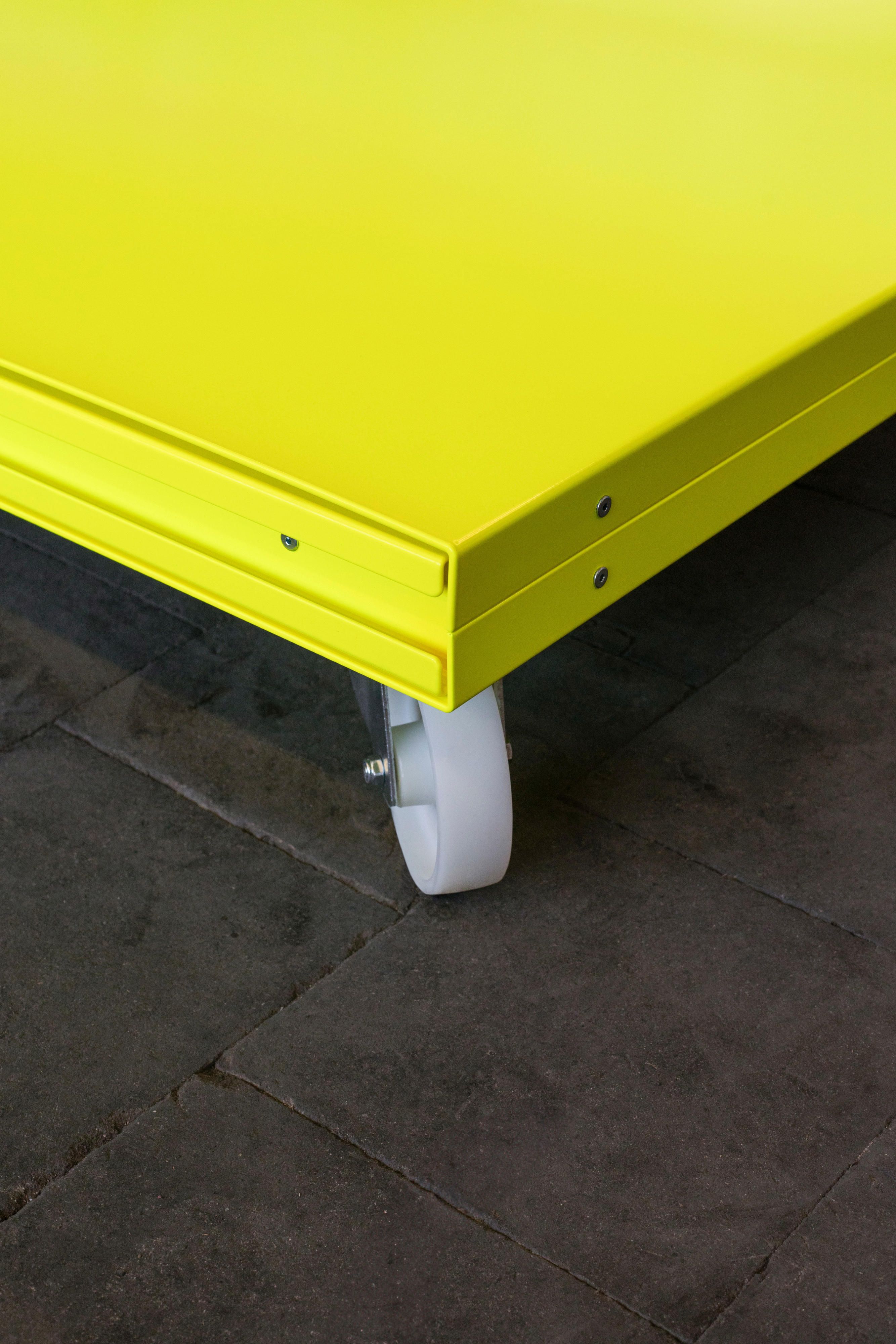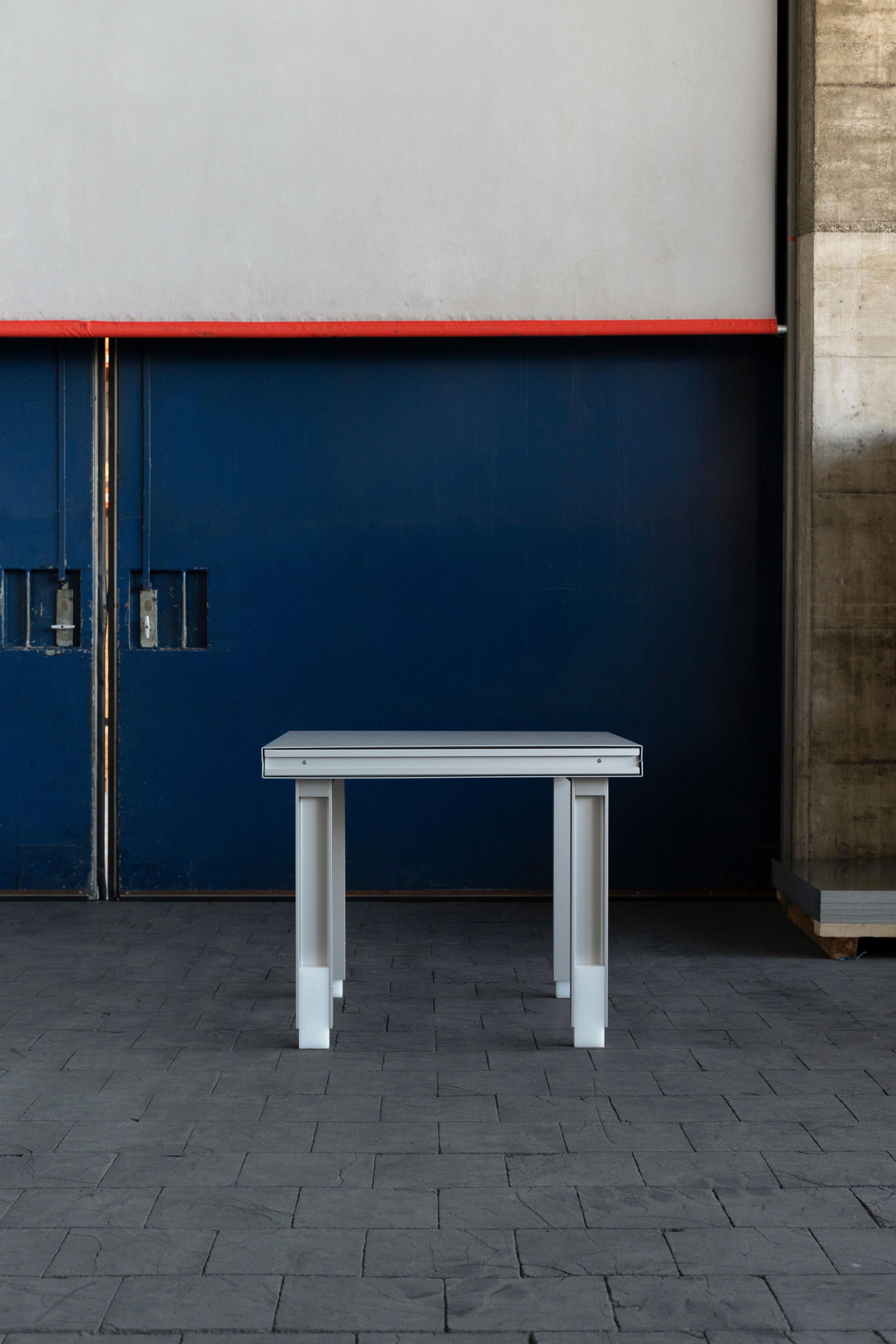 The collection represents Malouin’s continued exploration of industrial materials and manufacturing processes, transformed through his distinctive design language and masterful color selections. Working closely with Lehni, renowned for their expertise in aluminum fabrication and a family business since 1922, Malouin has developed works that highlight the versatility of bent aluminium while maintaining structural integrity, and incorporates strage and functionality. The contrast of precisely-folded aluminium surfaces against the solid blocks of nylon components creates a visual tension that defines the collection’s unique character. Each piece balances technical precision with thoughtful proportions, offering practical storage solutions that disappear into the clean lines of the design.