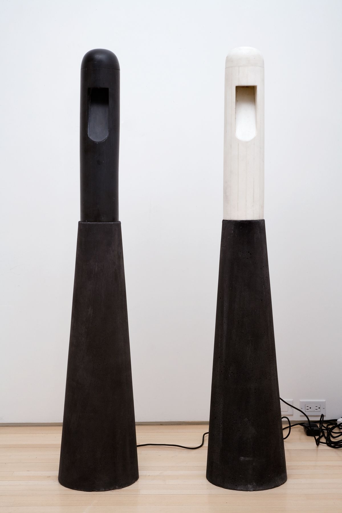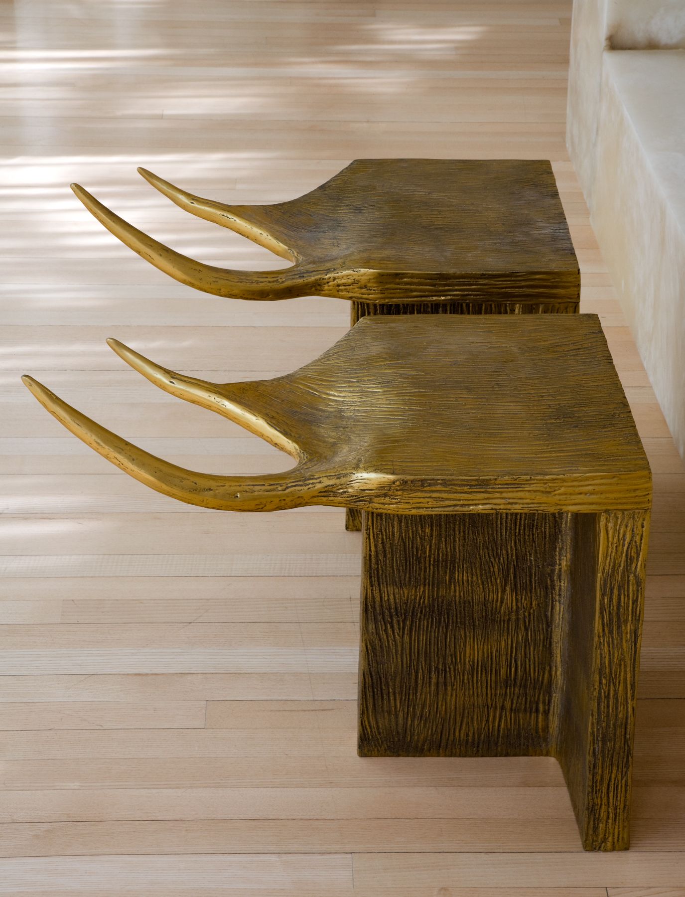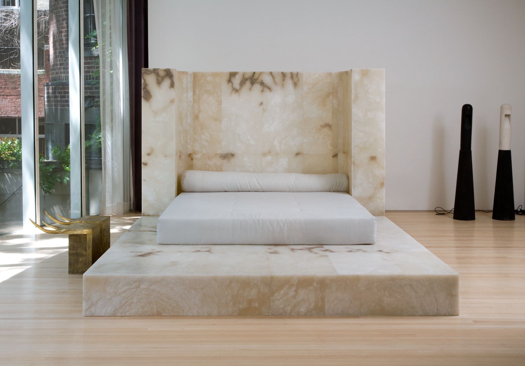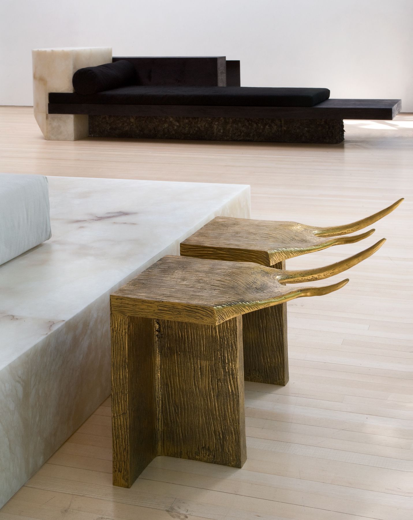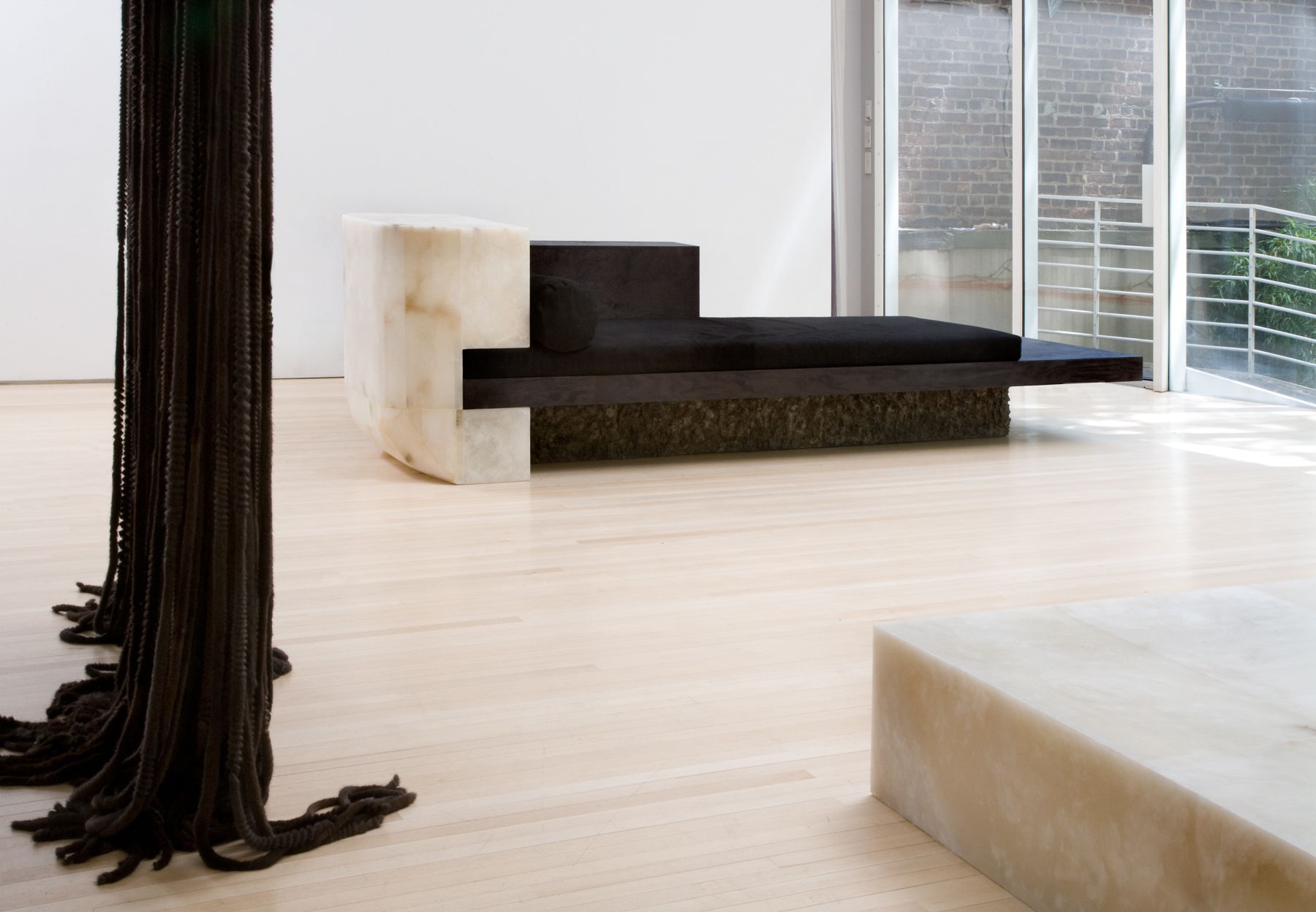 Pavane for a Dead Princess, Owens’ first presentation of furniture design in the United States, is inspired by French composer Maurice Ravel’s composition for solo piano written in 1899. Owens’ singular vision as a designer fuses archaism with modernism, brutal beauty with uncompromising luxury. As in his pioneering fashion design, Owens juxtaposes the most basic materials with the most extravagant: leather and cotton in a biker jacket, for example, or alabaster and plywood in his new bedroom, Pavane for a Dead Princess. Owens’ previous furniture has incorporated resin, horn, marble, bronze, leather, concrete, plywood, and cowhide. His scale shifts from broad and muscular works to lean and curved ones. Some surfaces are left untreated—rough to the touch—while others are polished or covered in fur. Owens’ work in furniture references a variety of sources including 20th century icons, Le Corbusier, Luigi Moretti, and Donald Judd. In addition, his concept for a total domestic environment echoes those championed by Jean Michel Frank and Pierre Chareau.
