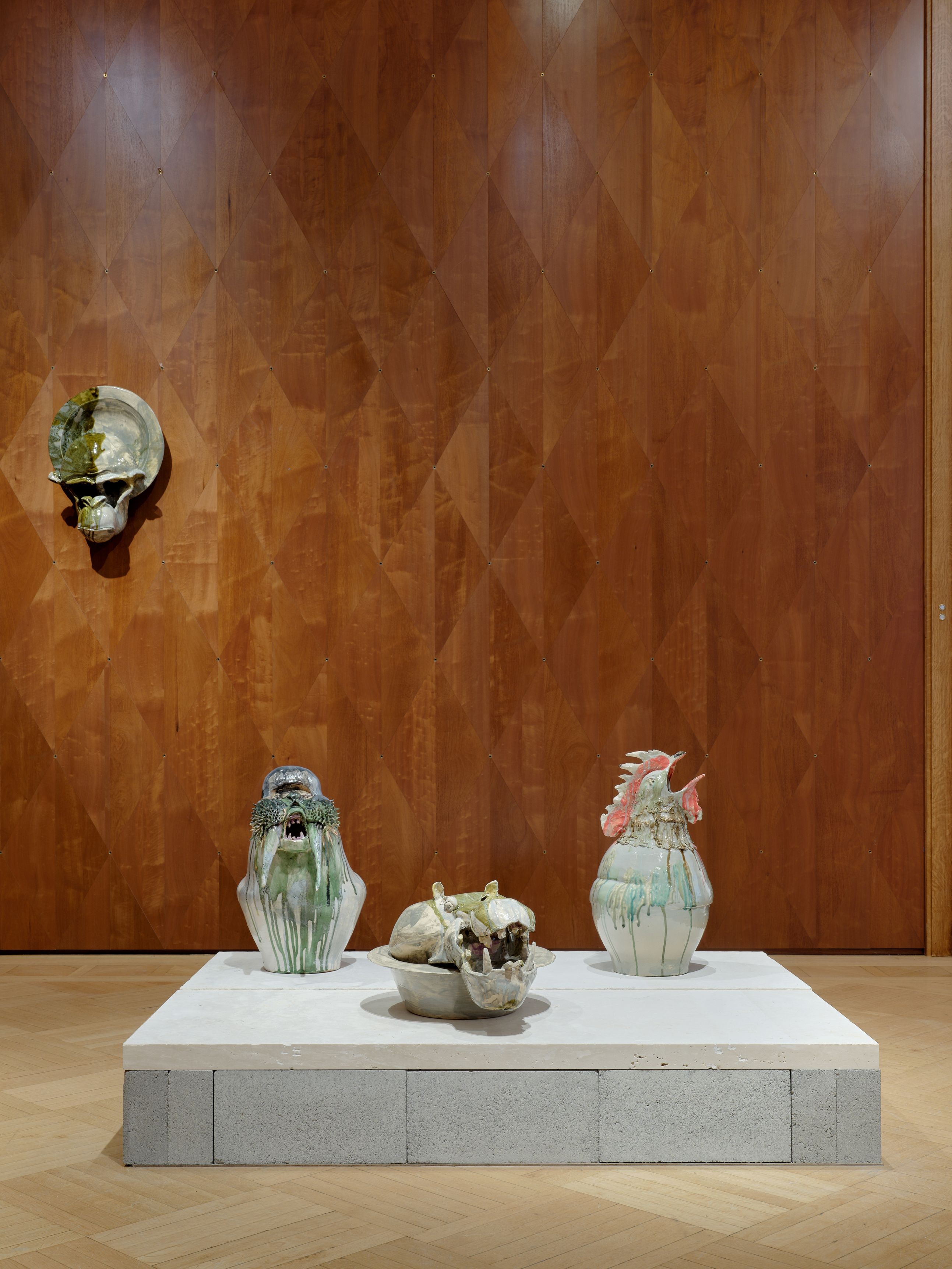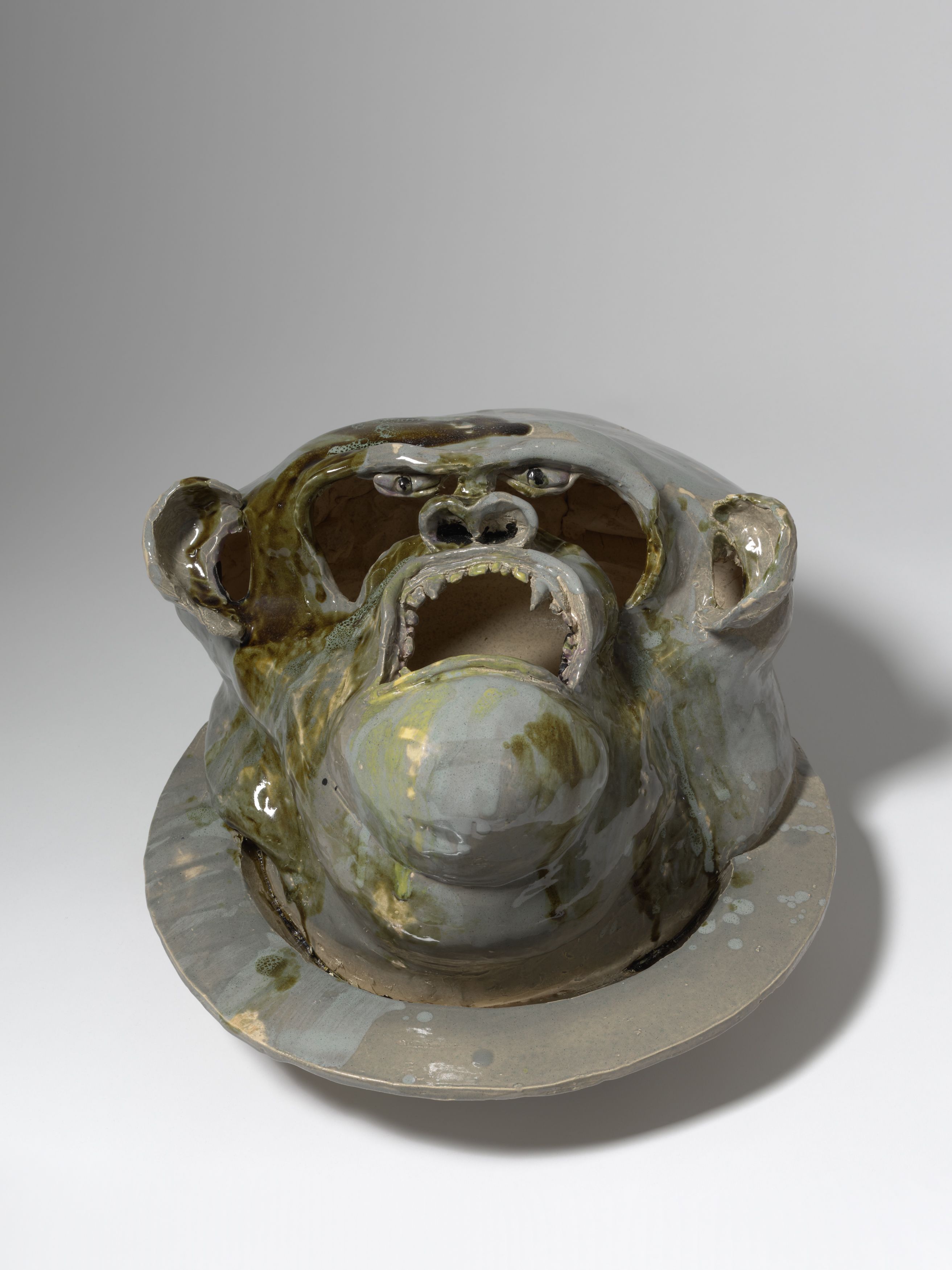 Jongerius explores the unbalanced and increasingly precarious relationship of humans with both animals and nature. The charming animal menagerie of her coveted Nymphenburg series has given way to life-size sculptural animal heads, giving voice to wild animals, our “silent partners” with whom we coexist. Rightly, they are furious! Jongerius presents her simply and aptly titled Angry Animals 2: eight hand-built ceramic sculptures, all female and newly formed friends; a shark named Erica, a hippo named Bonnie, Monica the gorilla, and so on. Beautiful and fierce, each portrait gives voice to what Jongerius describes as “the hitherto voiceless,” continuing her career-long exploration of object narratives that extend beyond pure functionality. The Angry Animals are glazed in green, brown, and orange pigments inspired by lichen that Jongerius photographed on her travels.