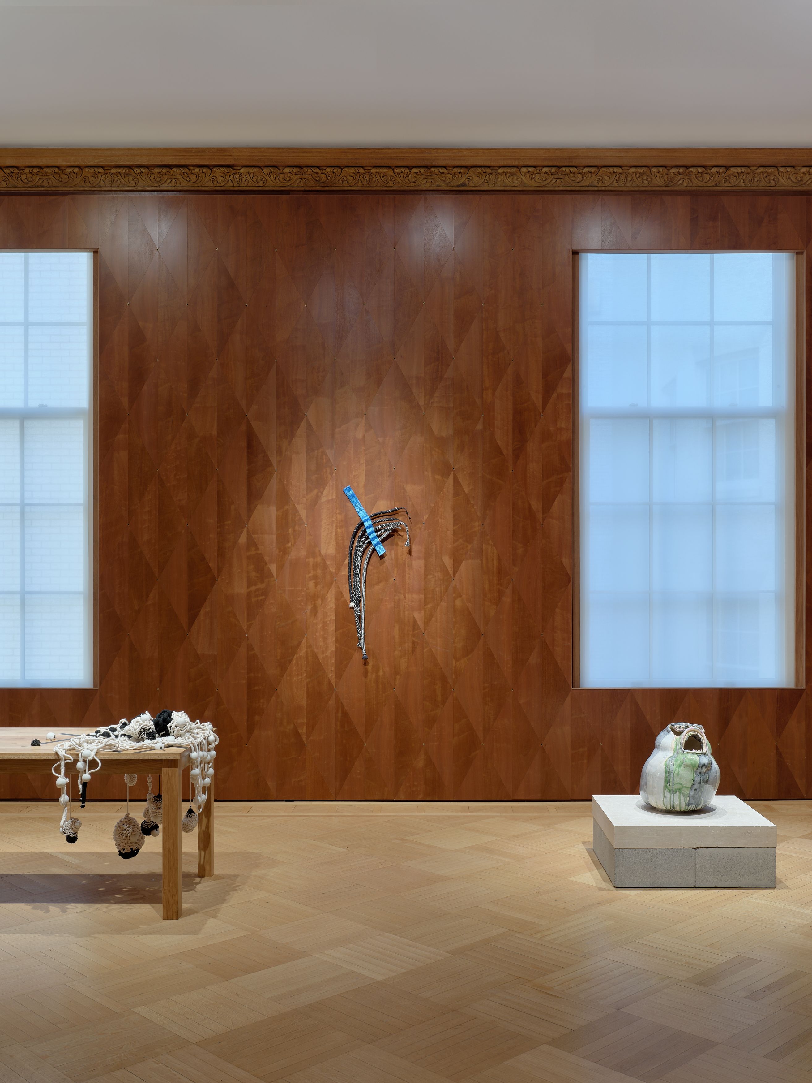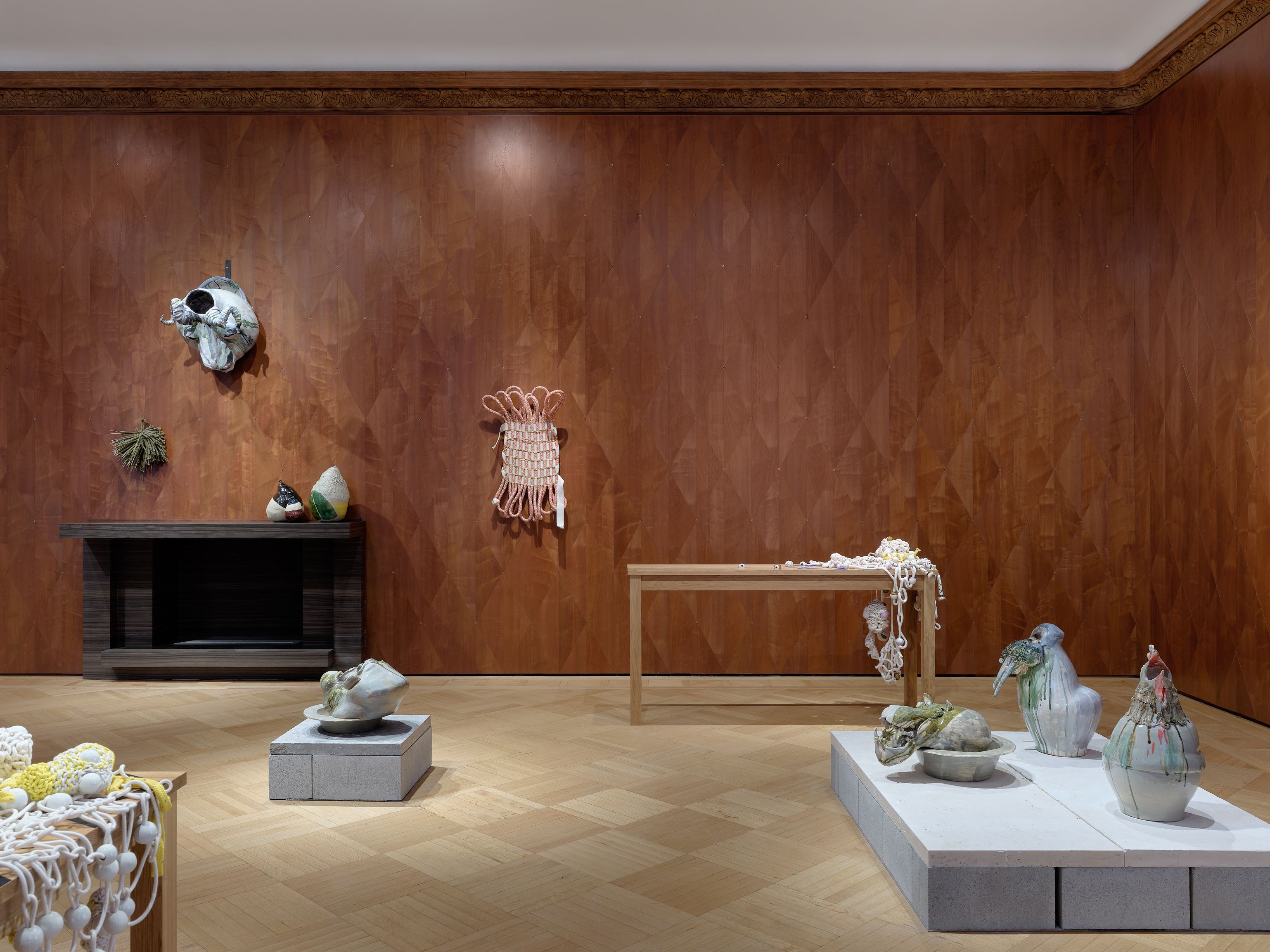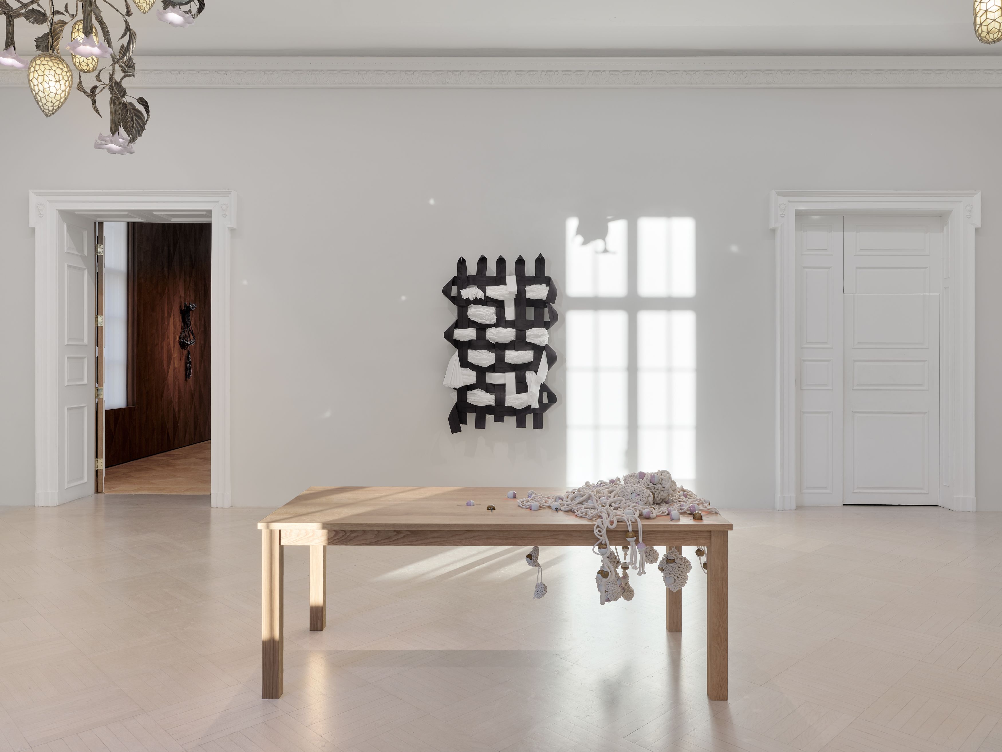 The exhibition also includes a grand wall of her extensive Textile Studies—seemingly stopping and starting from where the finished tables grew. Here, Jongerius introduces a revolutionary “third thread” weaving structure in which the thread alternates “as warp and weft, disrupting the age-old tradition.” These experiments punctuate and recycle her significant installations at the Gropius Bau (2021) and Technical University Netherlands (2023), further developing her investigation into three-dimensional weaving techniques. The studies also exemplify her Berlin Jongerius Lab studio practice, where she and a team of designers experiment with material and technique—weaving, knotting, and braiding a macramé of distinct materials, from modest rope and tissue paper to silk and hand-dyed wools, some threaded with ceramic beads. Even an unassuming chair in the corner might sprout a weaving.