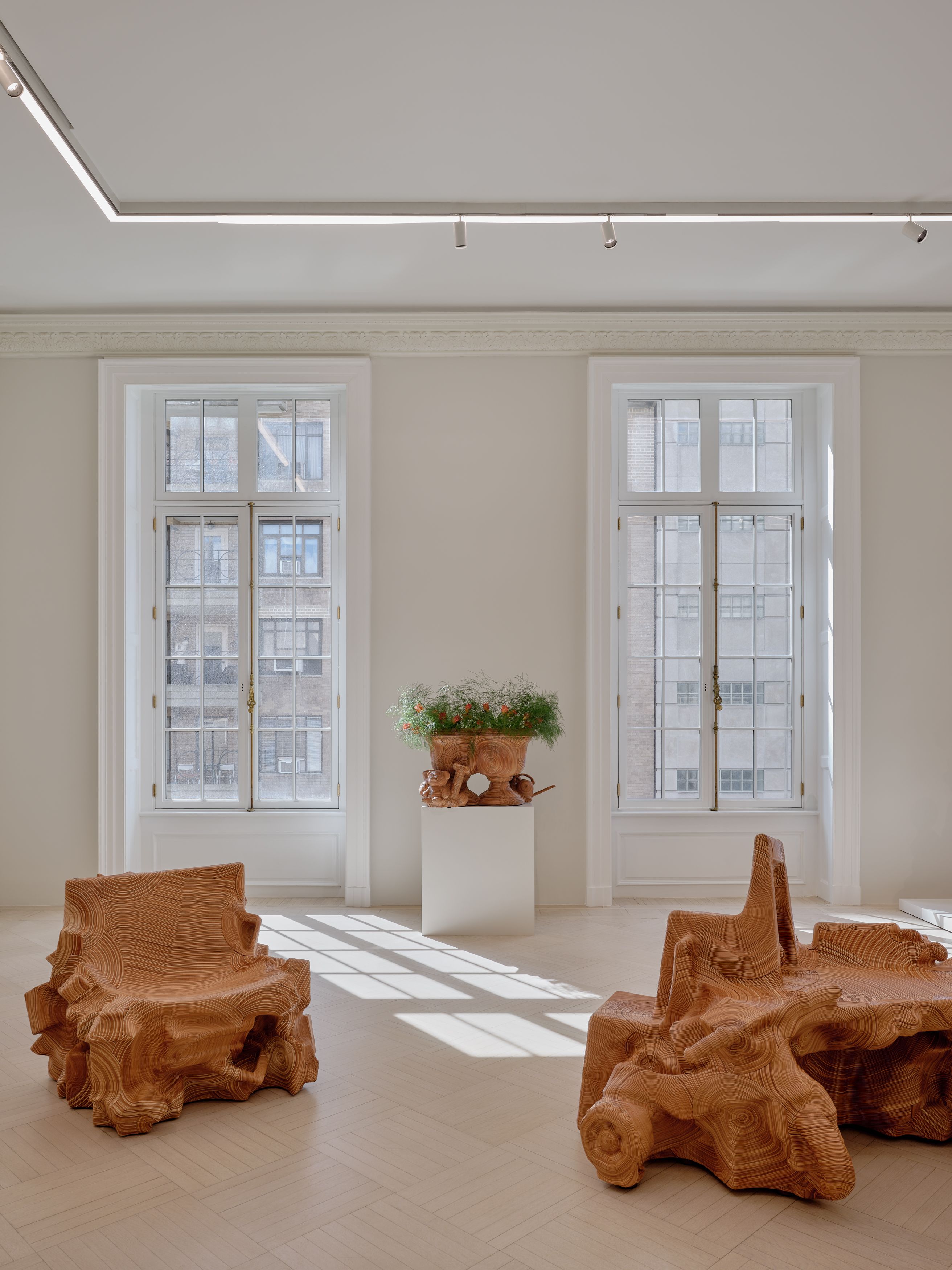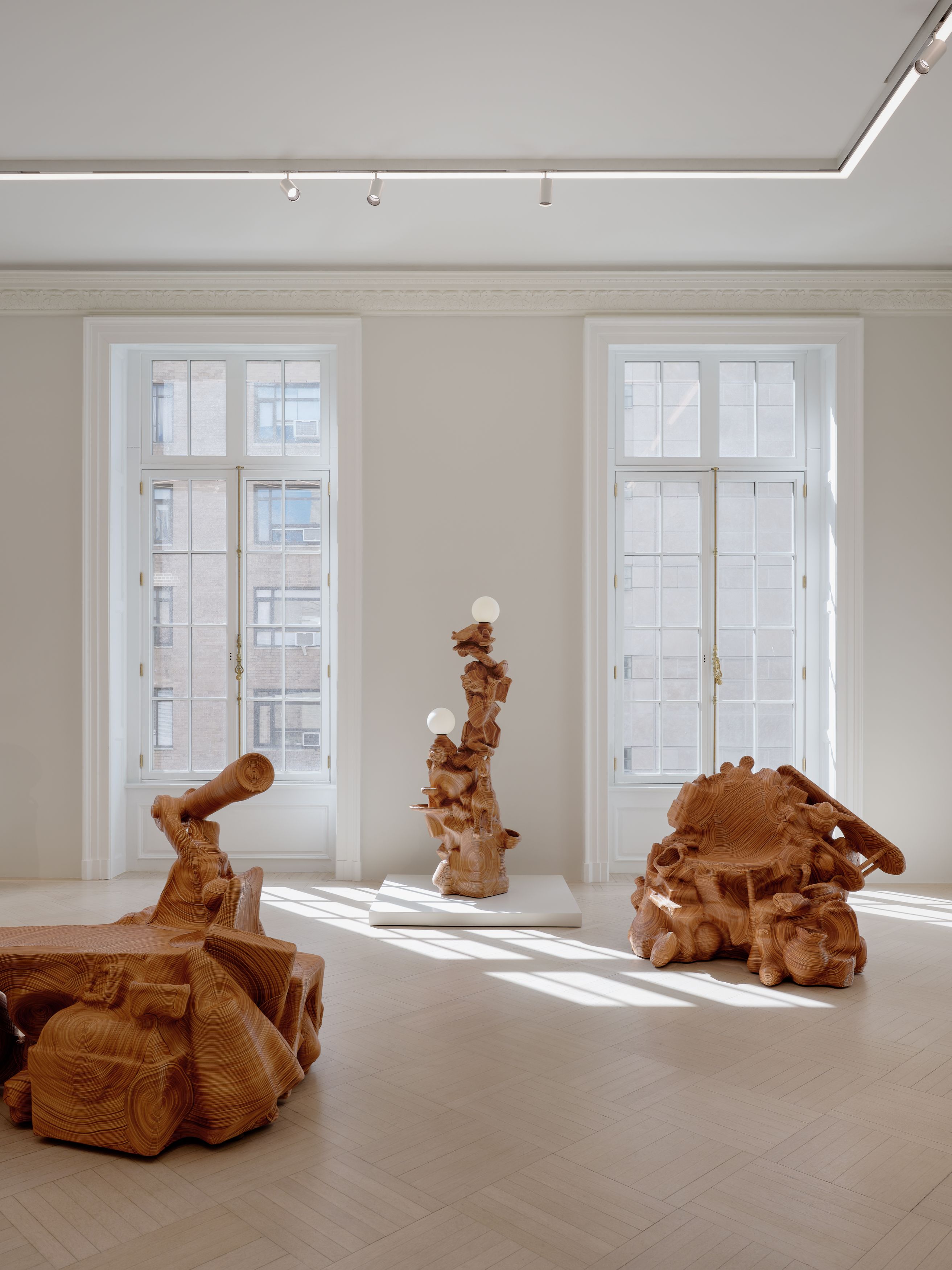 Oh’s newest body of work, auspiciously unveiled on Leap Day of 2024, is her most extensive statement yet on these themes. She has chosen to work exclusively with natural leather, rather than the black that she has sometimes favored in the past. This visual uniformity gives the impression of a single suite of furnishings, reinscribing the gallery’s prior domestic usage (the building was originally a grand residence, completed in 1915). As at Chatsworth, there is an evident connection to the richly embellished baroque designs of the past.