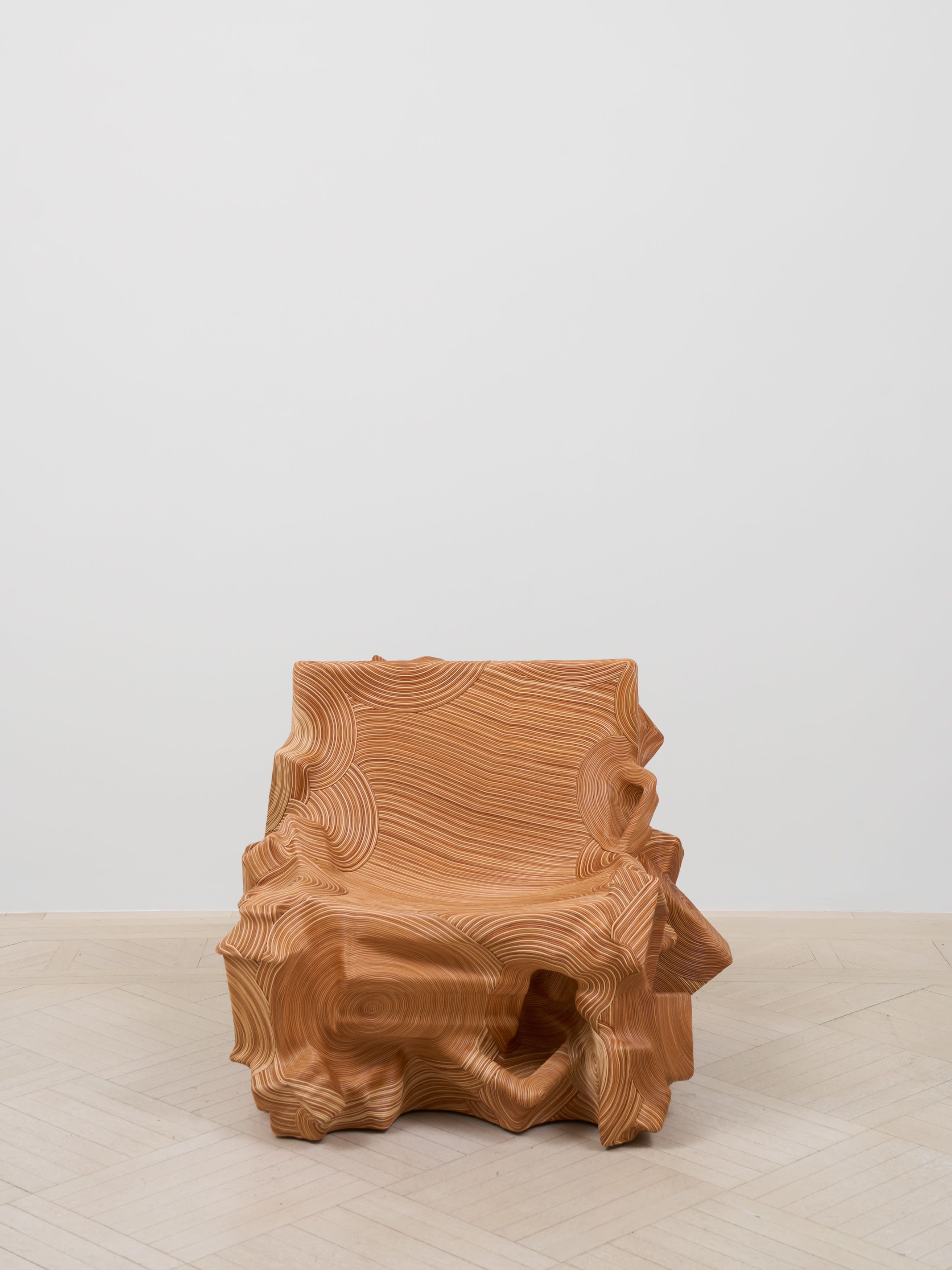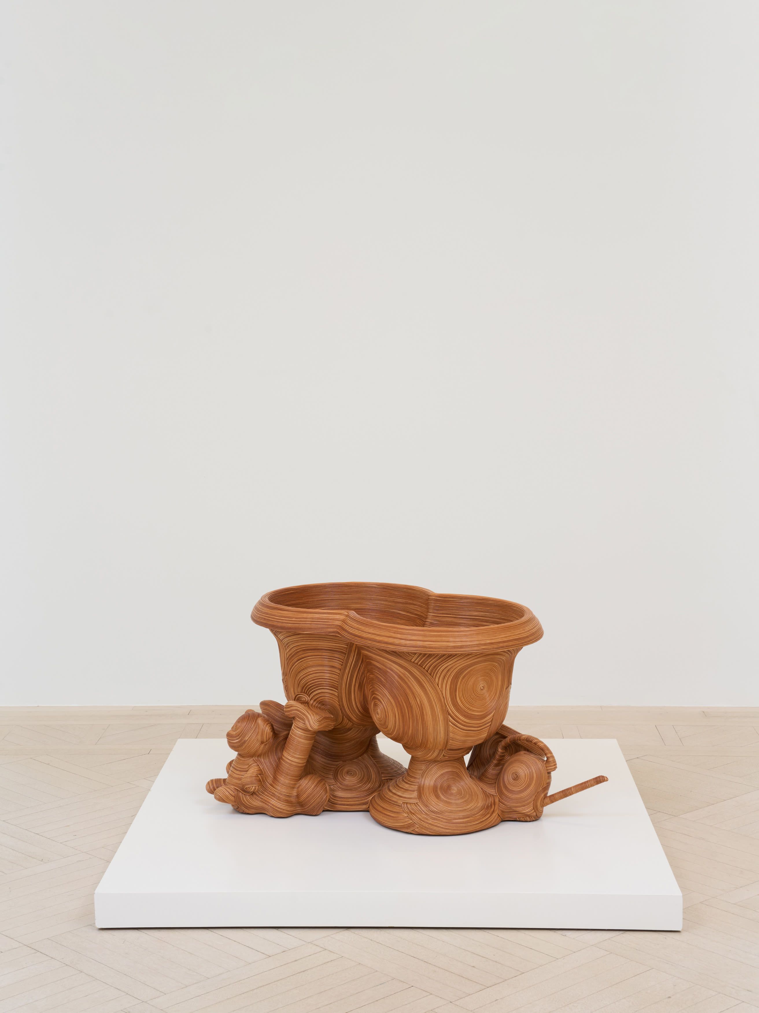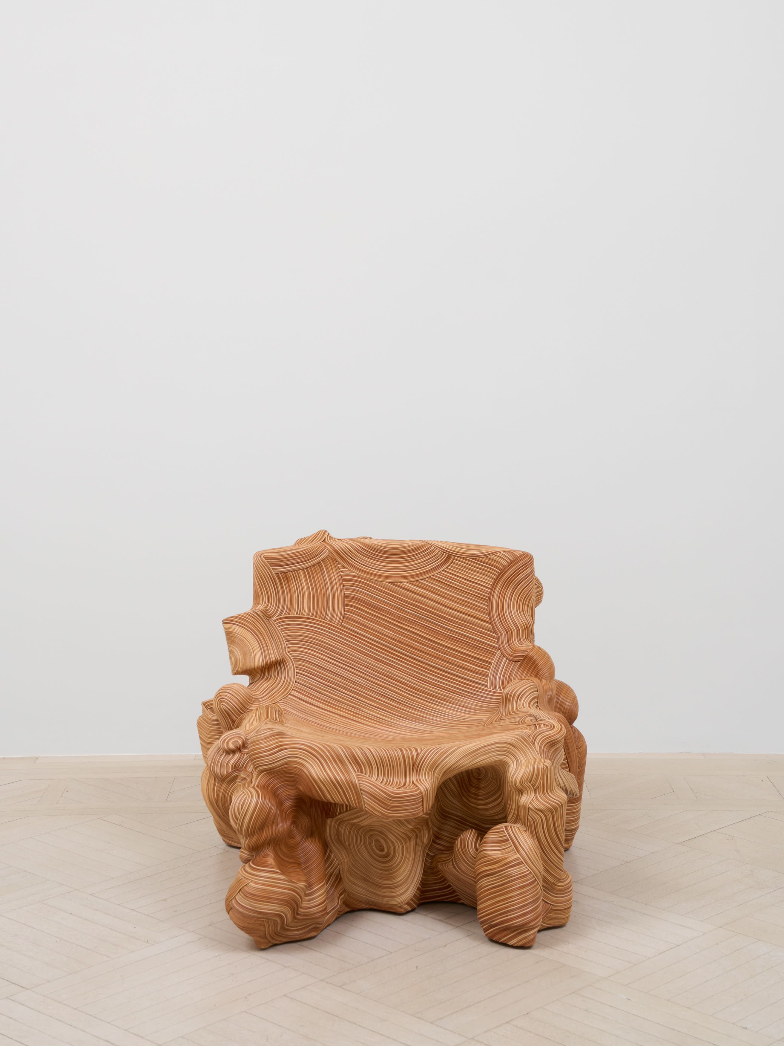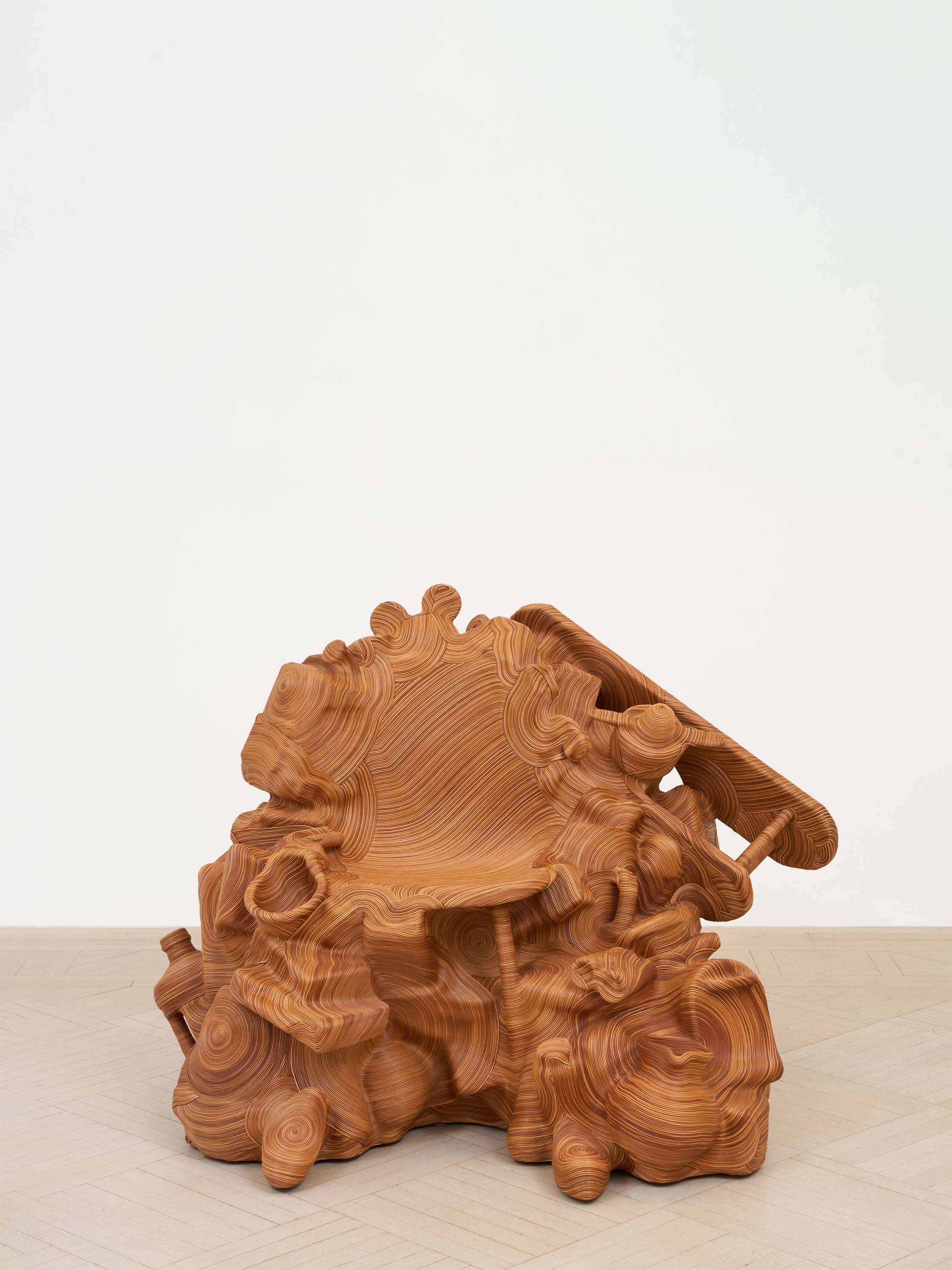 As the Salvage series has progressed, Oh has swapped out jute for more durable leather. The process of assembly is easily described: she first builds the found objects into a solid mass using epoxy, then uses an adhesive to attach the cords, finally sealing the whole with a leather sealant. This scarcely captures the astonishing fineness she achieves, however, with the initial rough-and-tumble compositions transmuted into seamless shapes though the exactitude and elegance of her hand. As Oh has gained more command over this invented technique, the intricately laid whorls spread with ever more dizzying complexity over her constructions. For Mirror Mirror: Reflections on Design at Chatsworth, an exhibition I co-curated last year, she created a throne made of decommissioned musical instruments. Their silence was conspicuous, the sounds they might once have produced suspended ghostly in the space.