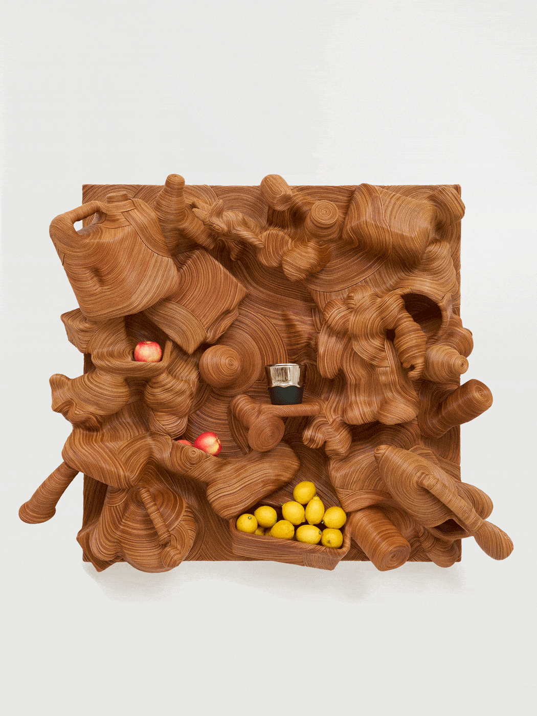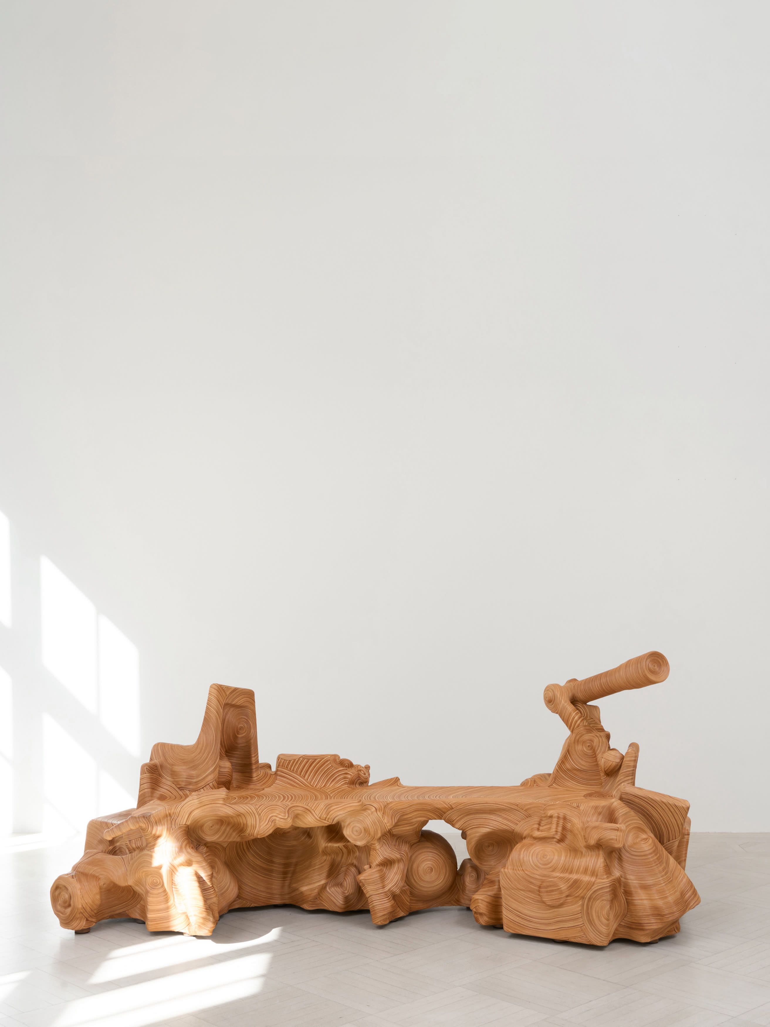 Ever since Cranbrook, she has sought meaning in brimming chaos—an impetus she shares, incidentally, with the great design radical Gaetano Pesce, in whose studio she briefly worked following graduation. More and more, she finds herself moved by what she finds: the scratches and dents of hard use; a child’s name inscribed on a once- beloved toy. Once she enfolds her discoveries within the capacious, all-devouring membrane of her work, all these traces will be obscured. Nonetheless they remain, and are perhaps all the more eloquent for being hidden away. A roomful of Oh’s work is an intensely psychological space, which speaks for the multitude that is humanity. For what are any of us, at the end of the day, but what we leave behind?