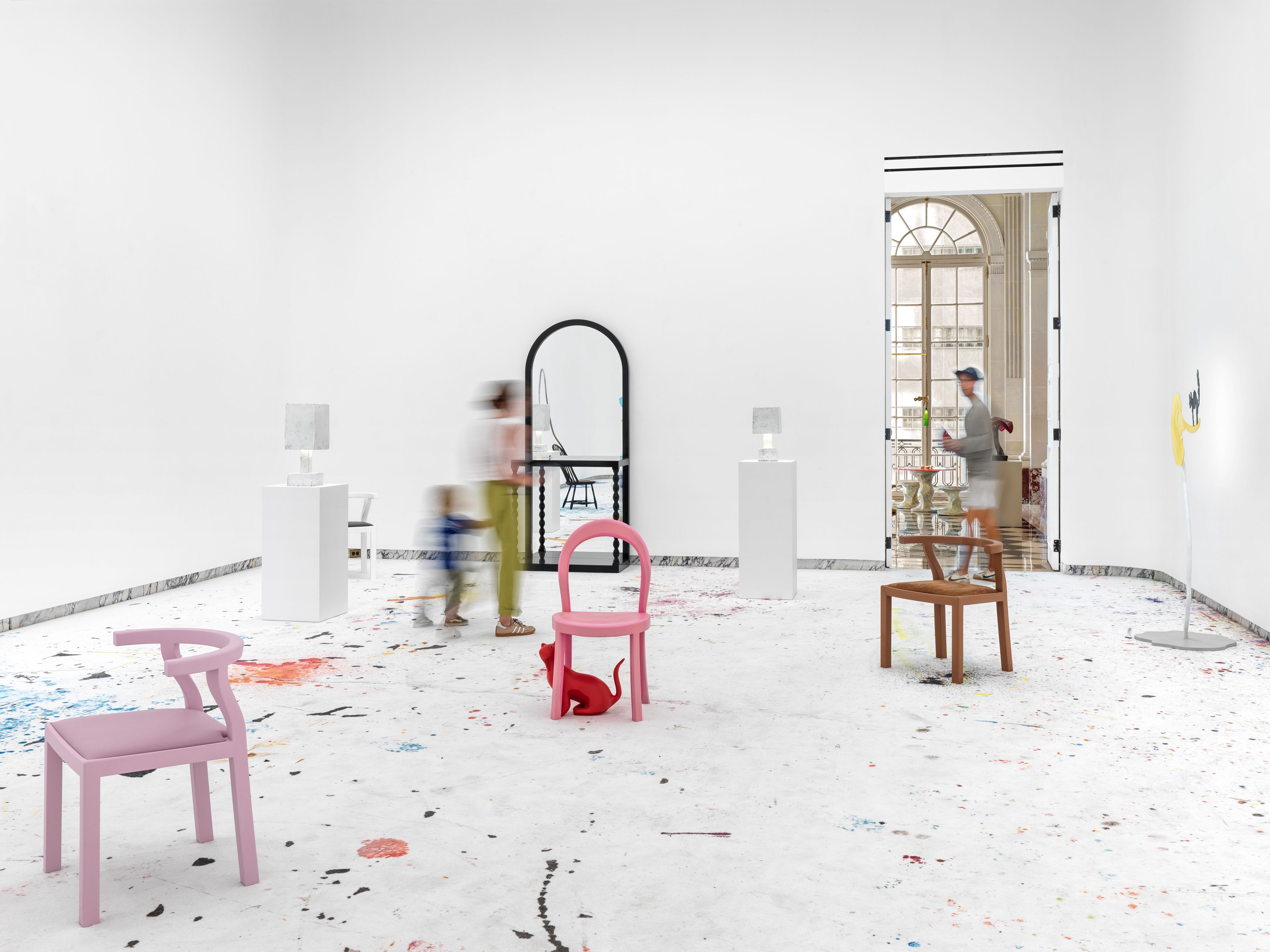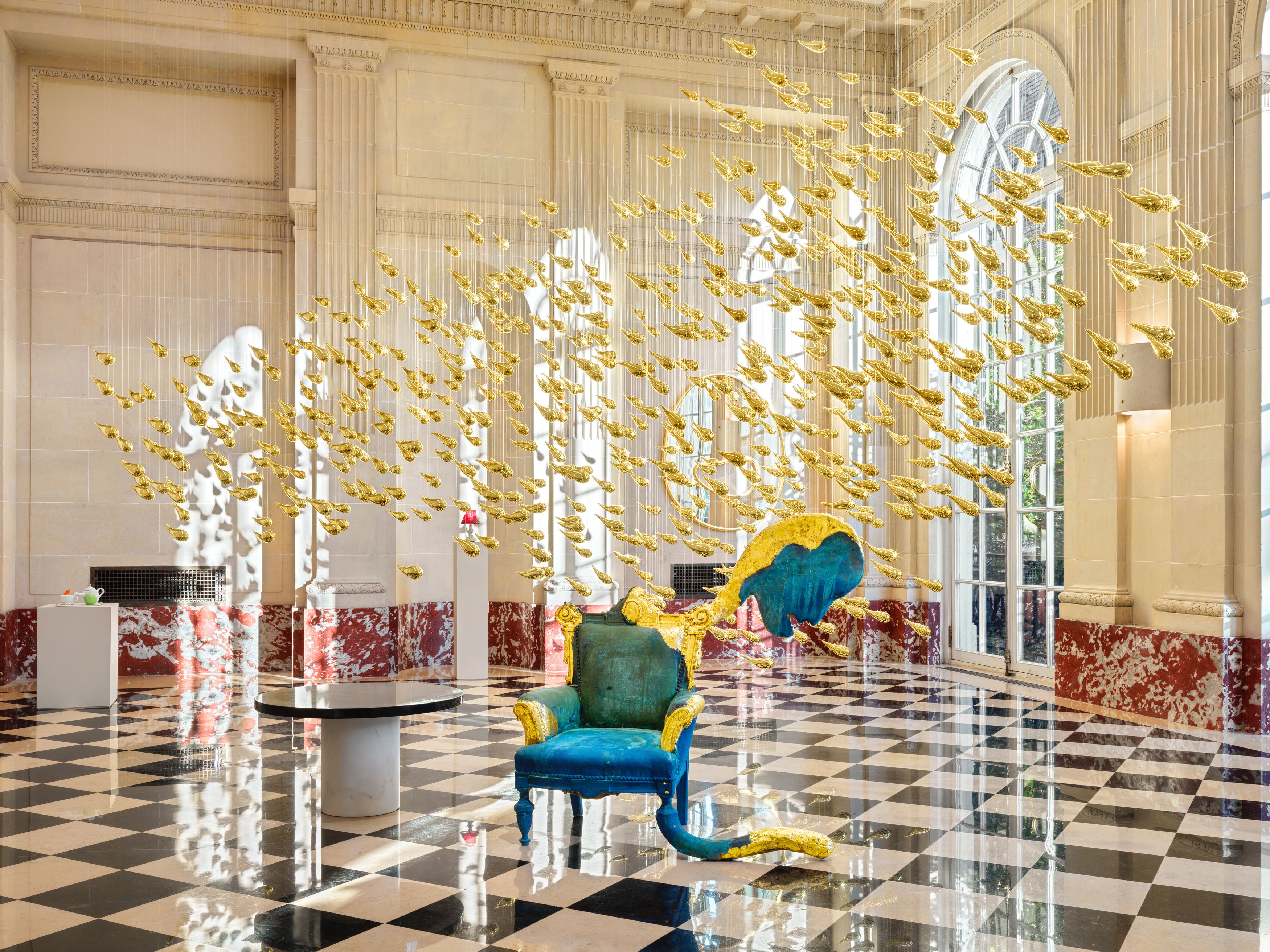 Whether legible at first glance or not, a coherent vision emerges— perhaps it'll hit you beneath a golden curtain of rain (a deluge of suspended glass drops, hand-blown in Venice). In Fischer’s world, the illogical is persuasive and function is an emergent property of poetry that leads into a series of encounters with far-fetched propositions that you inexplicably find yourself agreeing with.