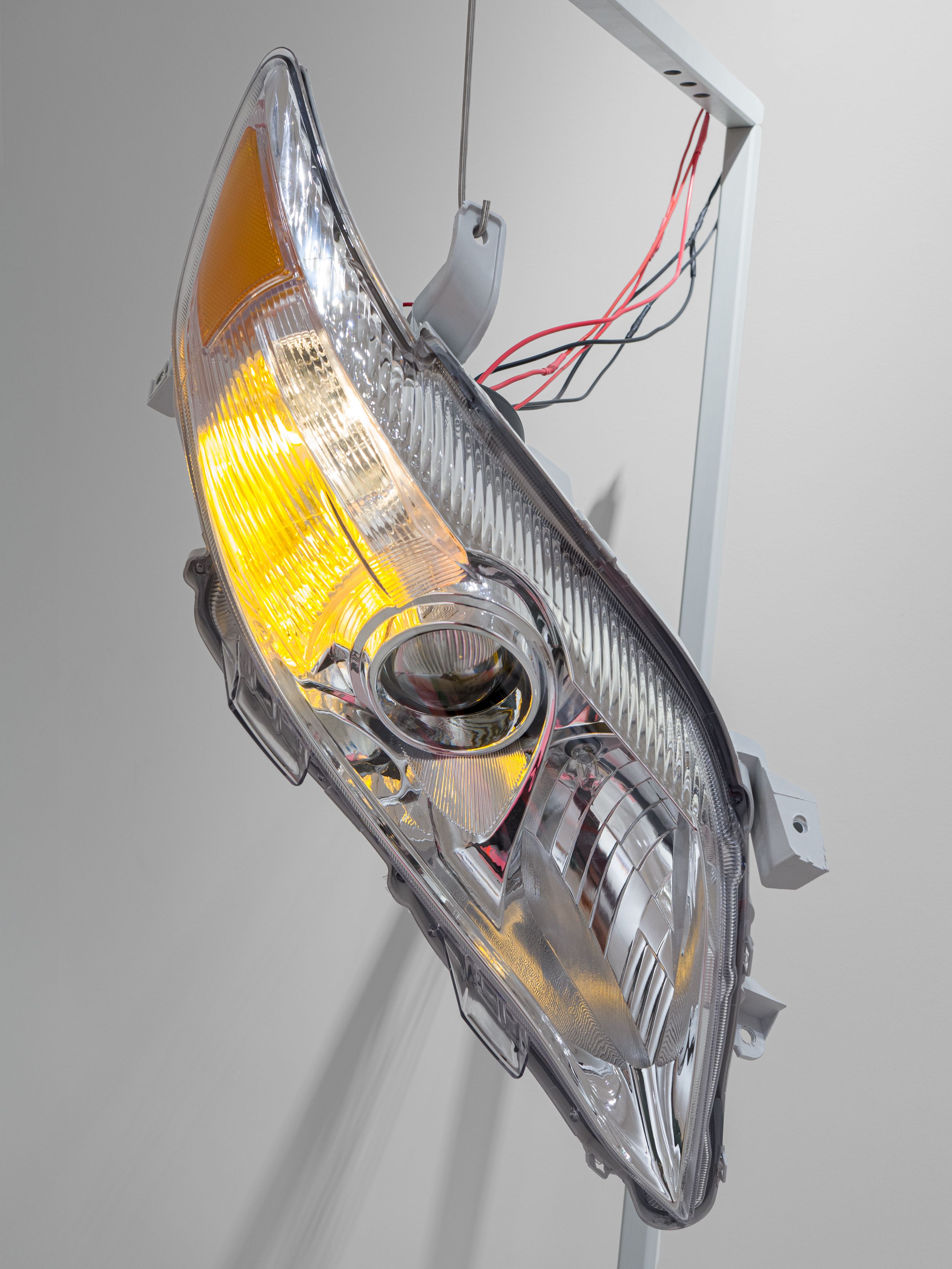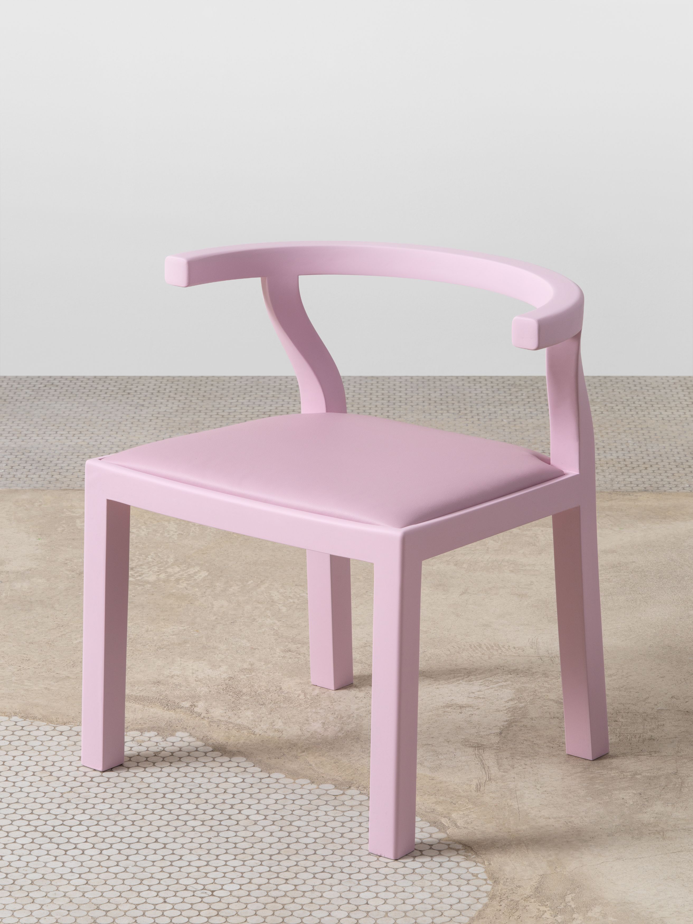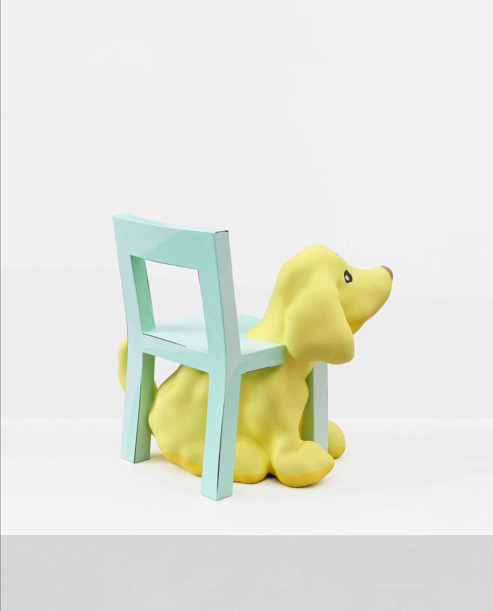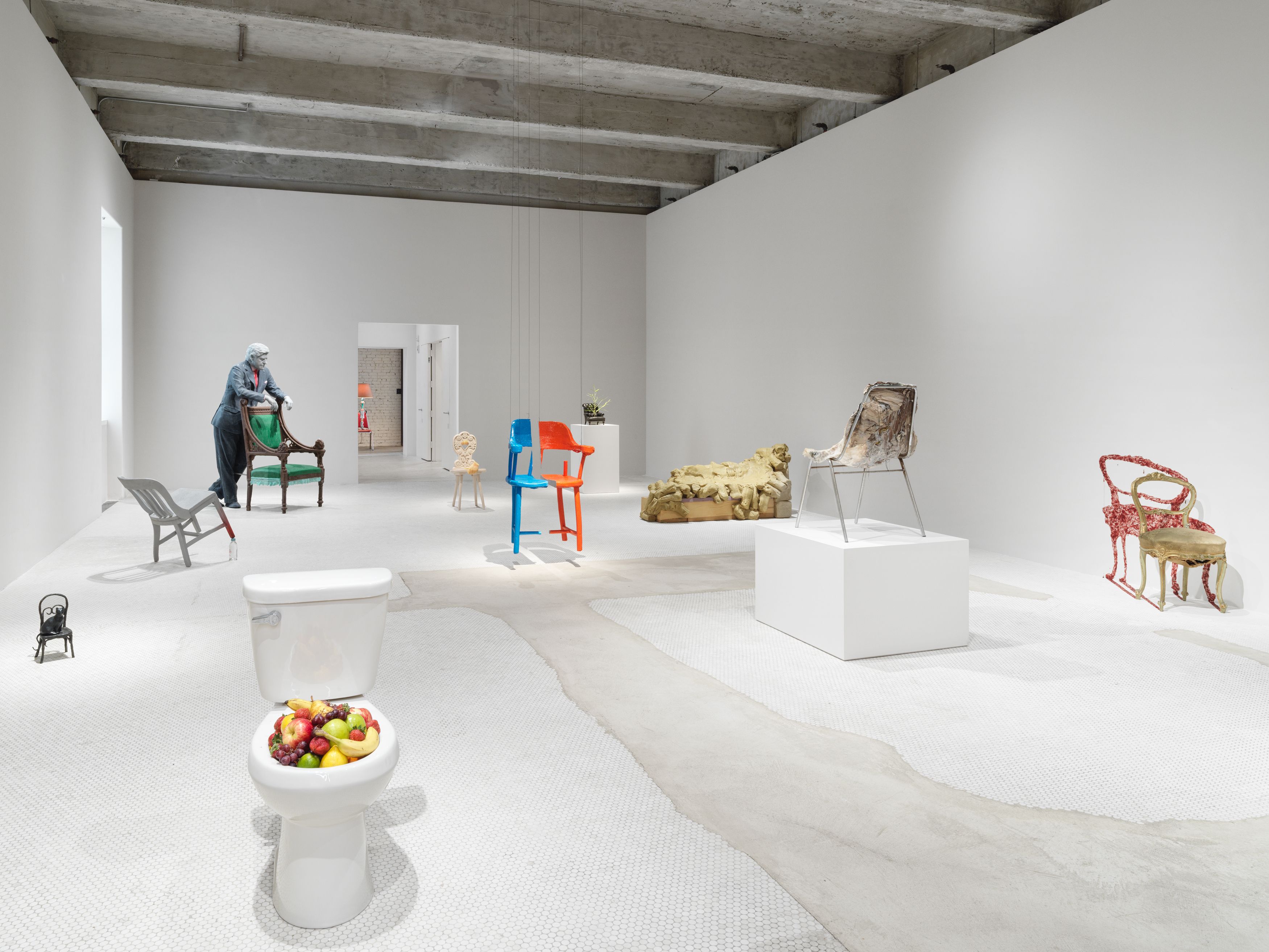 Occupying the gallery’s first two floors, Shucks & Aww debuts functional objects—seating, lighting, and other domestic forms—infused with humor, visual wit, and exacting craftsmanship that elevates the banal into the exceptional. The first floor acts as a retrospective survey, tracing Fischer’s evolution toward design. Works therein serve as stepping stones: a filigreed white chair clasped by two disembodied hands becomes both furniture and absurdist sculpture. When context and function meet, a dual identity as both practical furniture and provocative art object emerges. It’s a callback to works like his 1994 piece Untitled (Chair for a Table That Was Too Tall), comprised of a folding chair, tape, wood, foam, vinyl, and screws; it’s a perfect example of a sculptural “solution” to functional problem. It’s design as problem-solving through art.