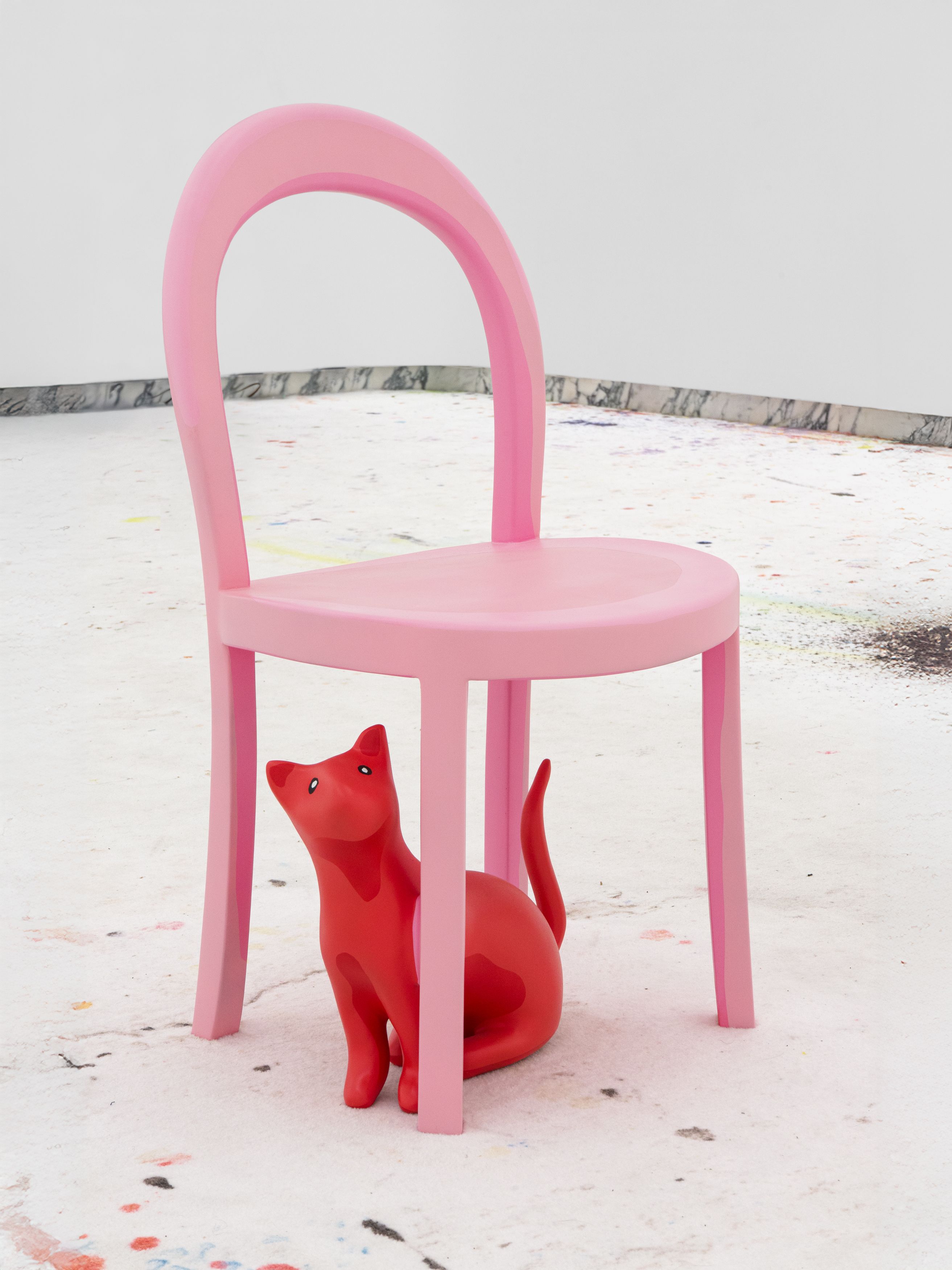 Throughout the exhibition, Fischer’s imagined cats prowl— perched beneath chairs or atop stop signs, as though stalking a bronze bird that doubles as a light switch. Upstairs, pillows pile into sofas, and lamps double as sculptures, and a curtain of golden rain sets the mood. A wooden chair turns out to be hand-cast bronze; another shelters a shy puppy. No object is quite what it appears to be, as the unexpected use of each material augments the intimate nature of our relationship with the objects in our everyday life.