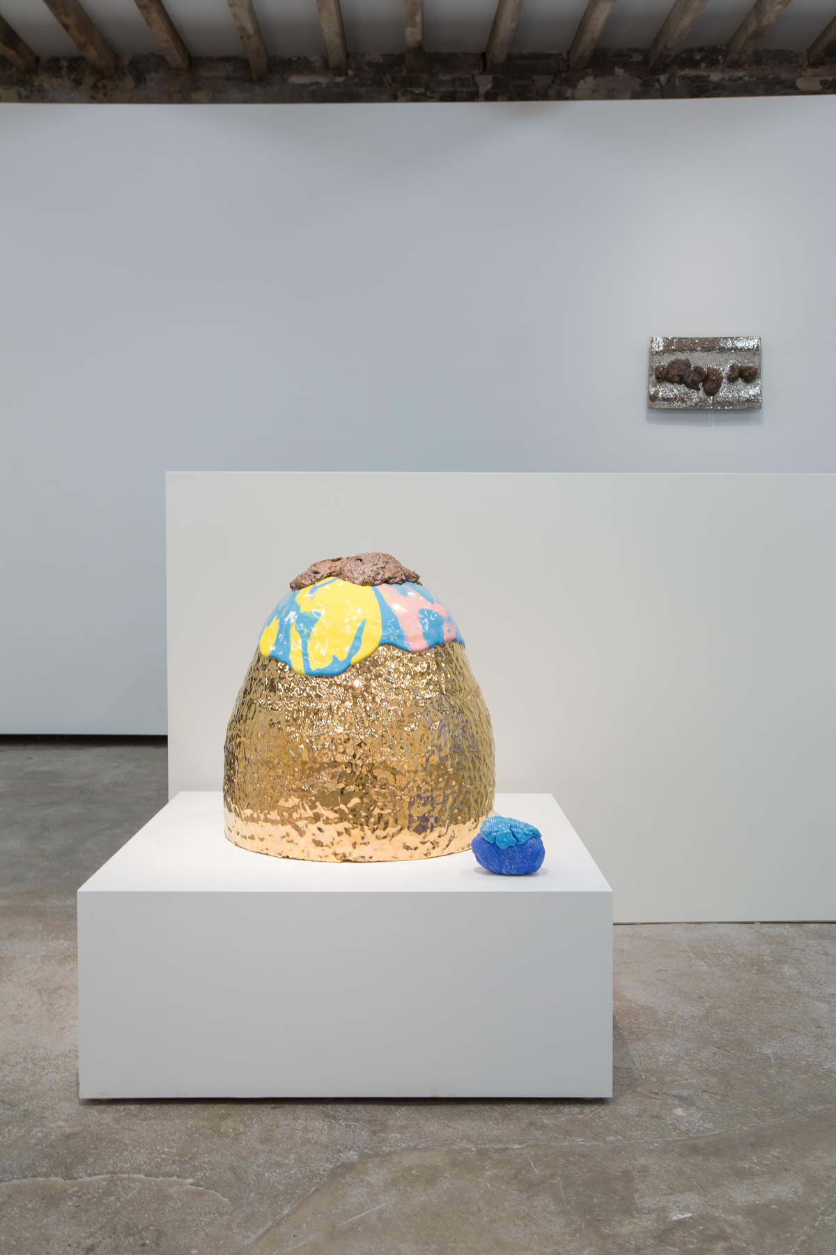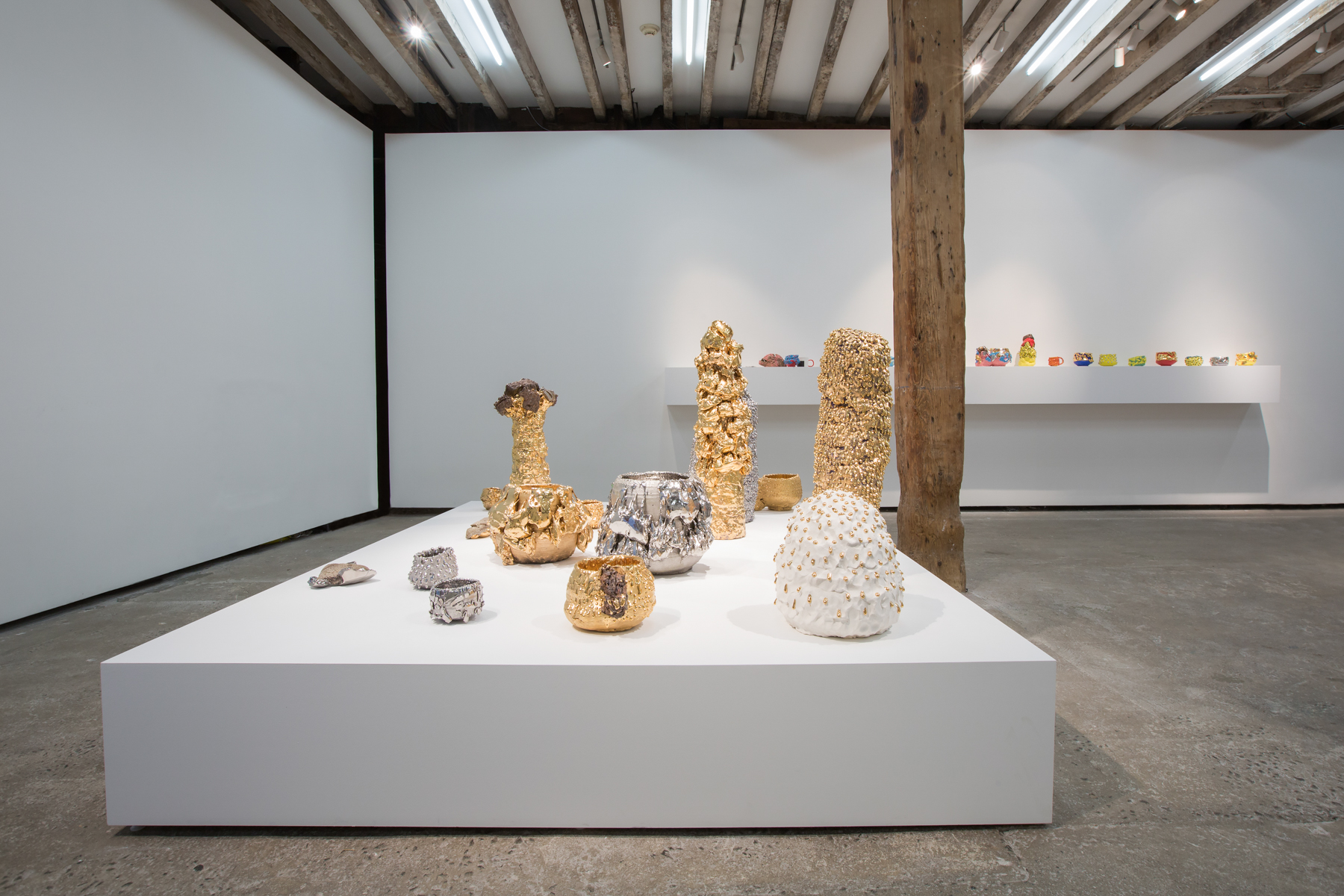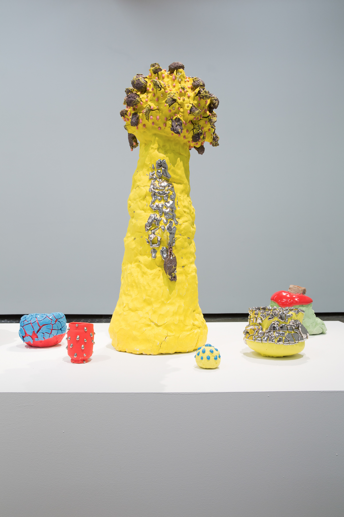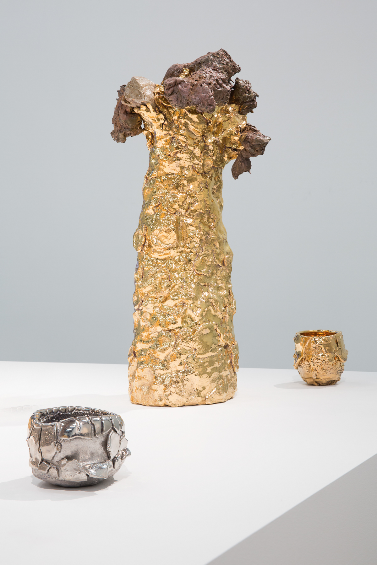 Kuwata mixes an artificial palette of glazes with that of natural elements, presenting monumental and intimate objects. Polychromatic vessels, otherworldly mushrooming clouds, gold and silver totems and bulbous fruit like shapes people his landscapes in clay. Here, function follows form, science meets chance, and the crude and delicate coalesce.