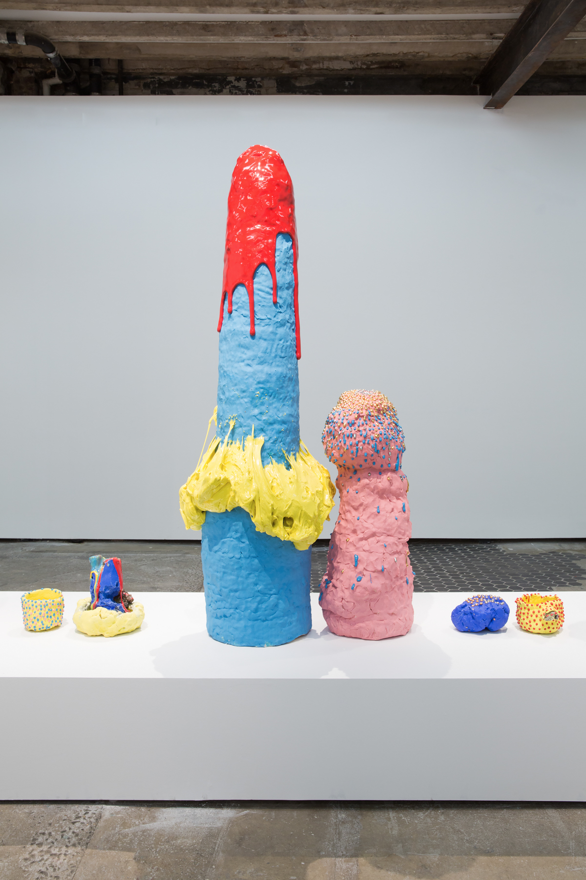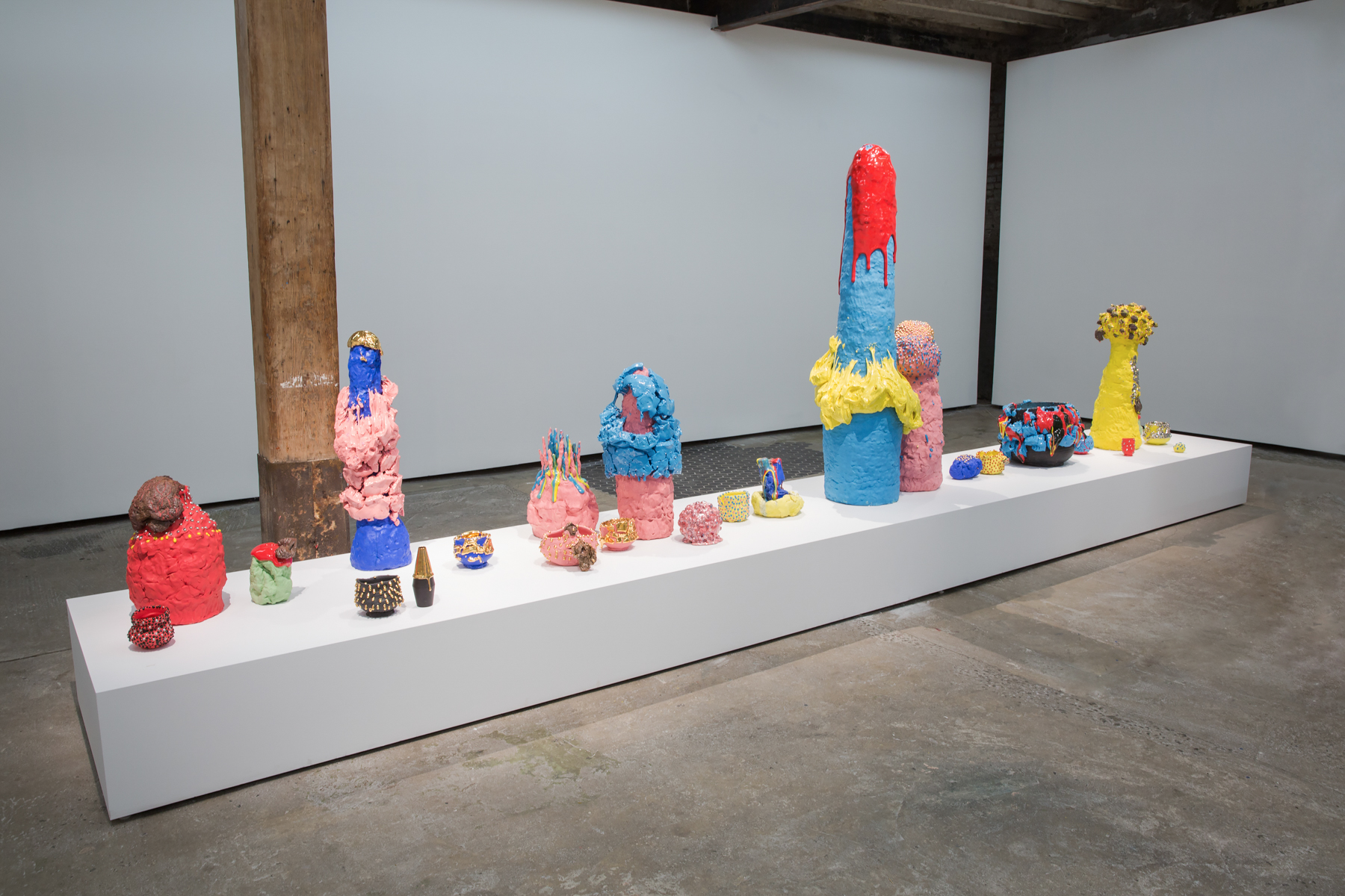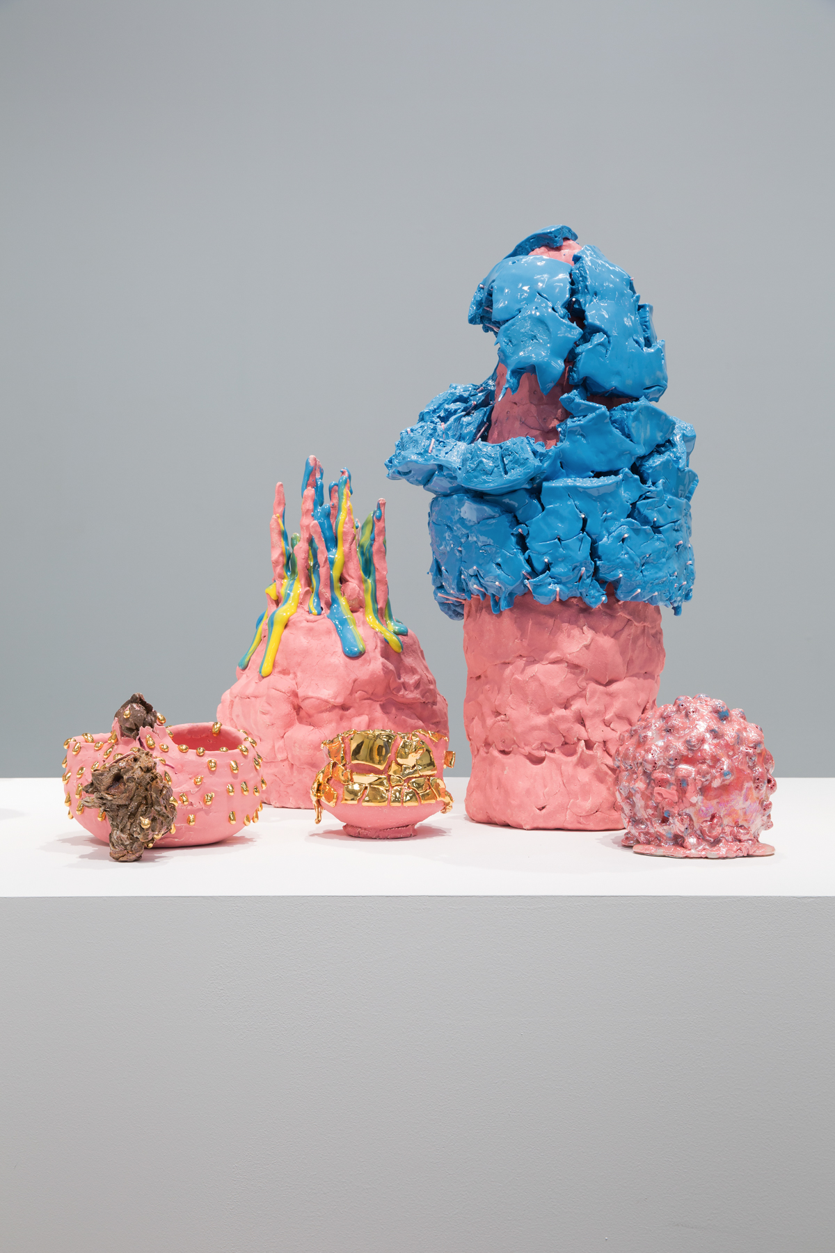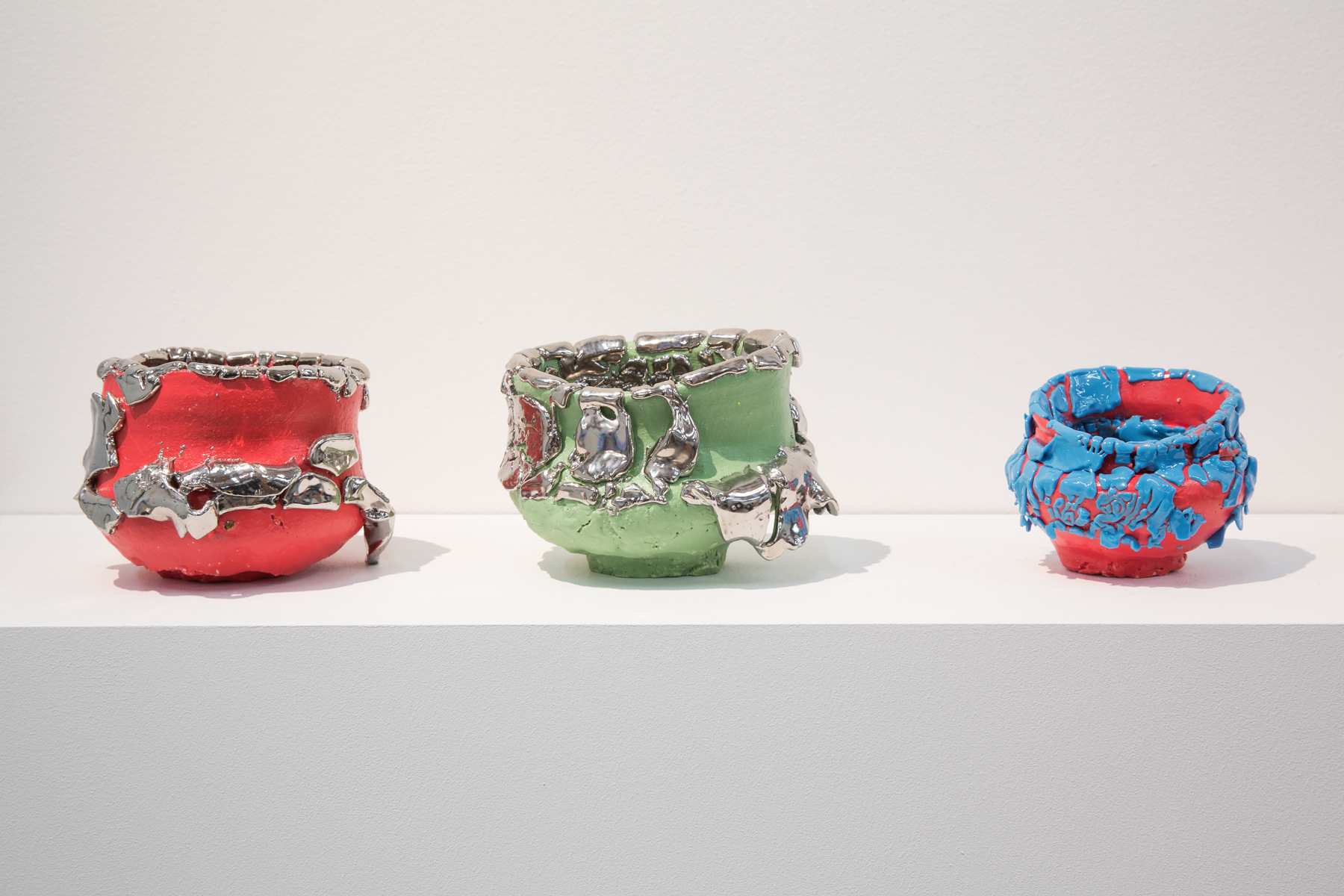 Kuwata mixes an artificial palette of glazes with that of natural elements, presenting monumental and intimate objects. Polychromatic vessels, otherworldly mushrooming clouds, gold and silver totems and bulbous fruit like shapes people his landscapes in clay. Here, function follows form, science meets chance, and the crude and delicate coalesce.