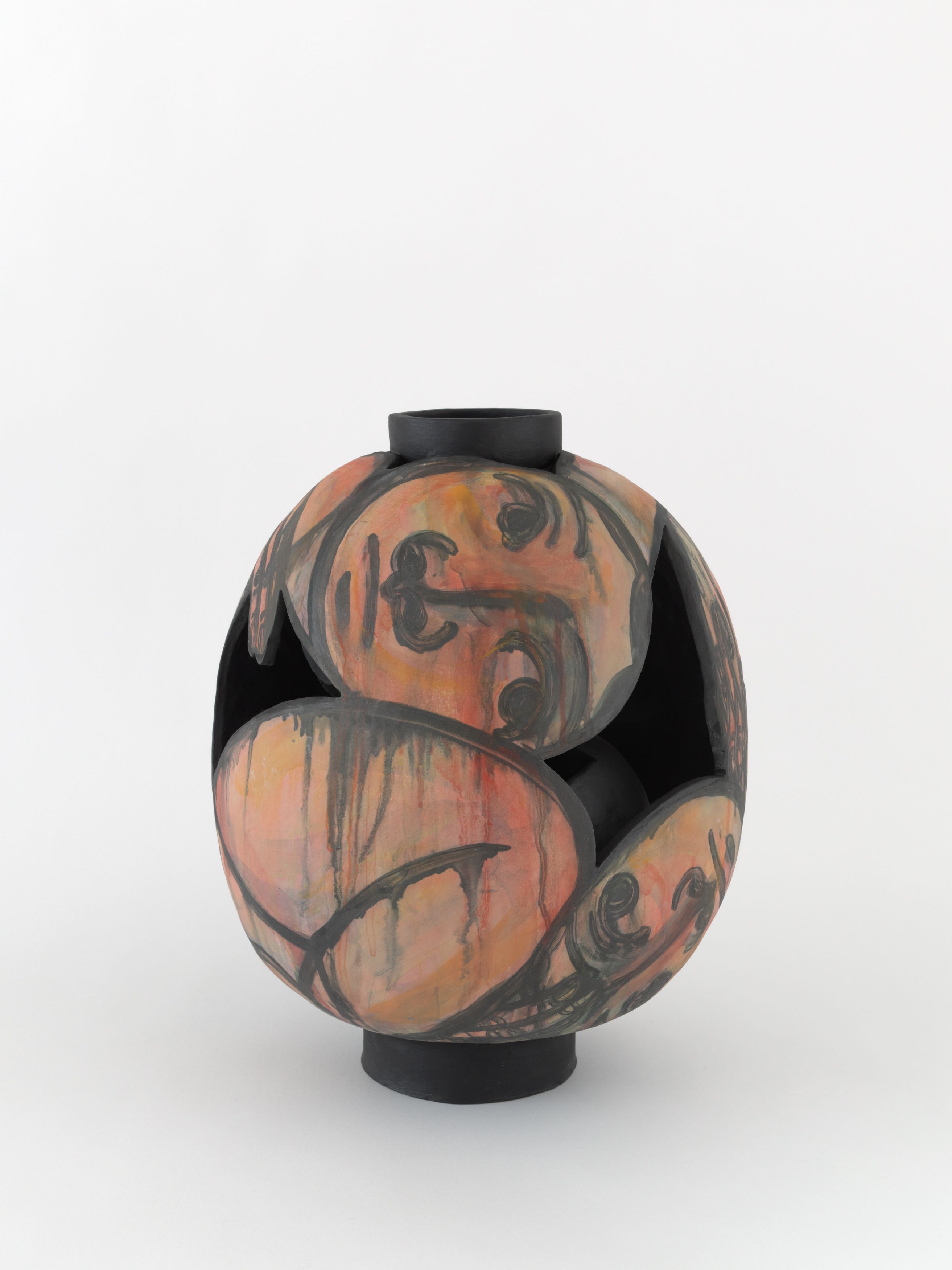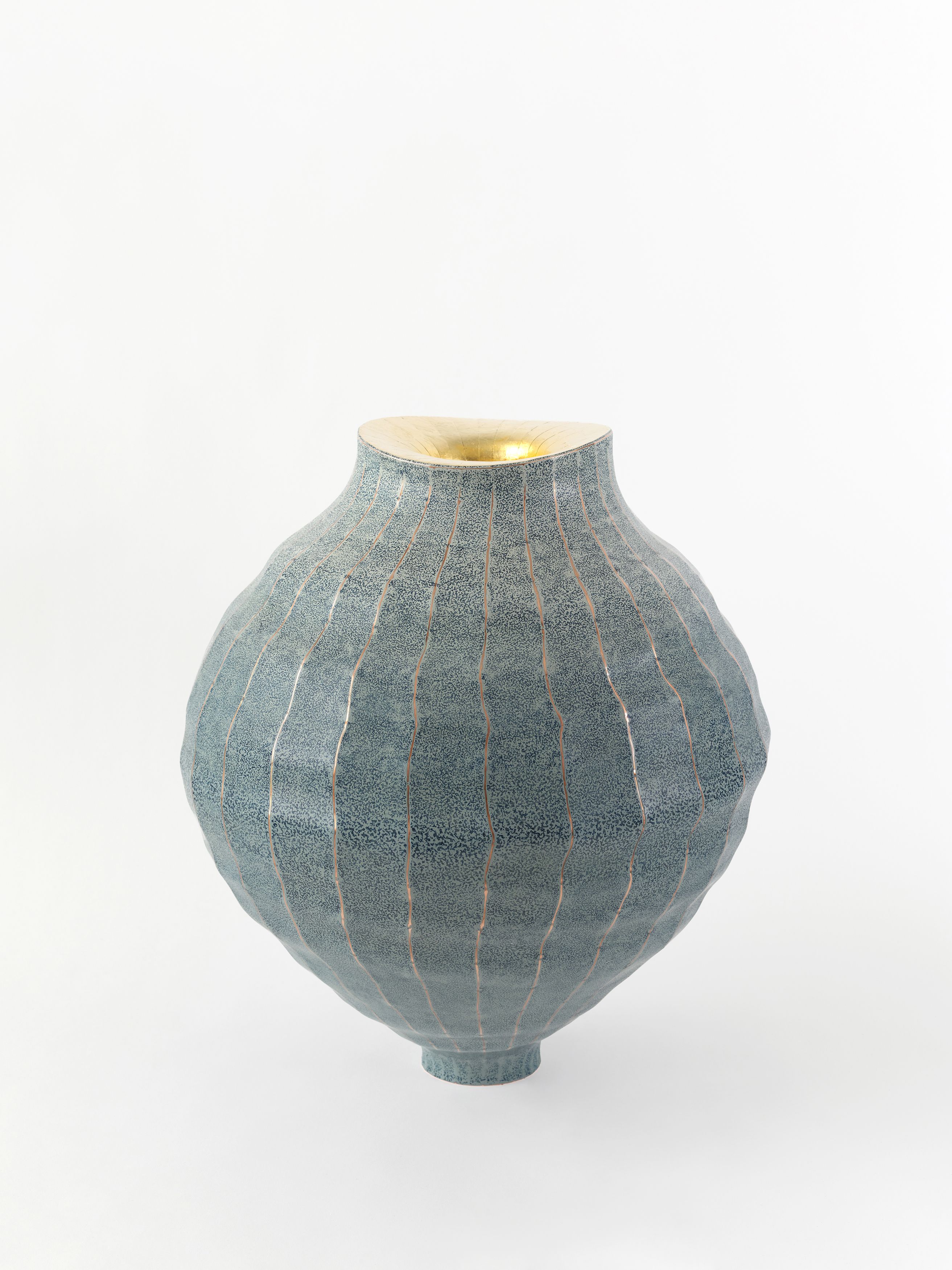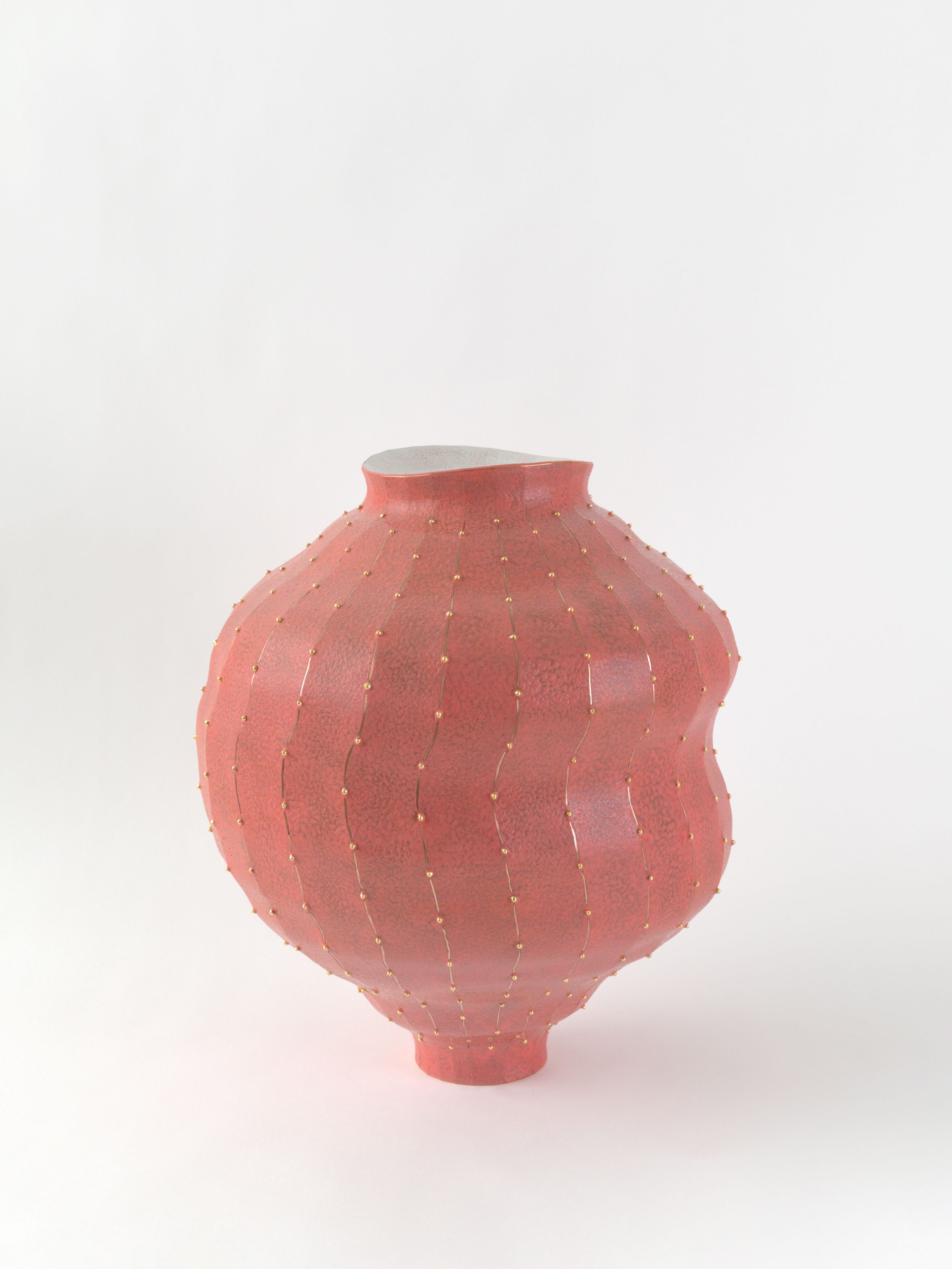 Inspired by the phrase “해를 품은 달” (The Moon Embracing the Sun), Soojin Choi’s Moon Jars, Full Moon Eclipse and Red Moon Eclipse, explore the nuanced interplay of light and shadow - introducing figuration and cutouts to the traditional form. Similar to the moon embracing the sun in an eclipse, these works delve into the delicate equilibrium between light and dark, presenting a visual narrative of human emotions within the celestial embrace of time and circumstances. Jay Sae Jung Oh, Jaiik Lee, Kwangho Lee, and Minjae Kim’s Moon Jars deviate radically from the traditional porcelain craft with the use of innovative materials and techniques. Jaiik Lee’s Transition Cora and Transition Stratus, take inspiration from the variation and imperfections present in the Moon Jars’ assembled hemispheres: each vessel is made of several meticulous cuts of copper, the seams of each vessel are accentuated with visible welding points, then meticulously painted, sanded, and fired with layers of deep porcelain color and gold leaf.