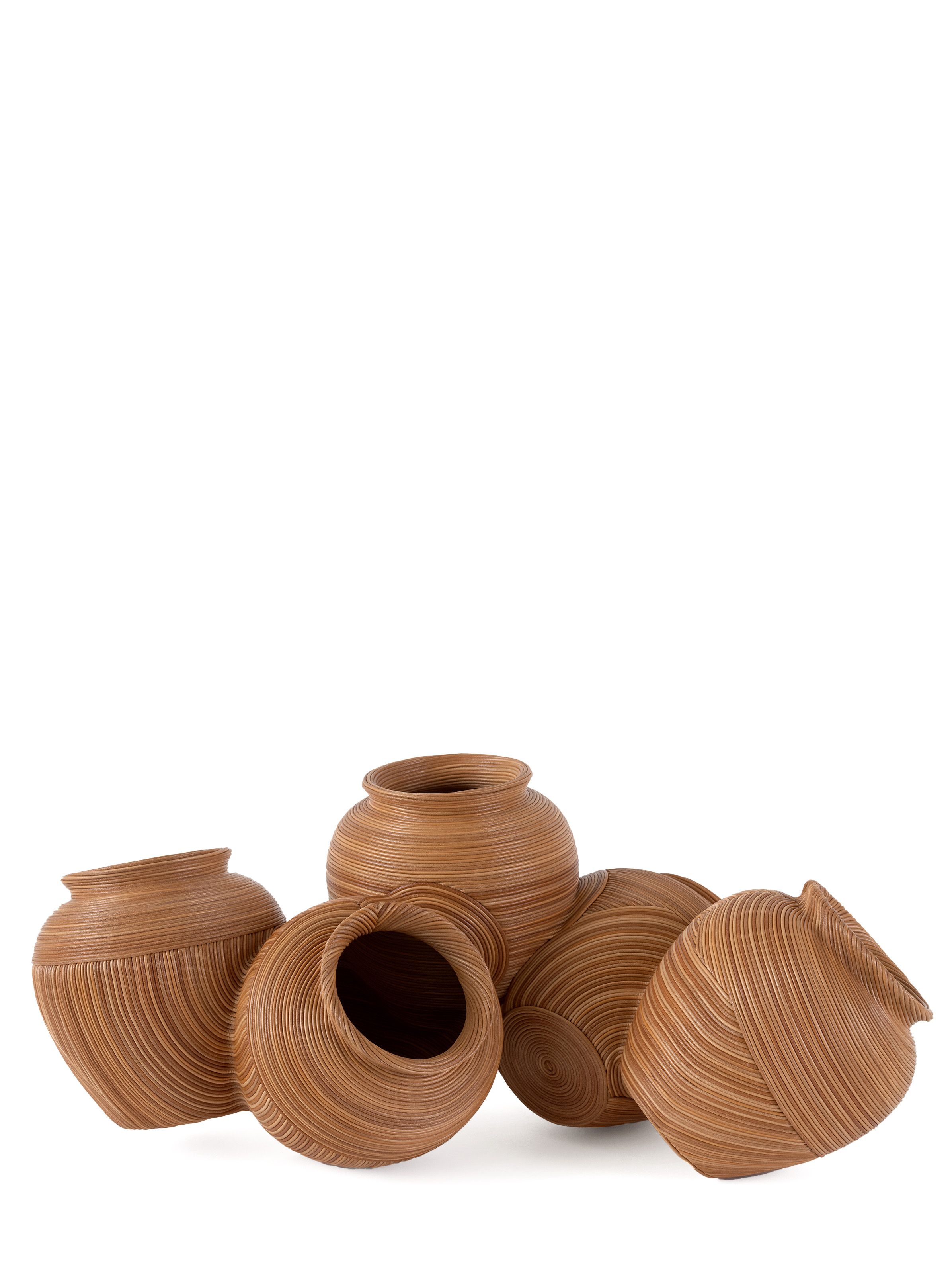 Kwangho Lee’s Moon Jars introduce 3D printing technologies to achievean intricate woven surface impossible to achieve by the human hand with ceramic. They honor the moon-like form, while pushing the medium to new limits as contemporary processes catch up to aesthetic innovation.