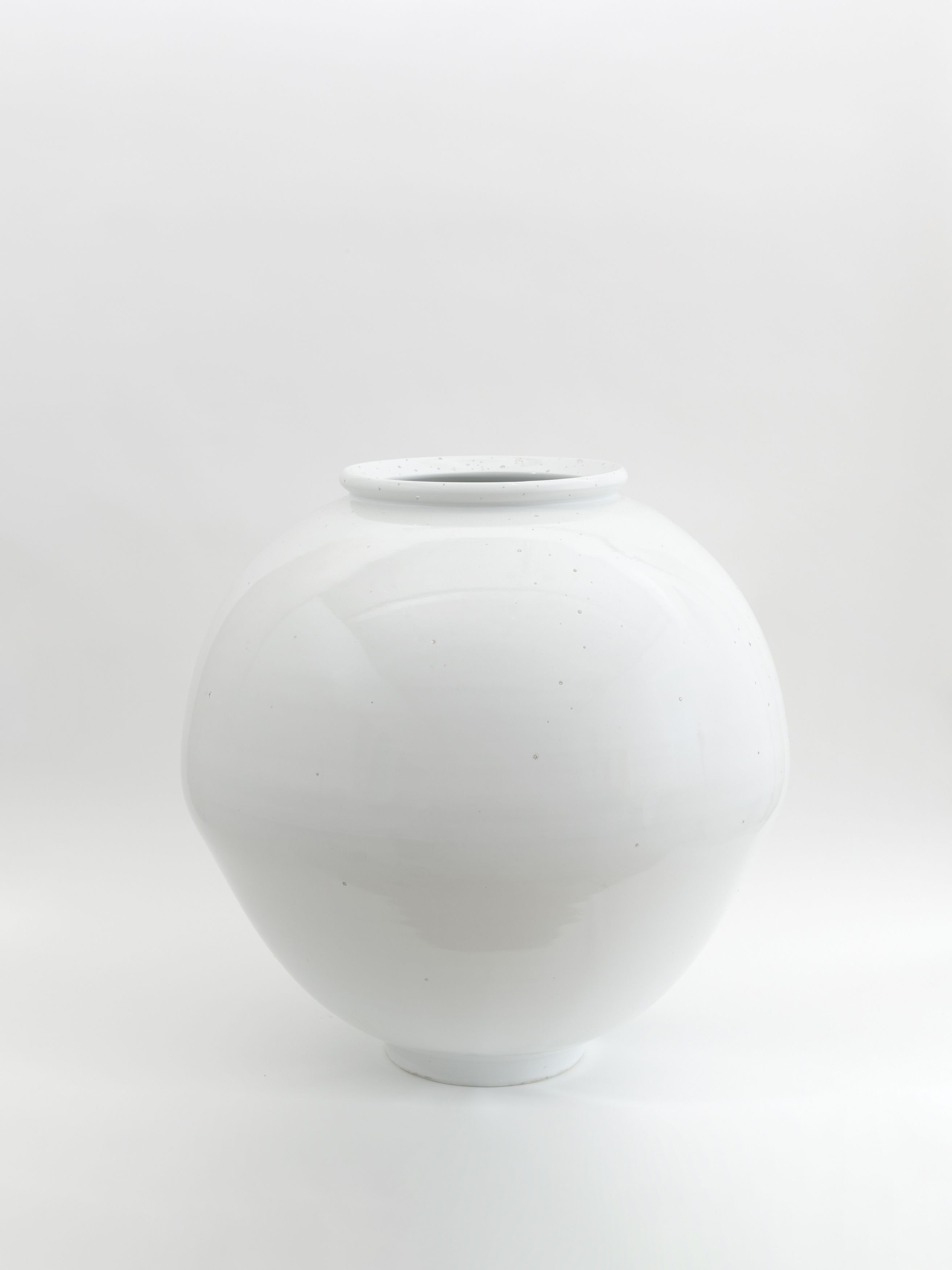 Originating in Korea during the Joseon Dynasty (1392-1910), the traditional Moon Jar’s formal qualities stem from utilitarian beginnings. Sculpted by conjoining two wheel spun porcelain hemispheres, the seam between them smoothed to a faint yet visible meridian, the unadorned white forms were first used for storage or flowers. In the 18th Century, a time when the country’s neo-Confucian ideals inspired an aesthetic preference for austerity and understated elegance, Moon Jars evolved into highly coveted ritual and votive vessels. They were prized for their near-perfect form and milky white glaze resembling the moon in both aesthetic and spirit.