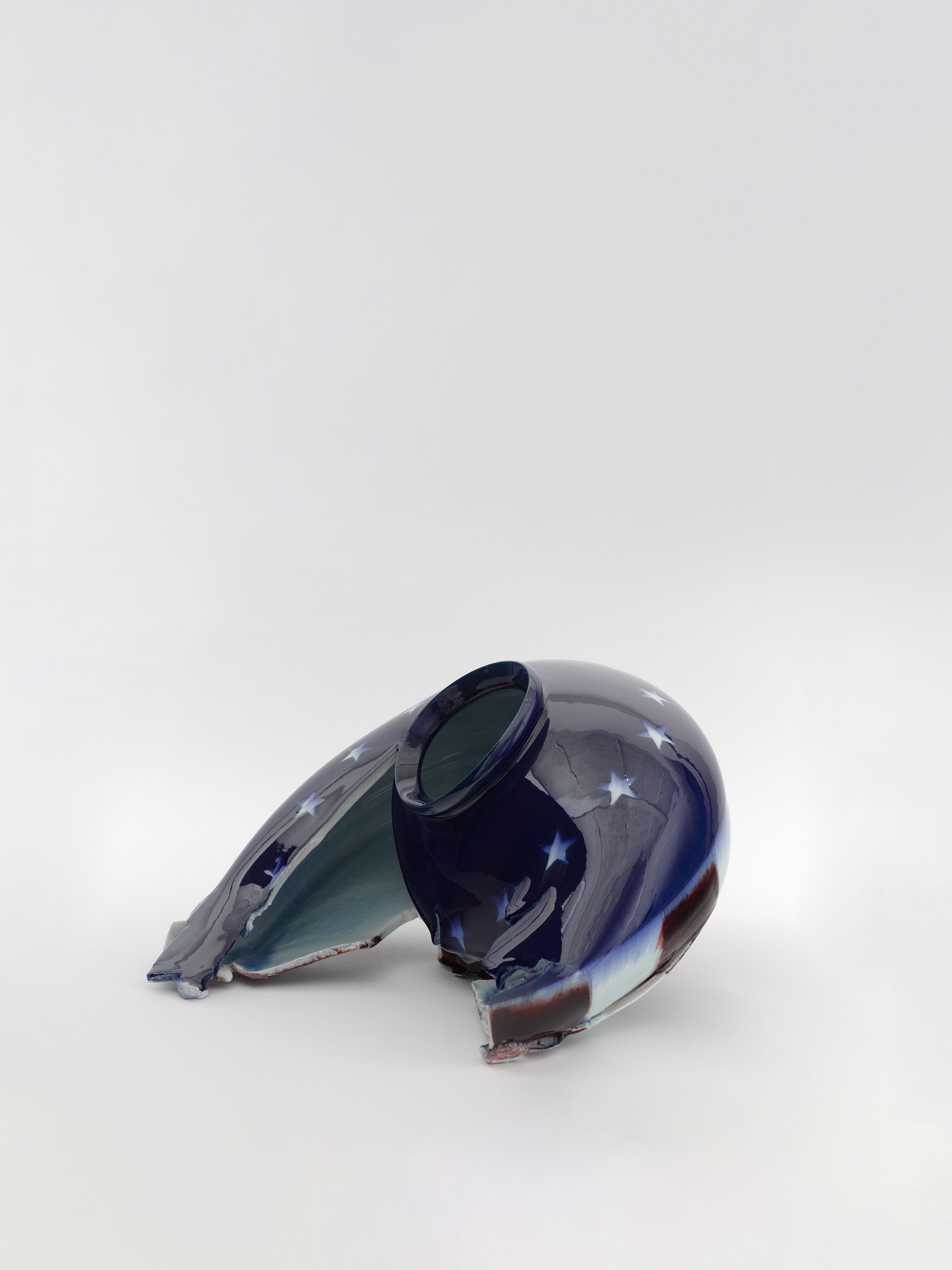 Steven Young Lee’s Old Glory, represents a ruptured sense of personal Korean American identity—the traditional vessel form is punctured before firing and adorned with a glossy red, white, and blue American flag. As resident artist director of the Archie Bray Foundation for the Ceramic Arts in Helena, Montana, his practice is heavily rooted in the history of porcelain yet he uses deconstruction and imperfection to create objects that offer “harmony through dissonance”—a concept highly sought after in the simple elegance and imperfections of the traditional Moon Jar. Young Sook Park partnered with jeweler Charles de Viel Castel to create the Uju Vessel, a porcelain Moon Jar inlaid with a constellation of over 30 carats of precious diamonds. Showcasing the traditional Korean porcelain techniques for which Park is internationally renowned, and her deep appreciation for the history of the craft, the Uju Vessel pushes the limitations of the delicate material and submits the form to new forces when drilling and inlaying each diamond by hand. The result is a convergence of trust, vision, and tension, built on mutual admiration and reverence for the integrity of clay and stone.