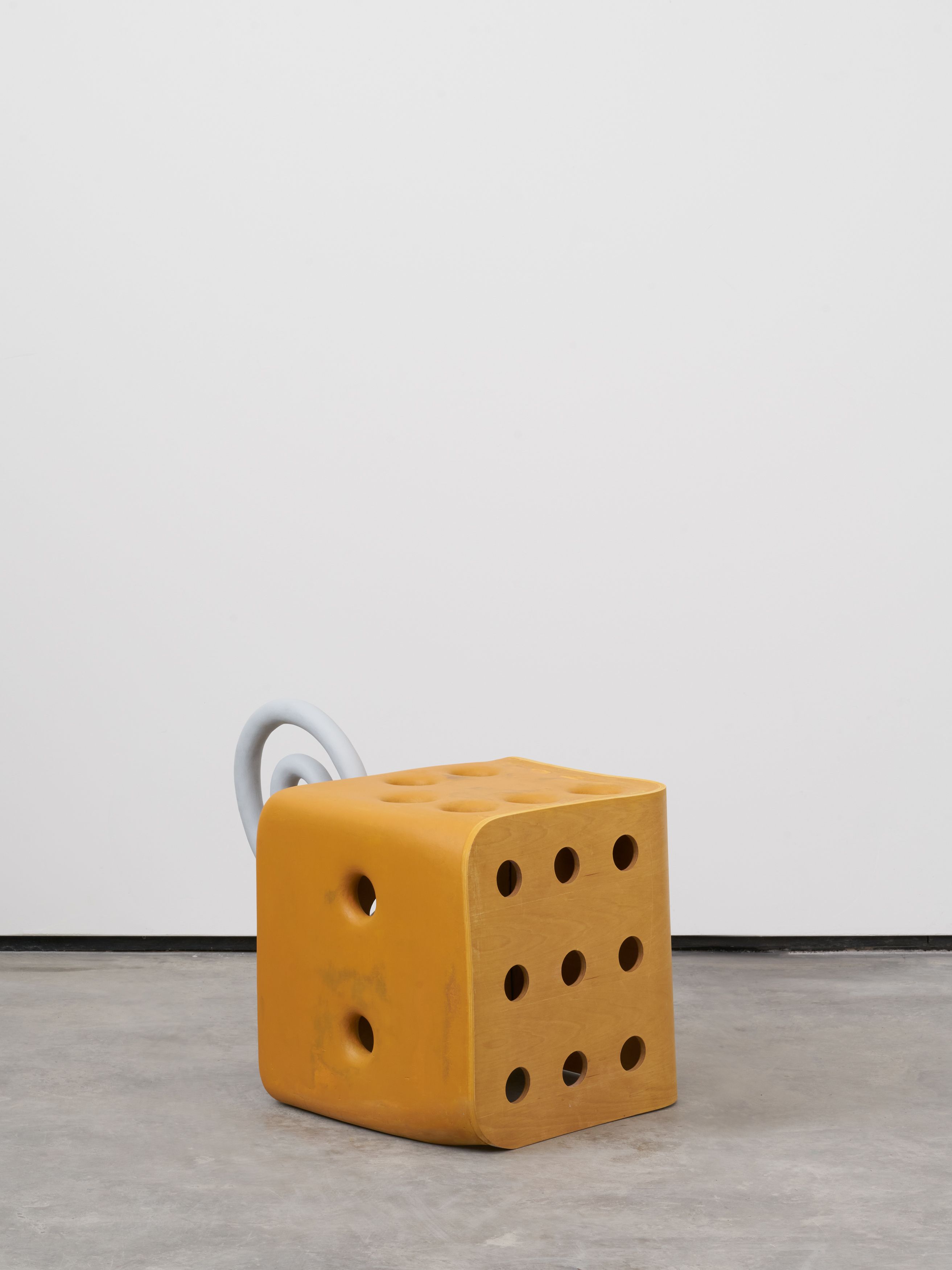 The Big Ole Gray Table has a spiral inclusion, like a mouse tail, that protrudes from beneath its tabletop, giving the work a rodent-like compactness. A cubic sculpture, perforated like swiss cheese and bearing the same spiraling tail, perches nearby. The two works suggest another species of bottom dweller scurrying on concrete ground. Rodents, with their glistening flesh-stubs and scattered black droppings, are ripe with both phallic feelings and anal associations. The driving forces of an animal’s existence arises from love and hunger. Love and hunger, the same stuff we fill our human holes with, too. The same could be said of Barger’s functional artworks.