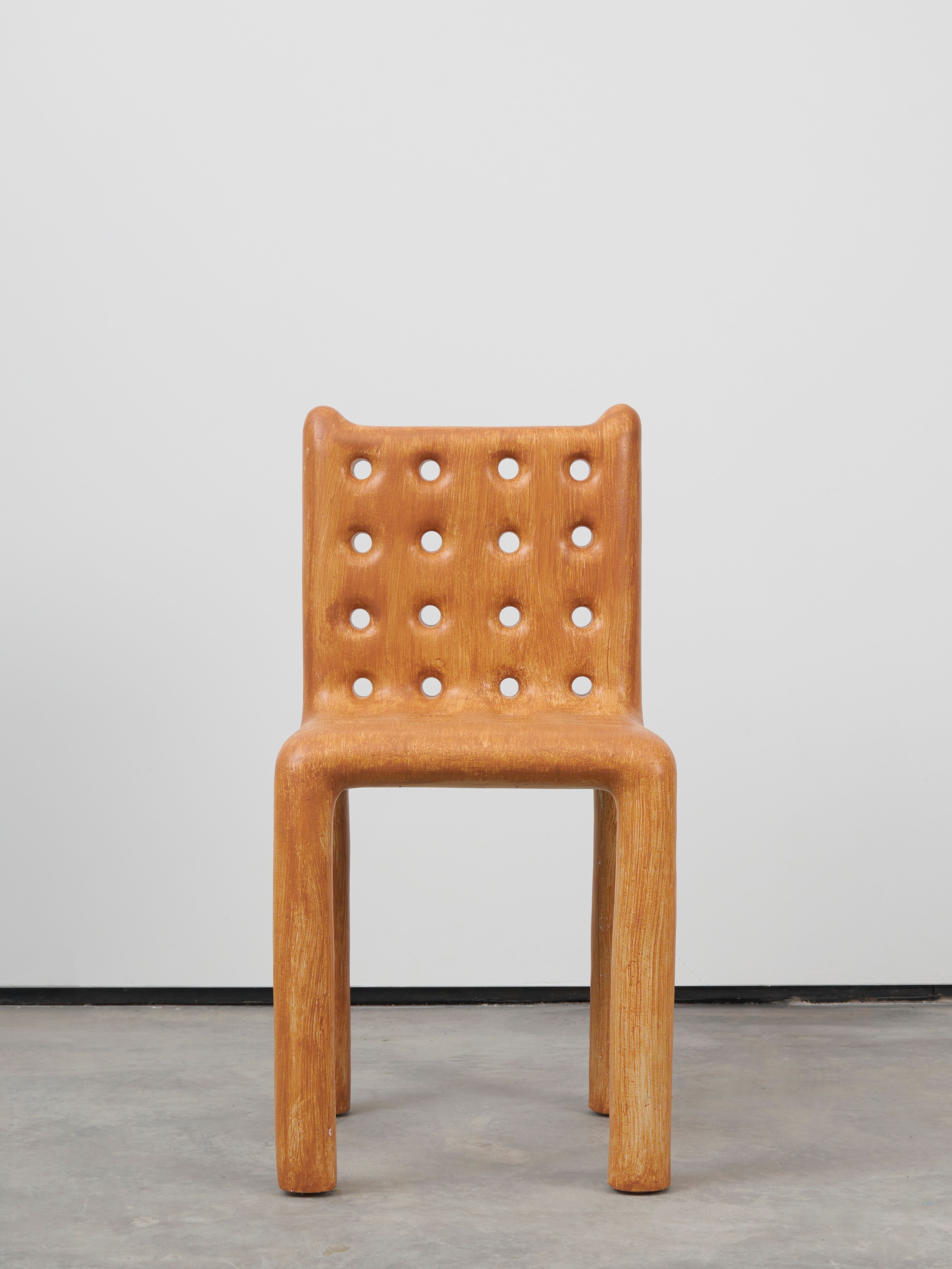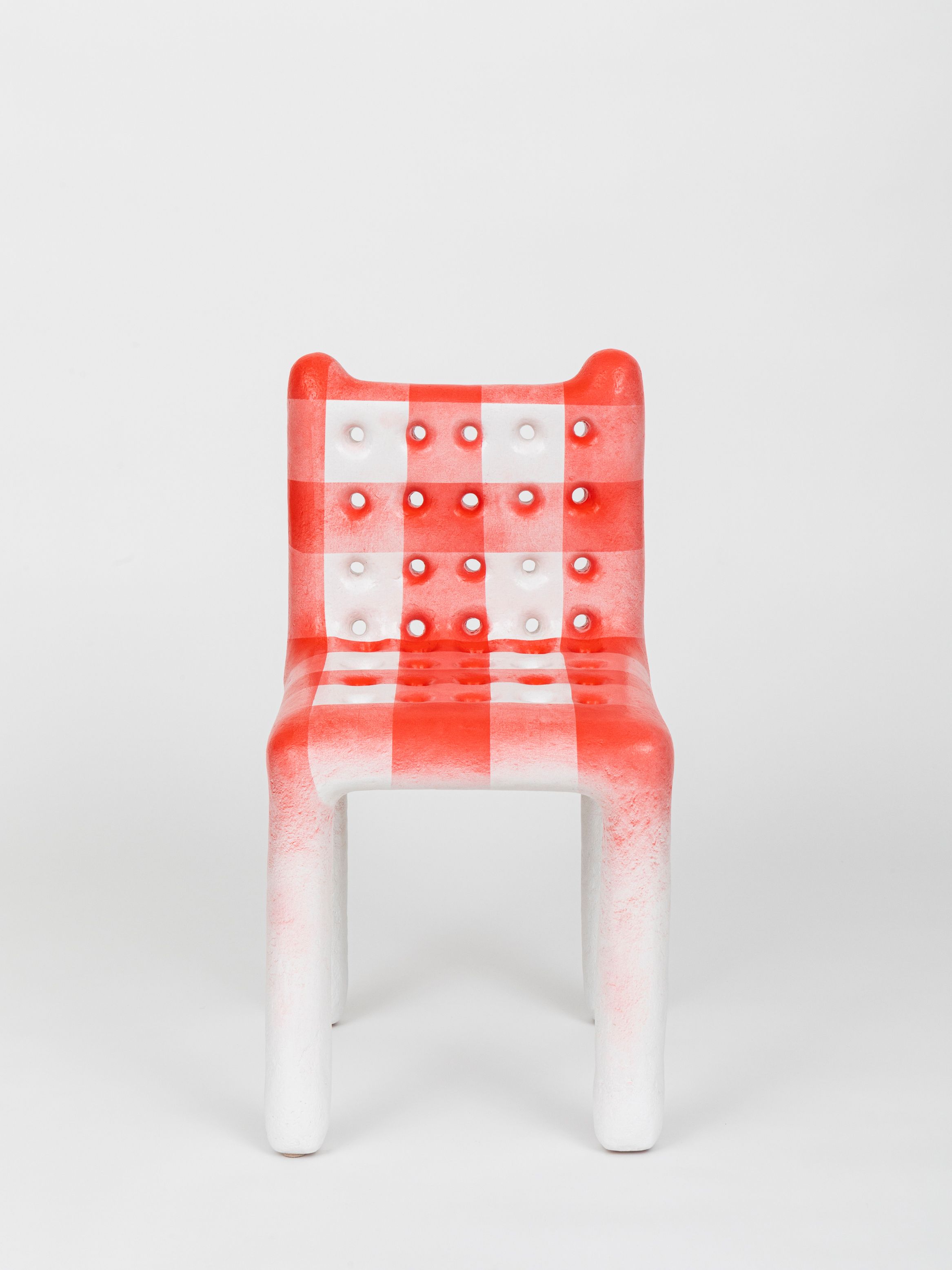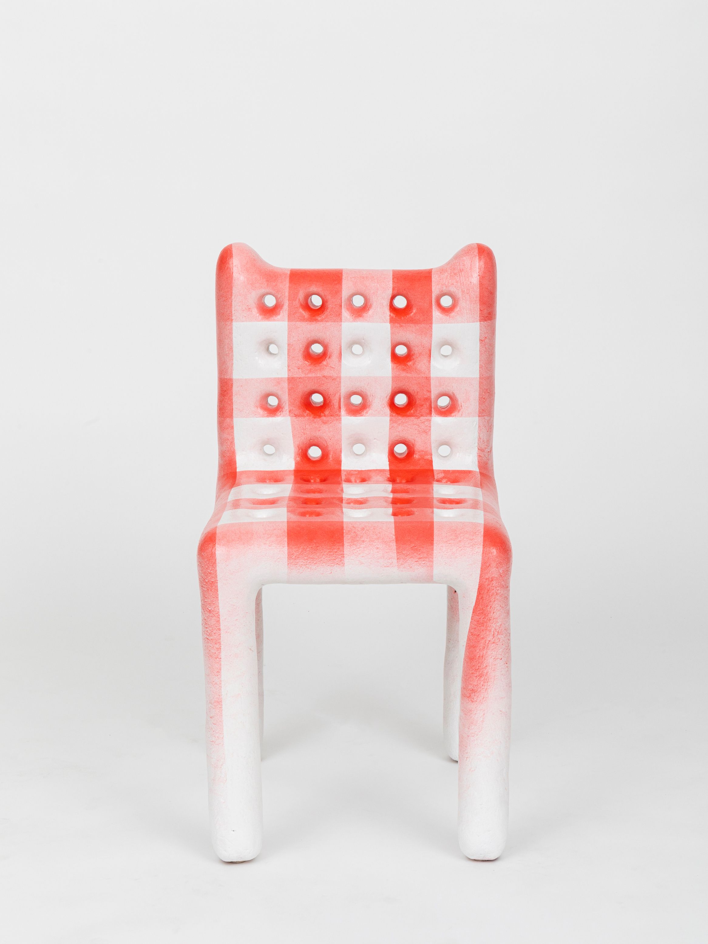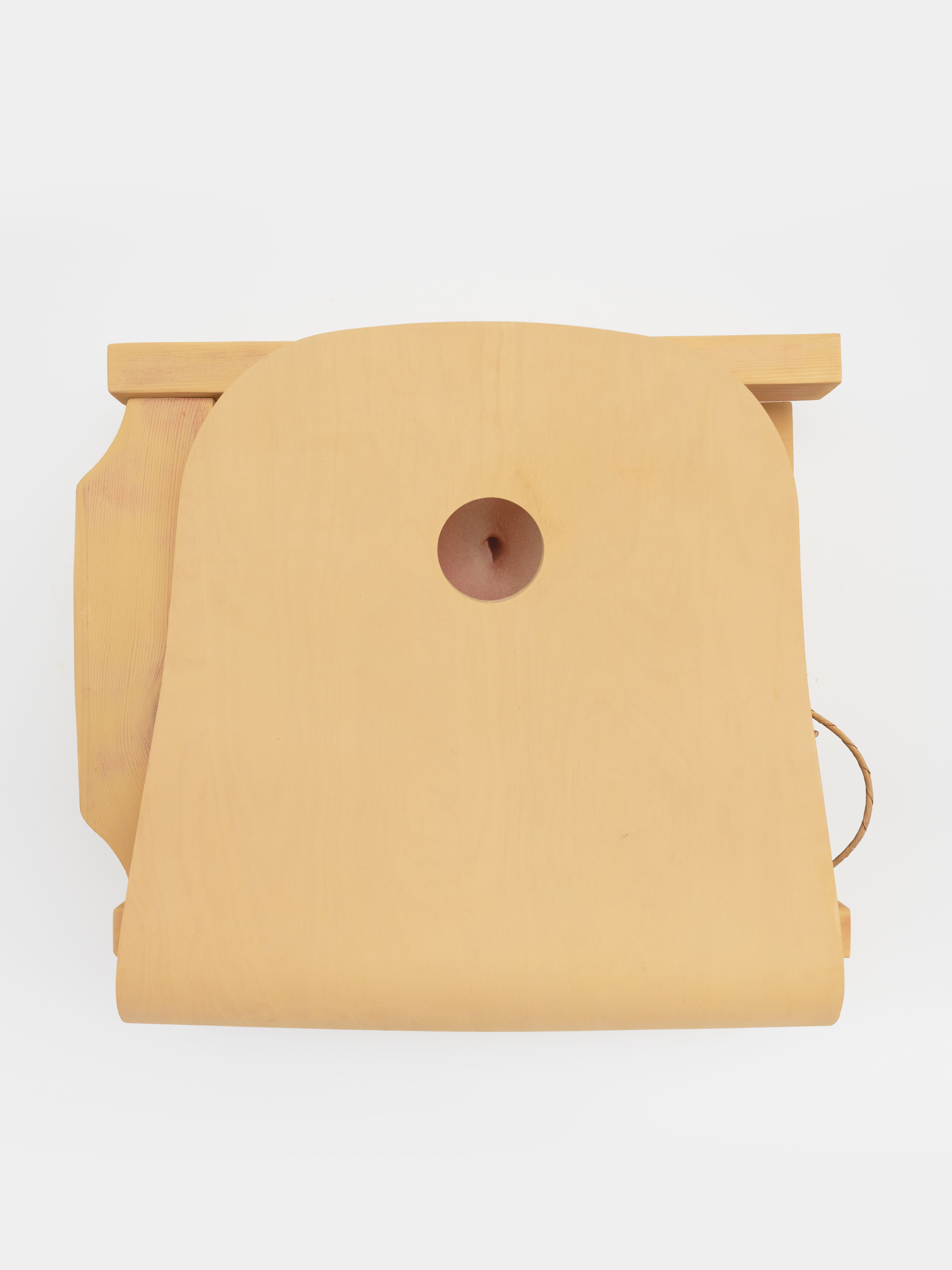 Thomas Barger likes to play with holes. Some holes come in rows on the backs and bottoms of his paper pulp, plywood, and polyurethane chairs. Other holes burrow neatly through coffee tables and shelf assemblages. Still others are spread high up to the pointed ends of his Tall Pulpit Chair. On a few occasions, the holes are heart-shaped cut-outs from found antique furniture. But mostly, they are exact circles, approximately 3 inches in diameter. They are ideal cavities to slide a few fingers through or, with a little patience and tenacity, a whole wrist. Pillories for our slippery hands and distracted appetites.